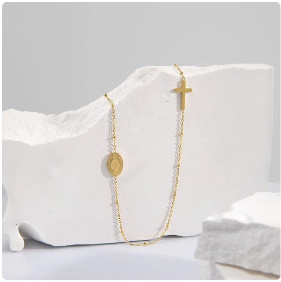 Lleva la poderosa protección de la Medalla Milagrosa y la fuerza de la cruz en un solo collar. Este accesorio de acero dorado, con su diseño ajustable, es un recordatorio de que siempre estás protegido por la gracia divina. Una joya que combina fe, estilo y significado.