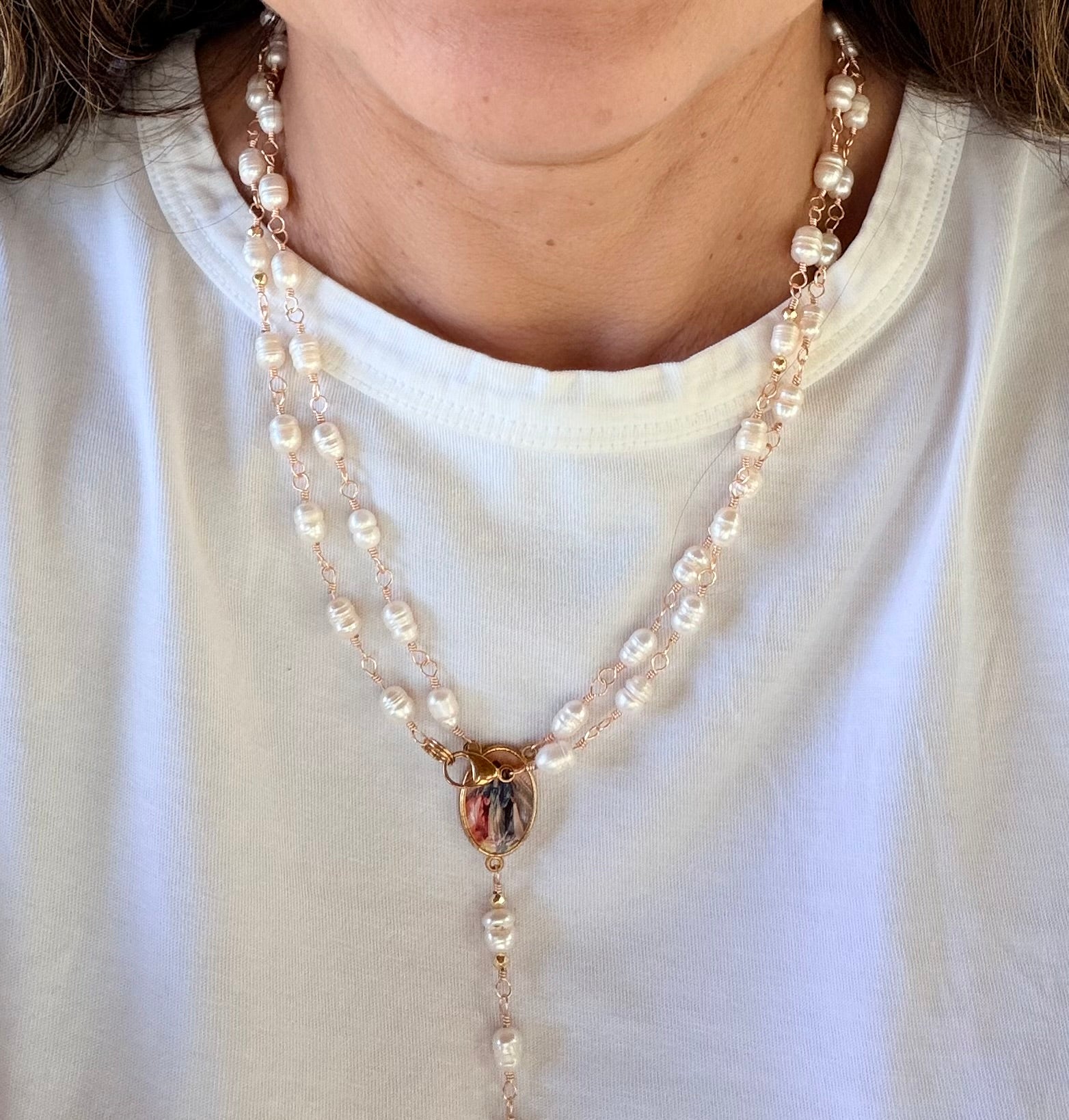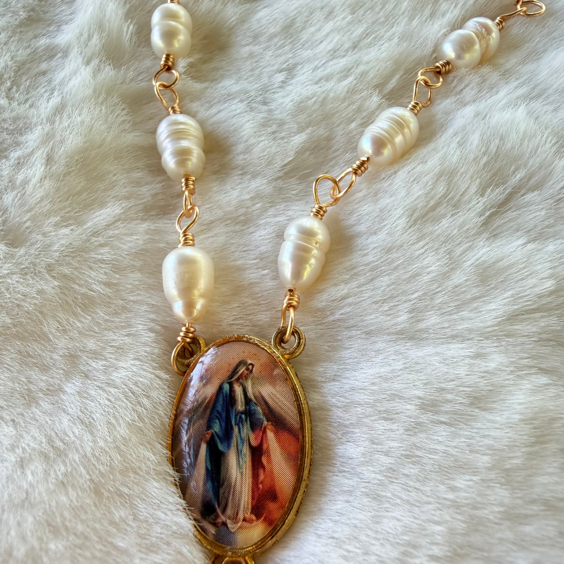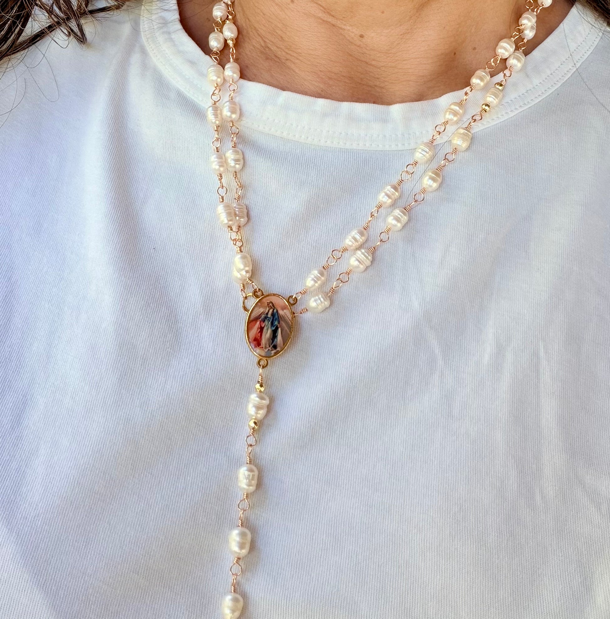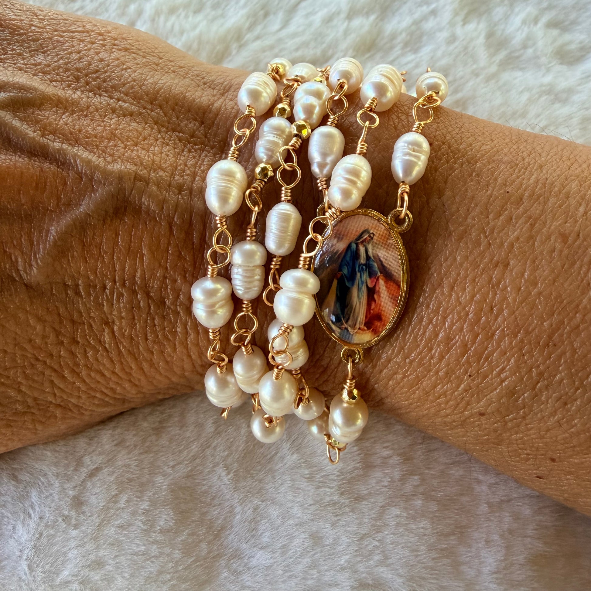 Rosario elaborado a mano, engarzado en alambre dorado de alta calidad, utilizando perlas de 6 mm que aportan un acabado fino, delicado y luminoso.