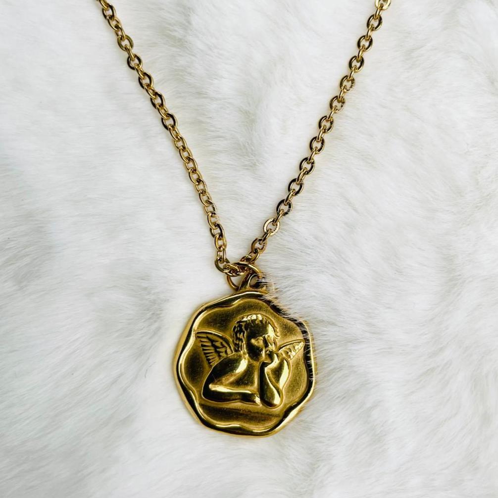A personal reminder of protection and guidance. This necklace, with 18k gold plating, features a delicate stainless steel medal with a little angel symbolizing care and faith. It's a meaningful accessory that gives you peace with every step you take.