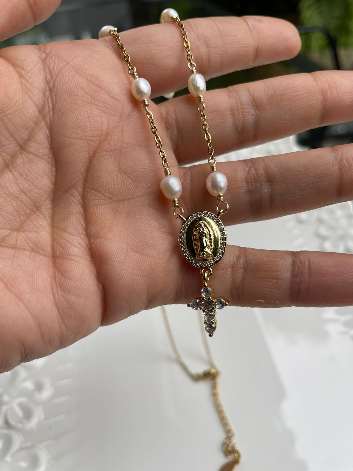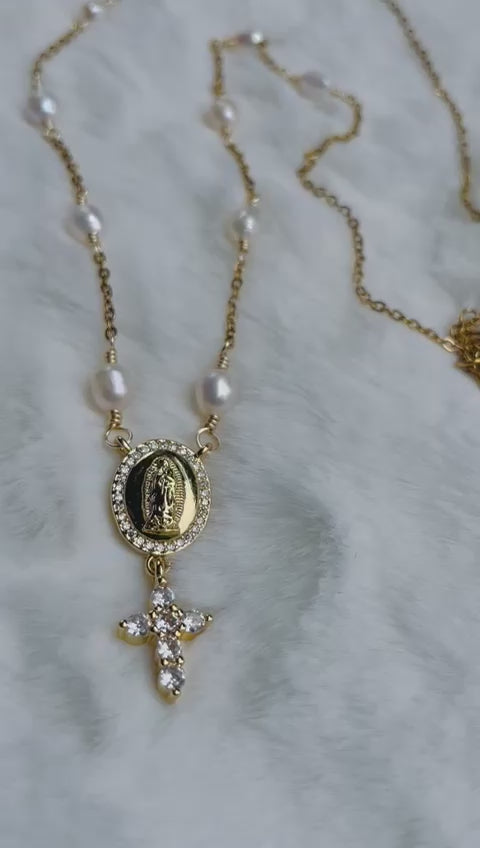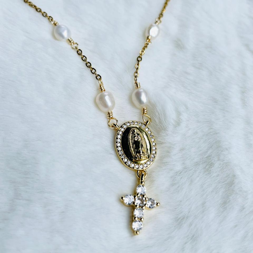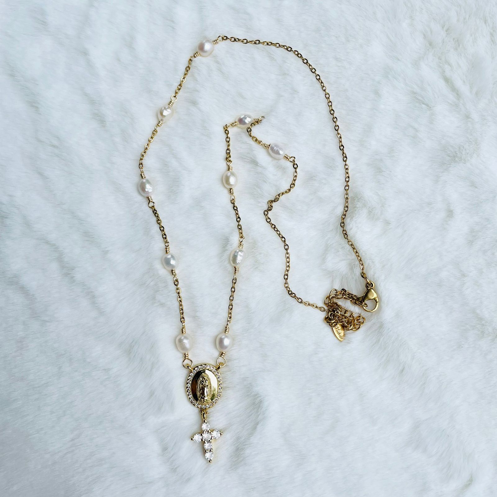 Este collar denario es una pieza que combina fe y moda. Hecho con perlas de alta calidad engarzadas en una cadena de acero, este collar destaca por su encuentro y cruz con un lujoso baño de oro de 18 quilates y destellos de circonias.