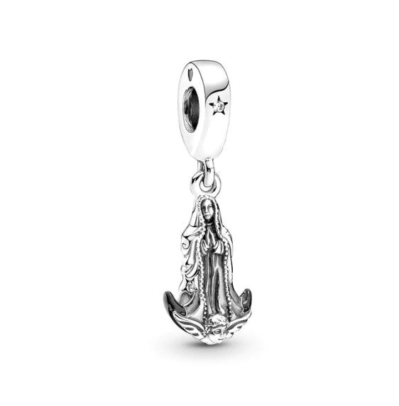 Honra a la Emperatriz de las Américas con este hermoso charm colgante de la Virgen de Guadalupe. Hecho en Plata 925, este accesorio presenta delicados detalles de estrellas y está diseñado para ser un recordatorio de su amor y protección. Perfecto para personalizar tu pulsera tipo Pandora y llevar un símbolo de esperanza a donde quiera que vayas.