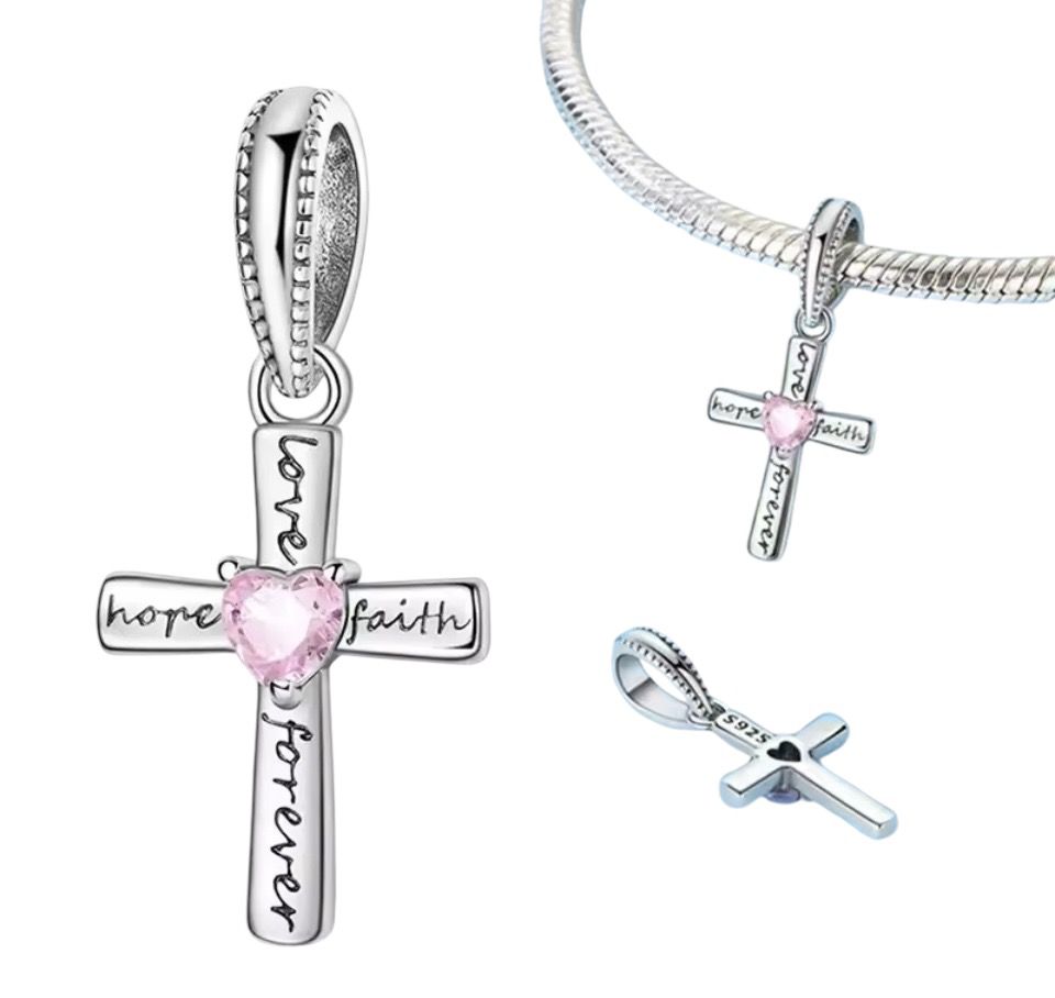 Discover a symbol of faith full of color. This delicate 925 Sterling Silver pendant charm features a cross with a beautiful pink stone at its center, a reminder that faith is as vital as hope. It's the perfect accessory to add a touch of color and profound meaning to your Pandora-style bracelet.