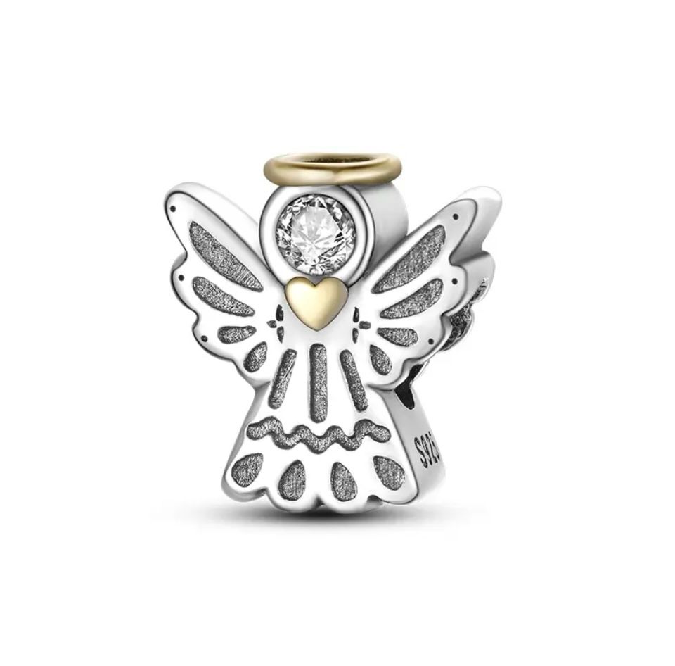 Descubre la elegancia y la fe en una sola pieza. Este delicado charm colgante de Plata 925 presenta un ángel guardián, adornado con un diamante, una coronilla y un corazón en el centro. Es más que un accesorio; es un recordatorio de que siempre estás protegido. El complemento ideal para darle a tu pulsera tipo Pandora un toque de significado y estilo.
