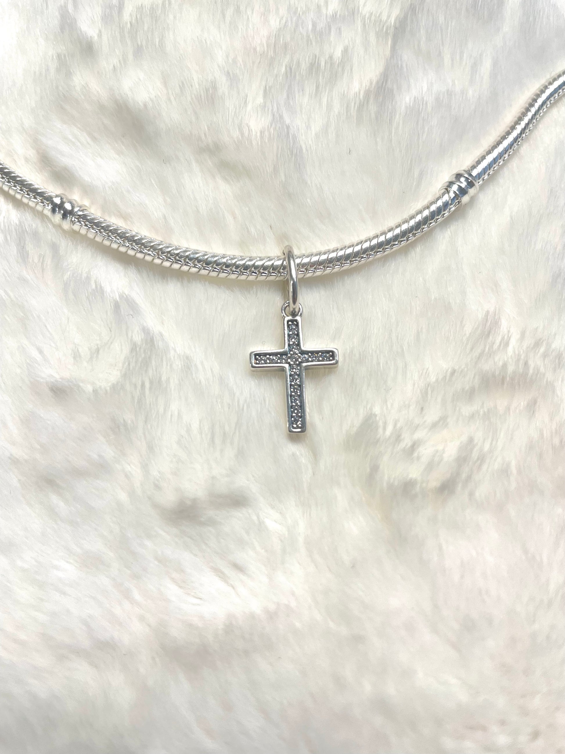 Descubre un símbolo de fe que brilla con cada movimiento. Este delicado charm colgante de una cruz está meticulosamente adornado con cristales que capturan la luz, creando un recordatorio de tu devoción lleno de elegancia. Es el complemento perfecto para personalizar tu pulsera tipo Pandora y llevar un recordatorio de tu fe en cada paso. Un accesorio lleno de significado que no te querrás quitar.