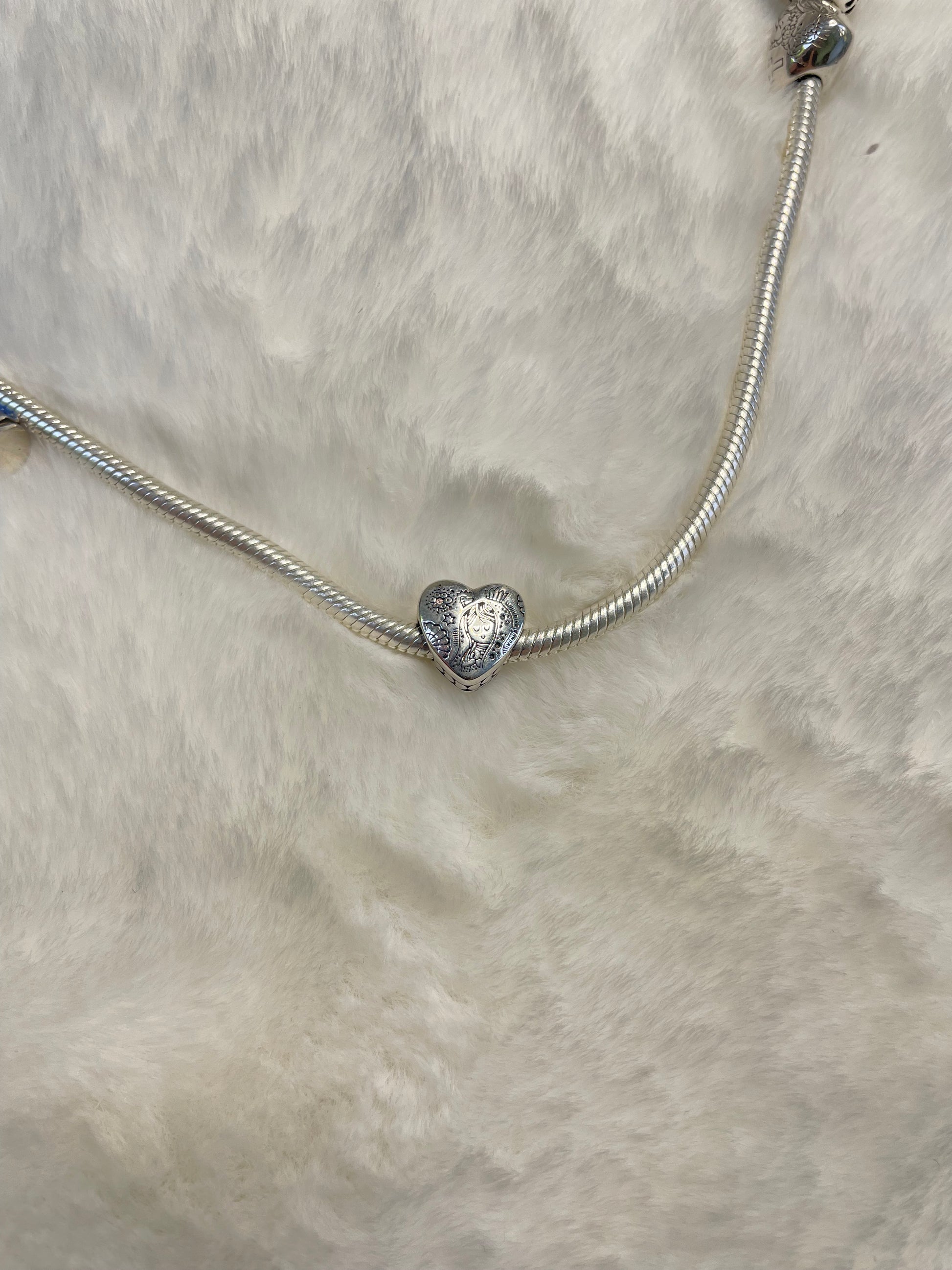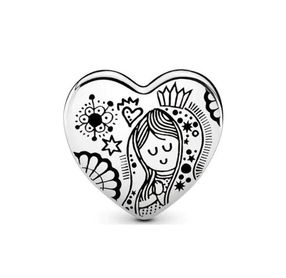 Lleva tu devoción cerca del corazón con este encantador charm de Plata 925. Una hermosa figura de la Virgen se posa sobre una base en forma de corazón, un recordatorio de que el amor y la fe son la guía de tu vida. Es el accesorio ideal para tu pulsera tipo Pandora, combinando elegancia y un profundo significado espiritual.