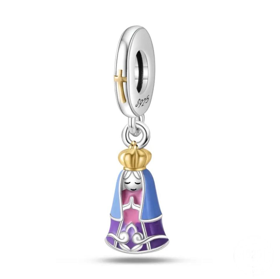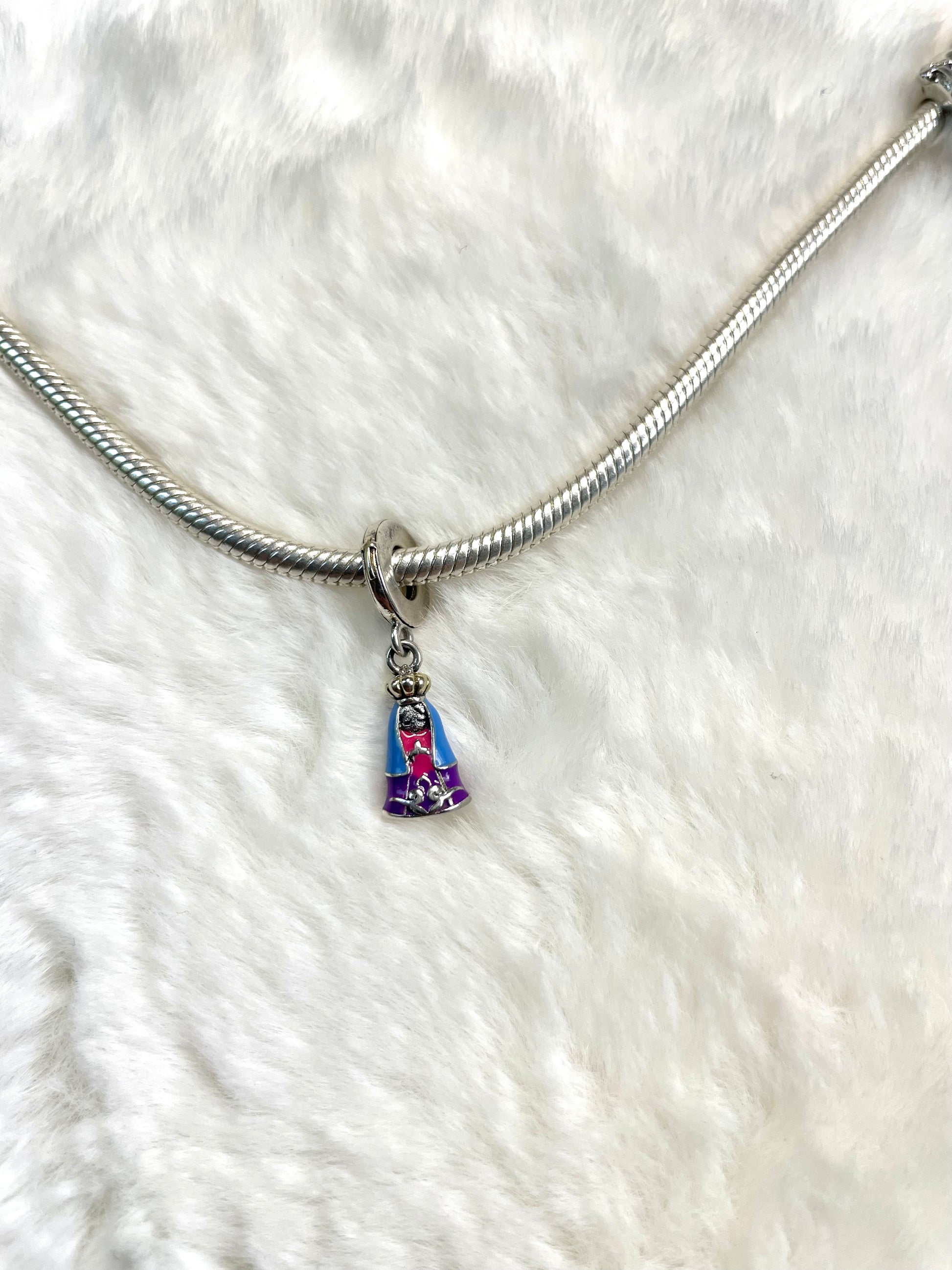 Descubre este tierno charm colgante de la Virgen de Fátima Niña. Con un delicado manto en tonos celeste y morado y una corona dorada, esta pieza es un símbolo de esperanza y pureza. Es el accesorio perfecto para añadir a tu pulsera Pandora y llevar un recordatorio constante de su mensaje de fe.