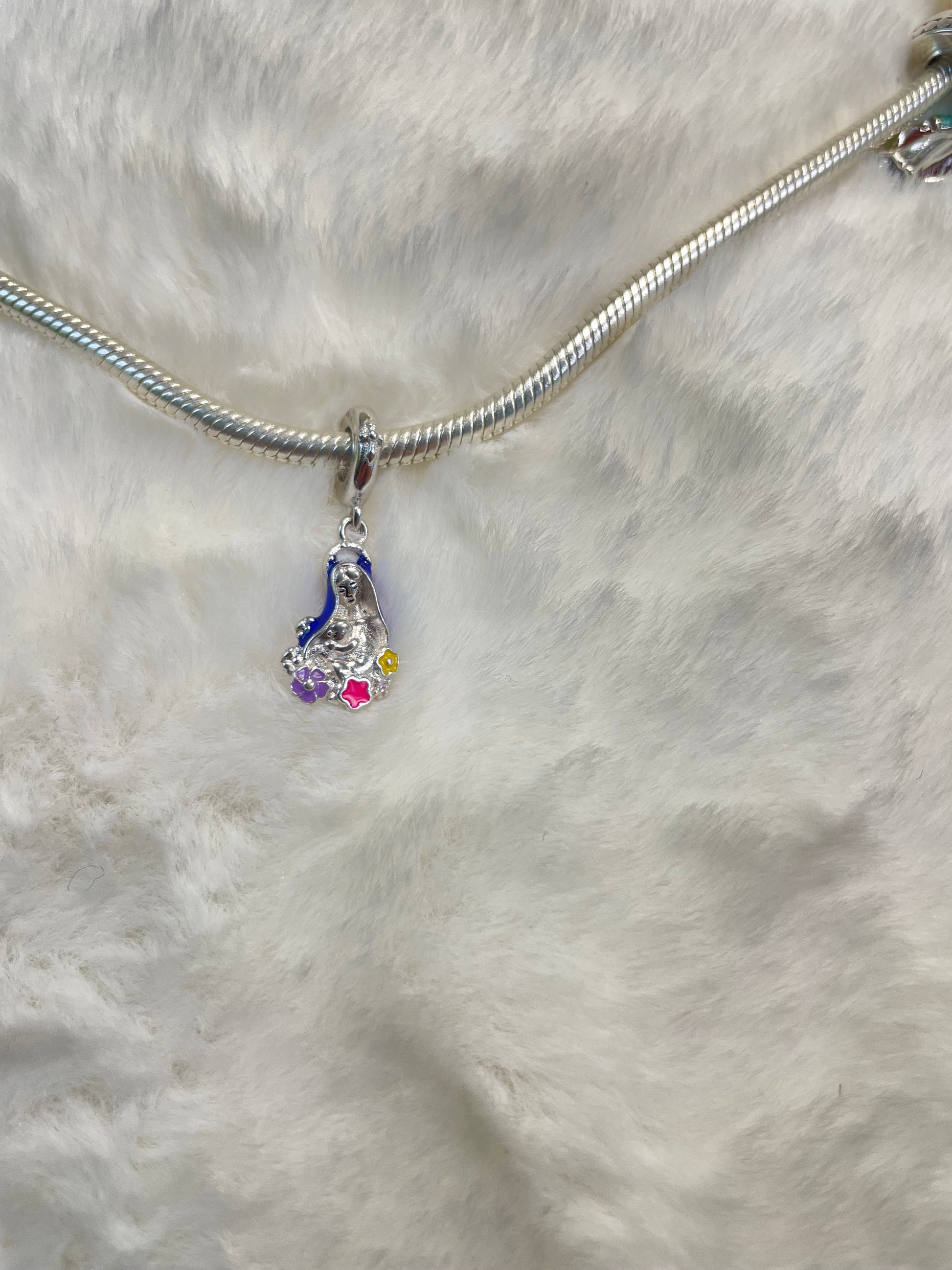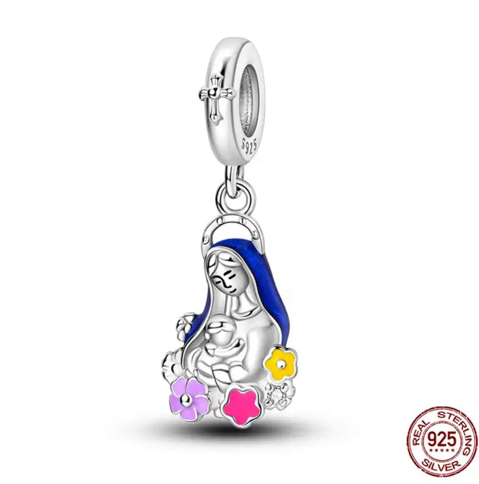 Celebra el amor y la protección con este tierno charm de Plata 925. Esta pieza única, que representa a la Virgen con el Niño Dios, está adornada con delicadas flores de colores. Es el accesorio perfecto para tu pulsera tipo Pandora, recordándote la fuerza del amor maternal y la fe en cada momento.