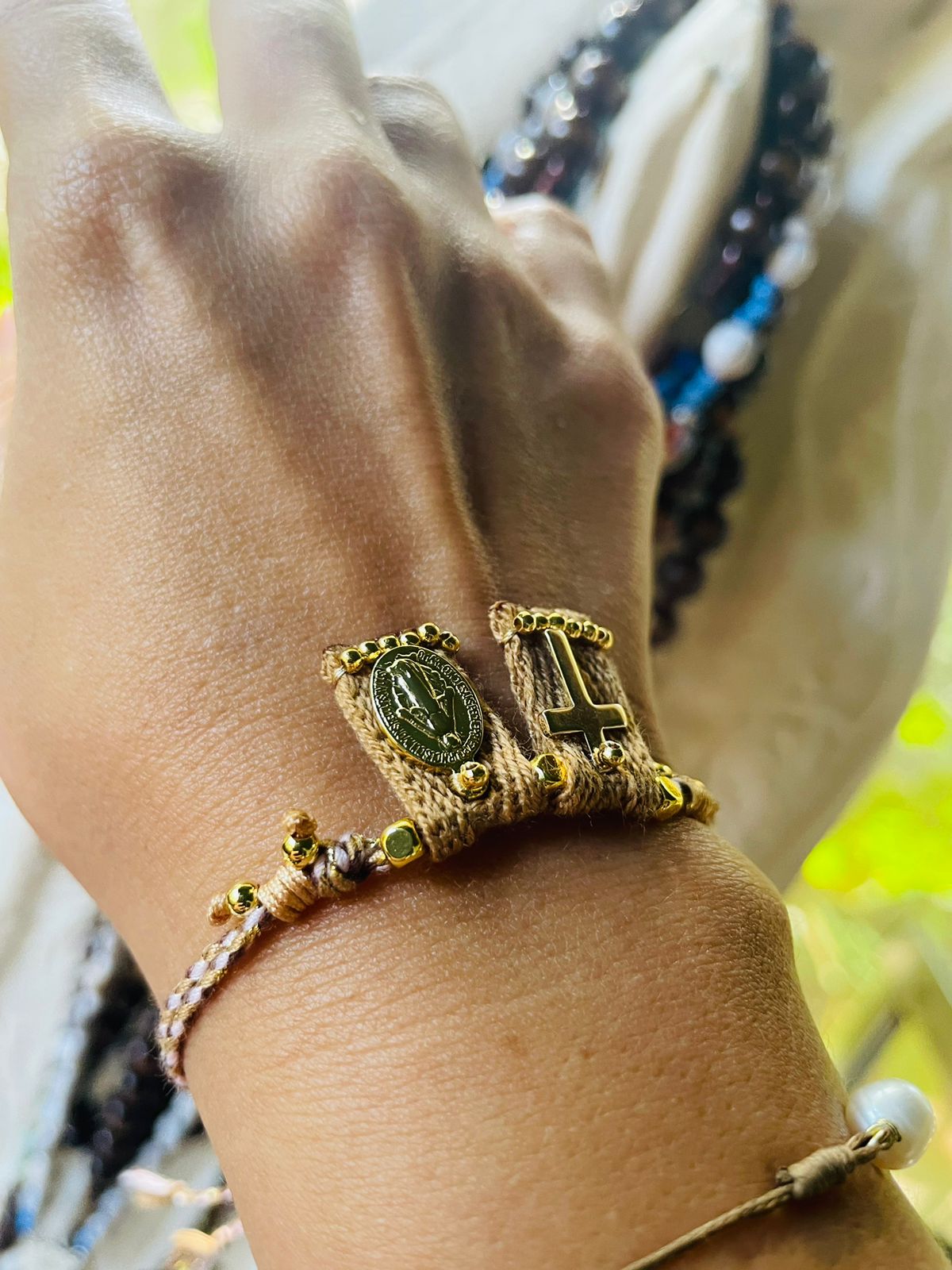 Adjustable bracelet, it has a small cross and a Miraculous Virgin Mary.
