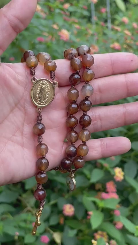 Hecho con cuentas naturales de 8mm, esta pieza se siente sólida y reconfortante en tus manos durante la oración. Con accesorios de acero inoxidable que garantizan durabilidad y brillo, este rosario es un compañero fiel en tu camino espiritual.