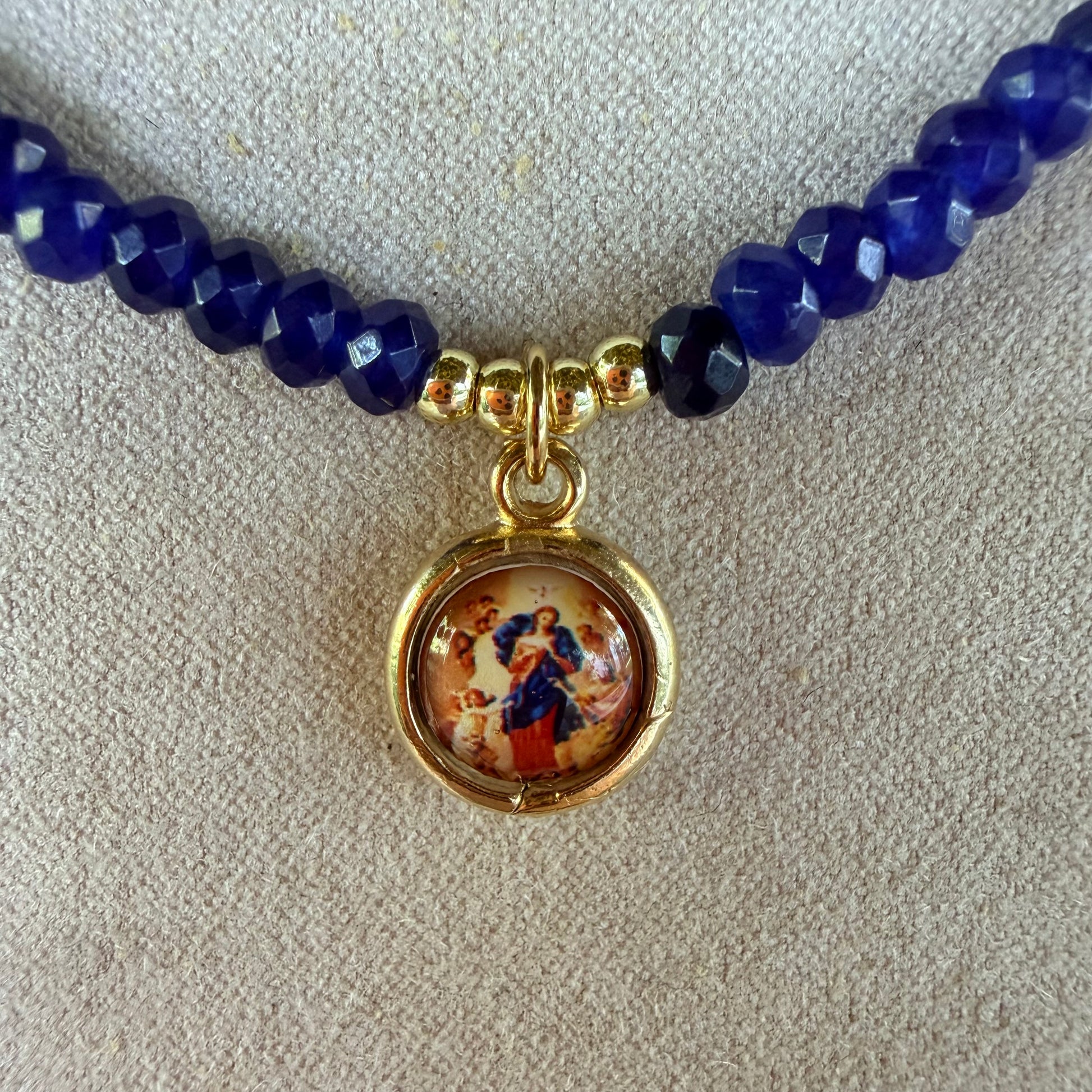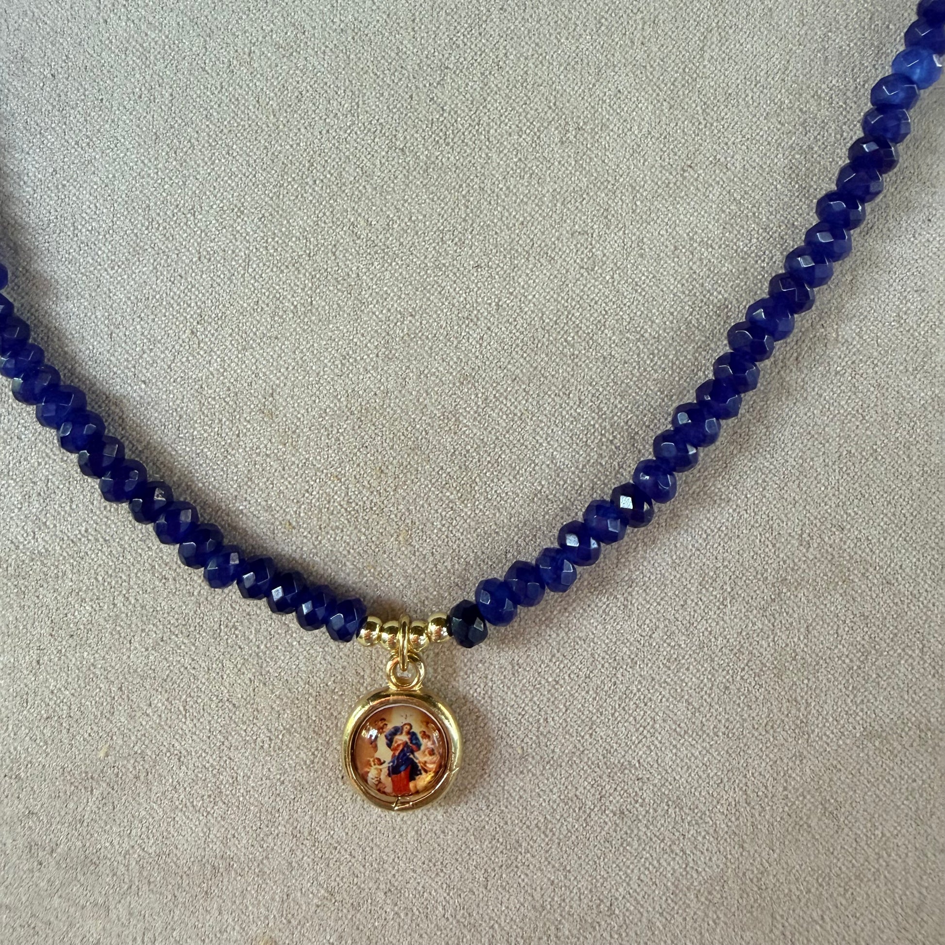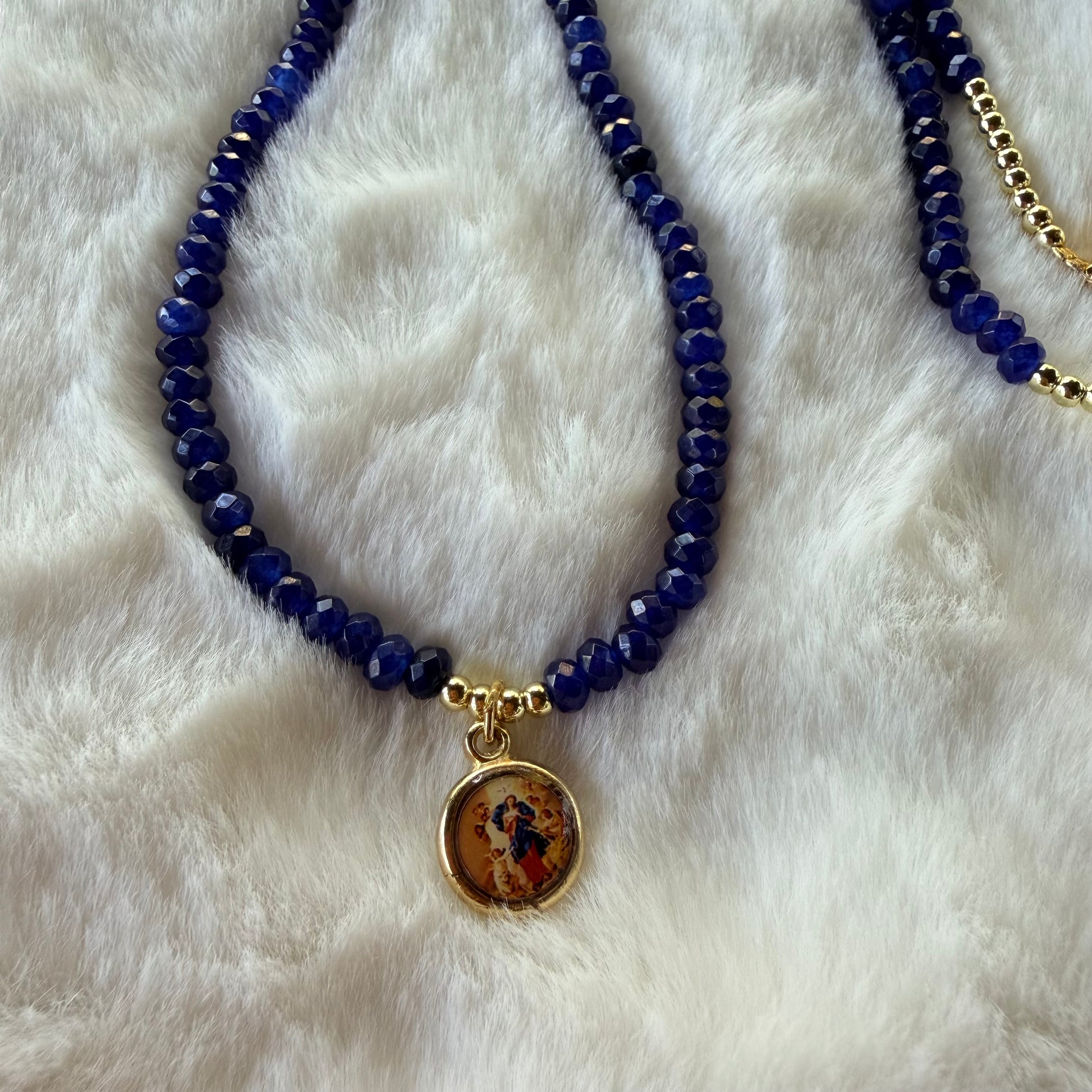 Collar delicado elaborado con piedra natural mini de 3 mm en tono azul, pensado para llevar la fe de manera sutil, cotidiana y llena de significado.
