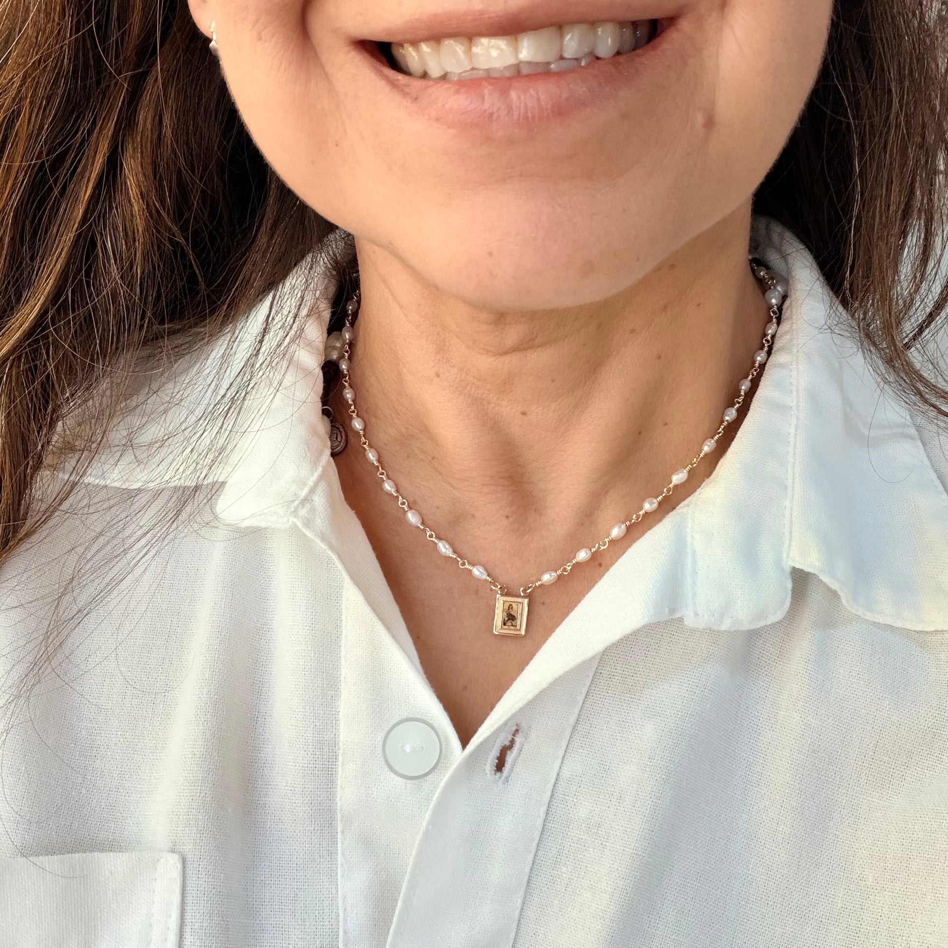 Collar corto artesanal elaborado con perlas pequeñas de 4 mm, engarzadas a mano en alambismo dorado. Al centro lleva una delicada virgencita en baño de oro, símbolo de fe, protección y amor. Ideal para uso diario o para regalar, este collar combina elegancia, devoción y diseño hecho a mano.