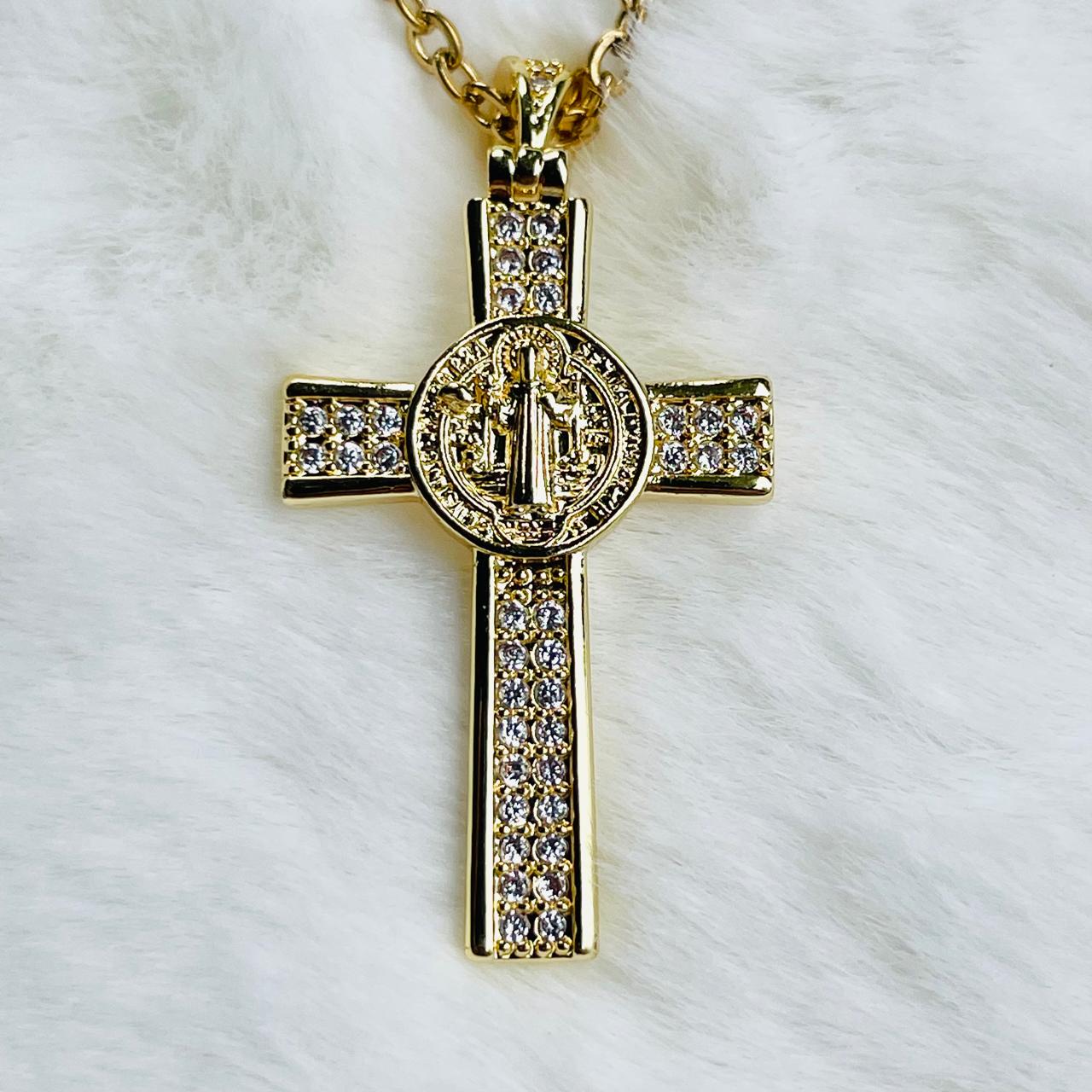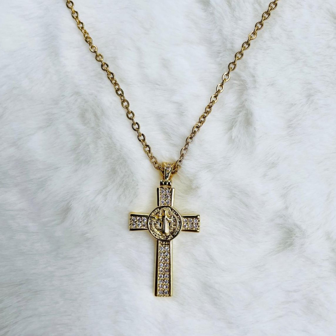 Carry with you the powerful protection of Saint Benedict . This necklace combines an 18k gold -plated chain and a mother-of-pearl shell medal, creating a unique piece that balances faith with fashion. It's a reminder that you are always protected.