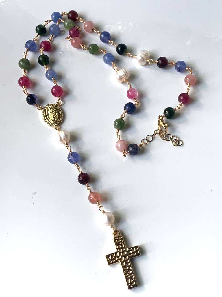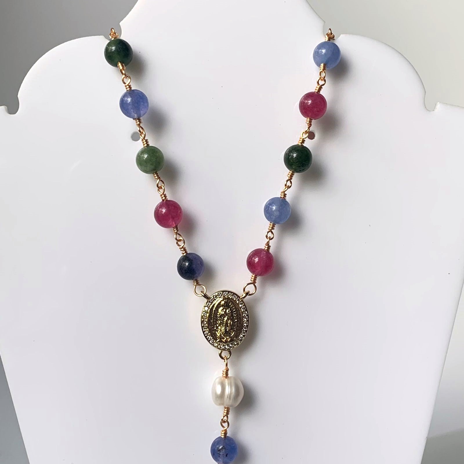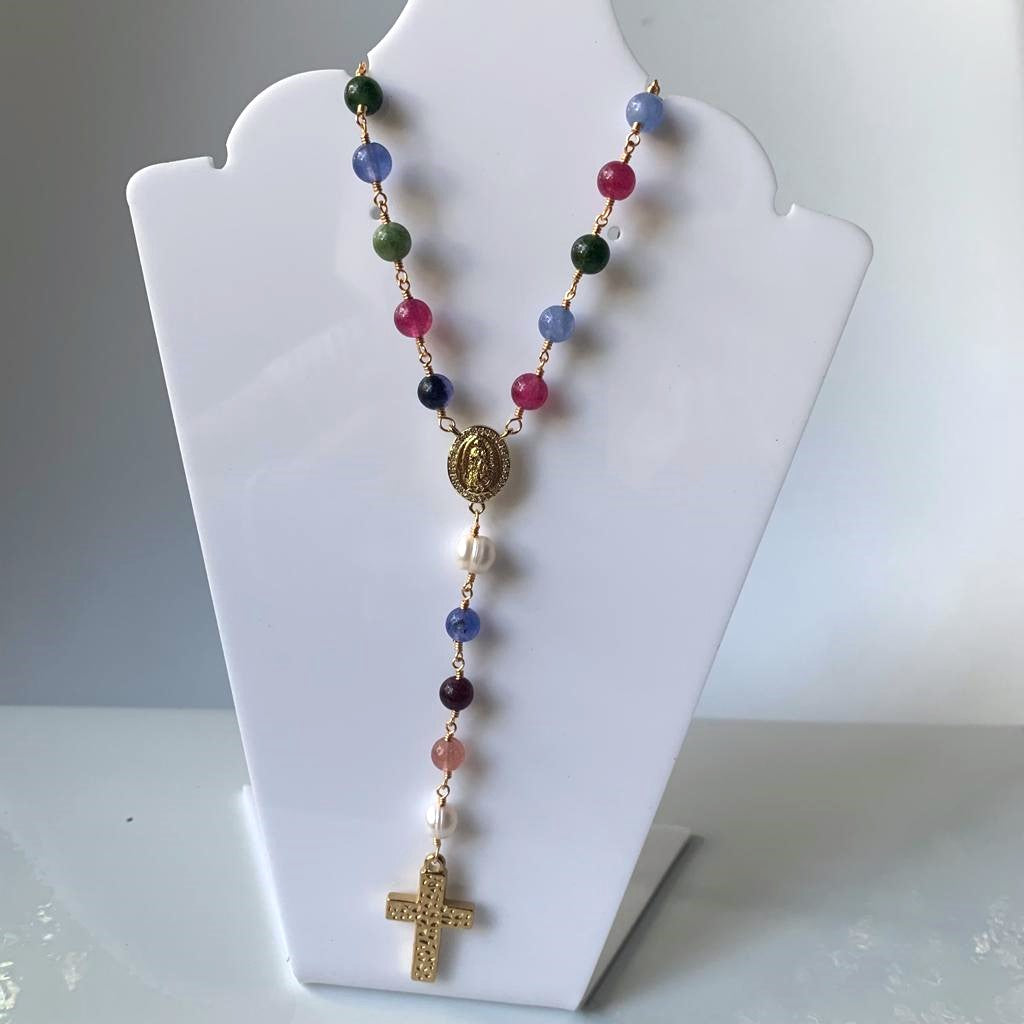Este collar rosario es la combinación perfecta de fe y elegancia. Elaborado con vibrantes ágatas multicolor de 6mm y perlas naturales, cada uno de sus tres misterios está unido con un hermoso alambre de baño de oro.