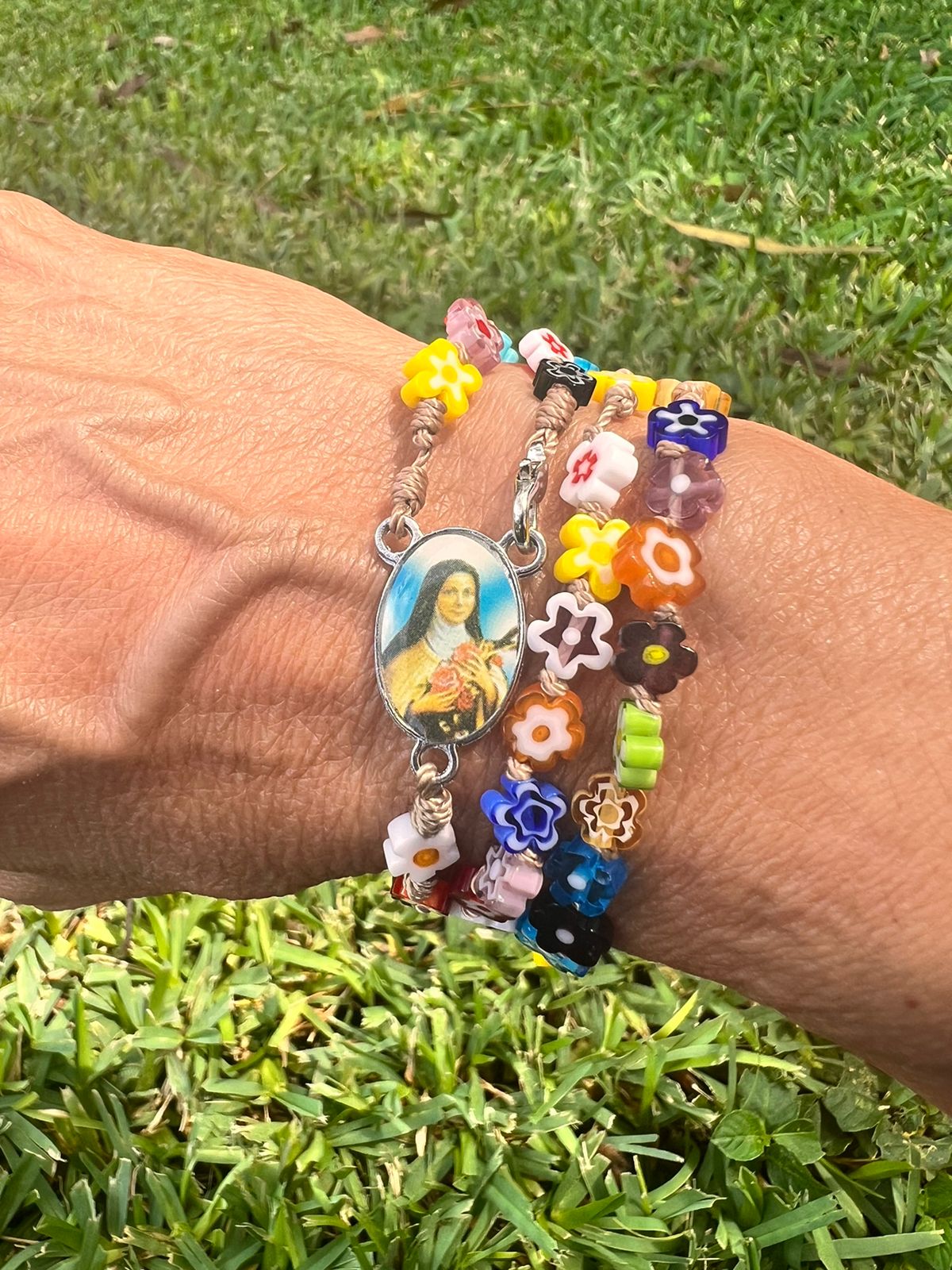 Siente la belleza de la creación en cada oración. Este rosario con cuentas en forma de delicadas flores es un recordatorio de la belleza de la fe. Engarzado con un resistente nudo Franciscano, su diseño versátil te permite usarlo como pulsera, collar o camándula. Un accesorio tan único como tu devoción.