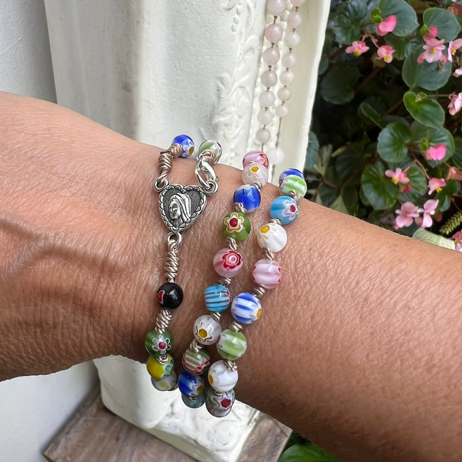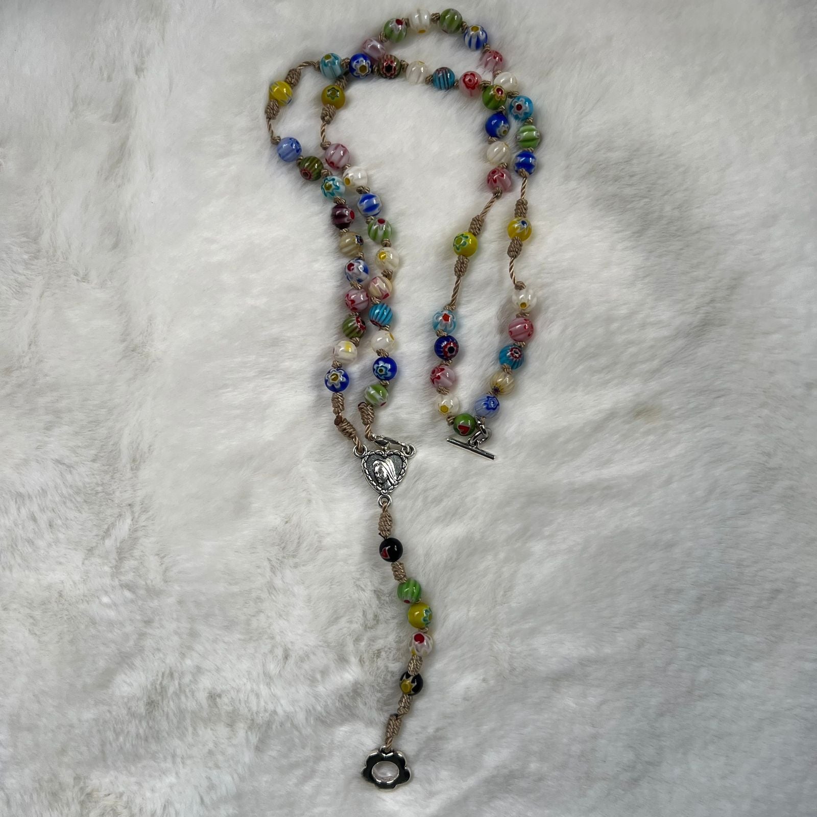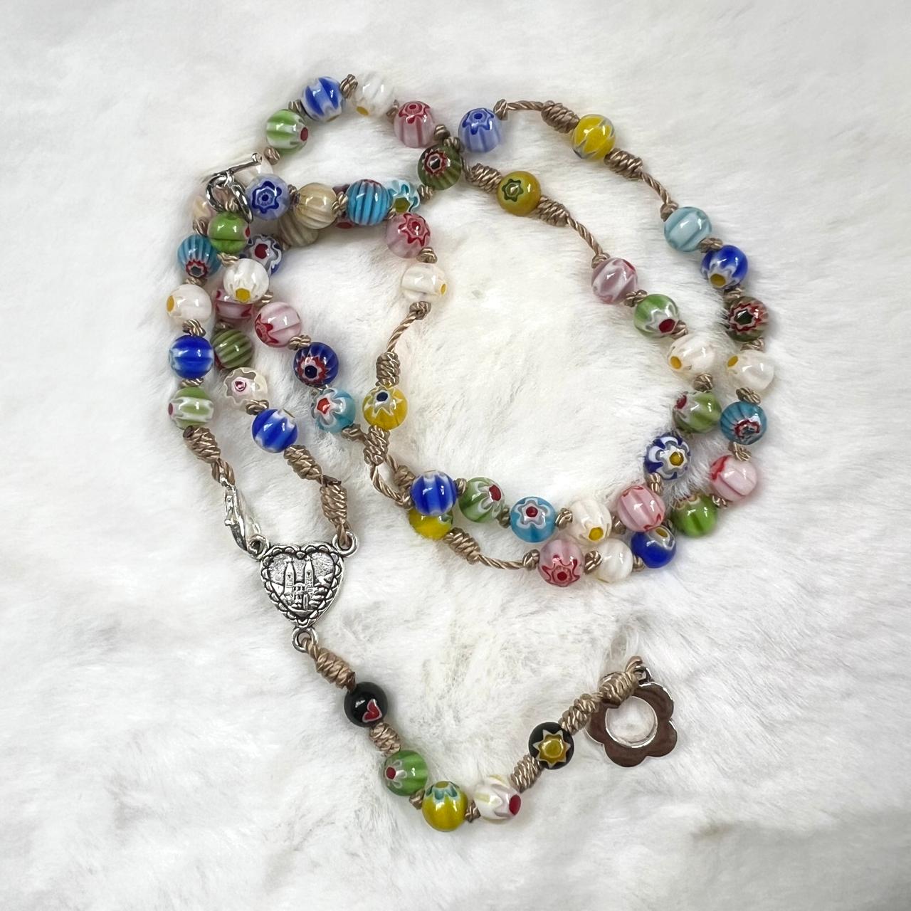 A rosary as unique as your faith. Discover the beauty of prayer with our Murano Rosary , a true work of art. Each 6 mm round, vibrant bead is meticulously engraved with a delicate floral design , creating a spectacular visual effect. The beads are finely strung on a beige cord featuring classic Franciscan knots , uniting tradition and modernity in a single piece.