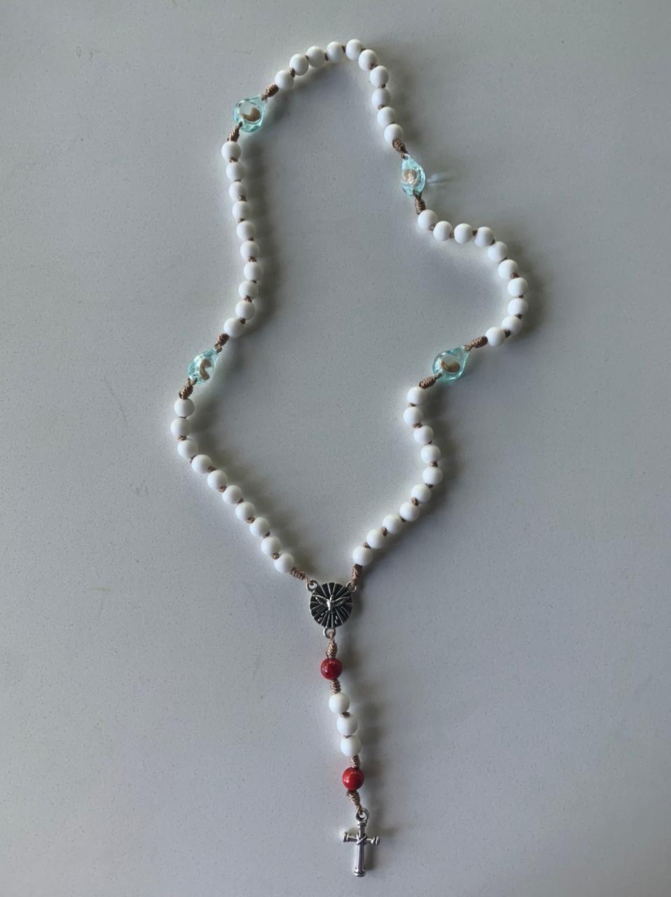 Accesorios plateados de piuter. Cada Padre Nuestro representa un nino no nacido, y los cristales rojos la sangre derramada