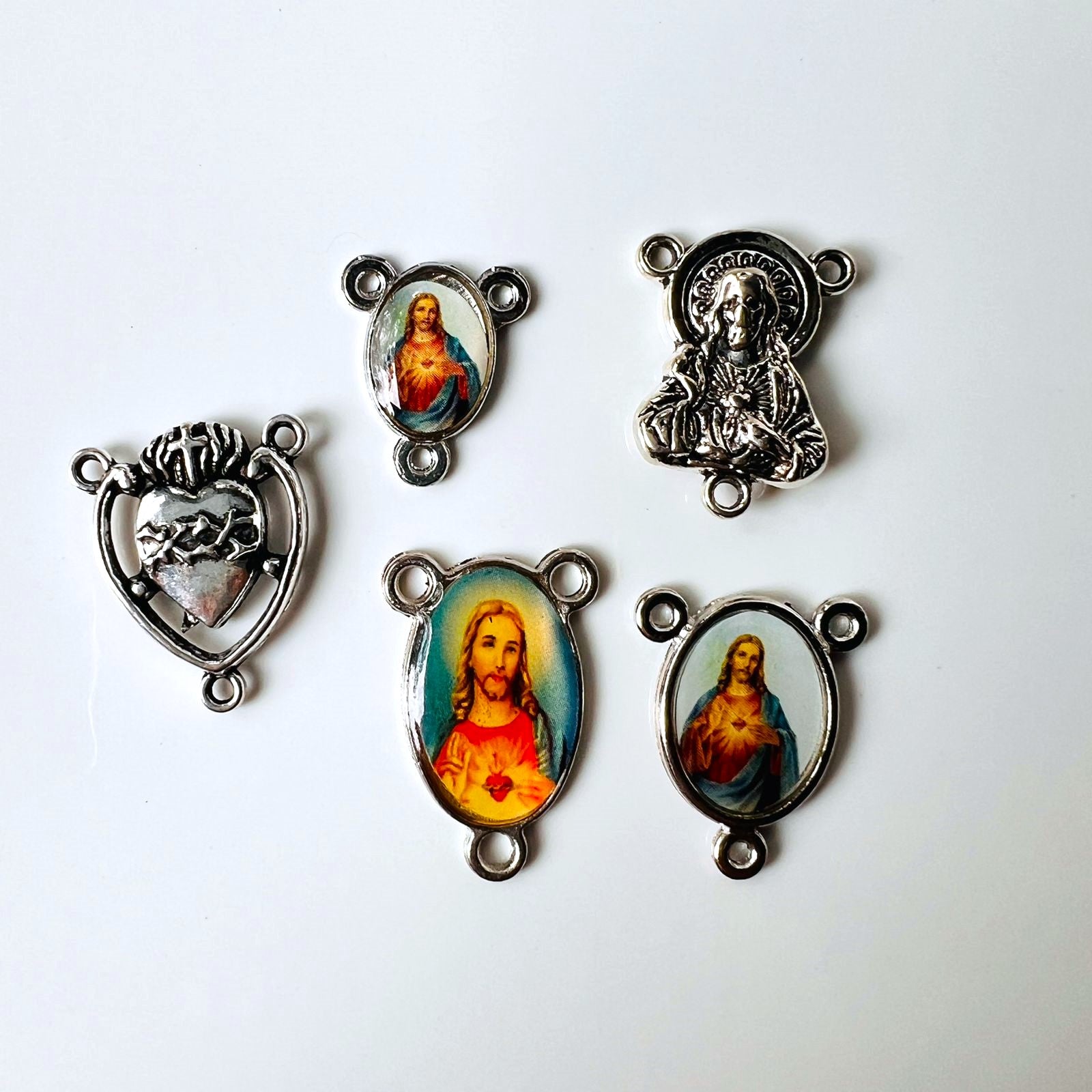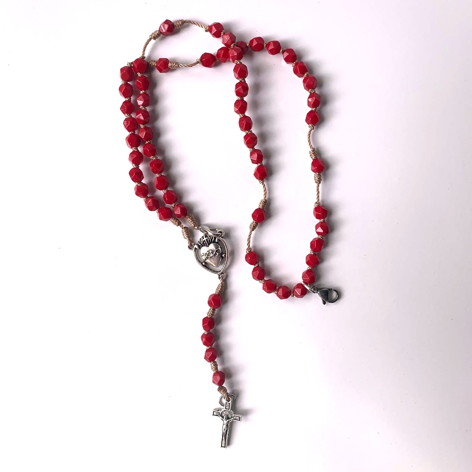 Faceted red crystal set in leather cord, with Franciscan knot and pewter accessories.