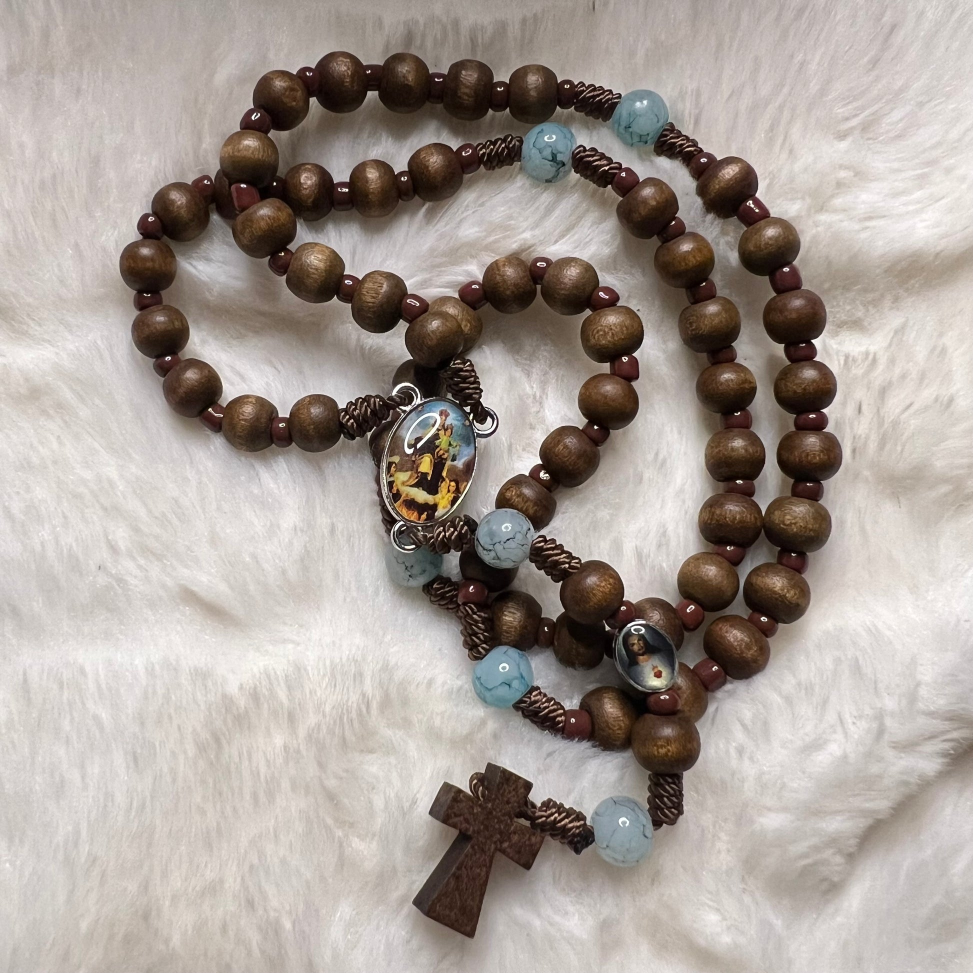 Rosary strung on brown cord with brown wooden beads, the Our Fathers in natural stone. Silver-plated pewter medal of Our Lady of Mount Carmel. Medal of the Sacred Heart of Jesus and wooden cross.