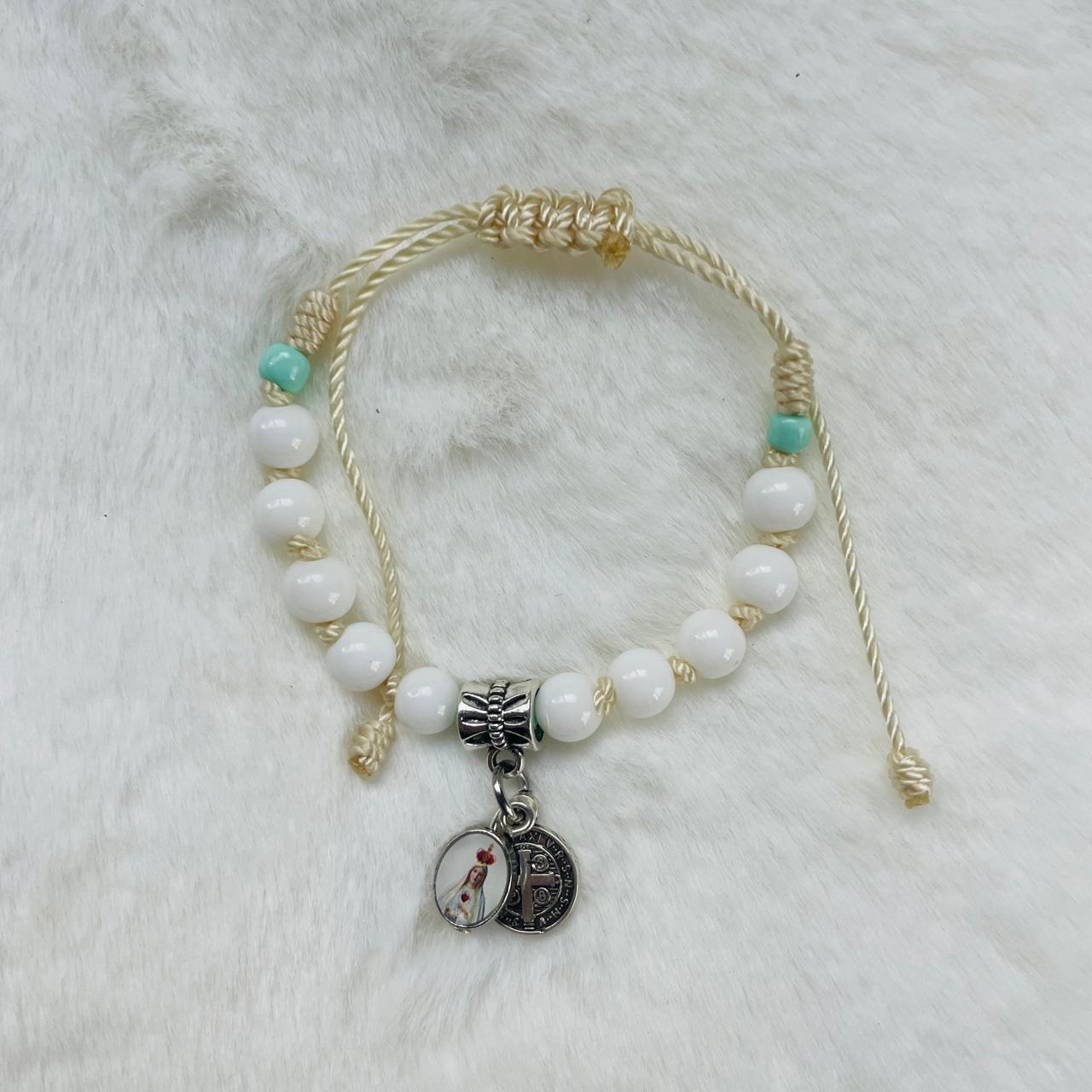 Un accesorio clásico y significativo. Este denario ajustable de cuentas blancas de 6mm está elaborado con un resistente nudo Franciscano y un cierre de macramé. Su diseño simple y elegante es un recordatorio diario de tu fe y de la paz que buscas en tu vida. Encuentro en Piuter con un cierre ajustable en Macrame.