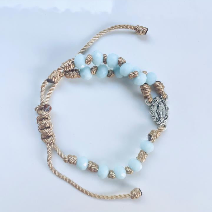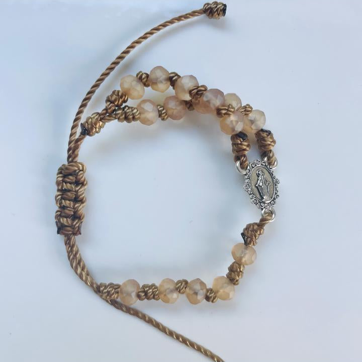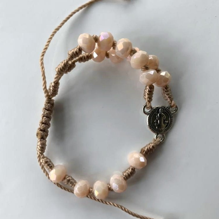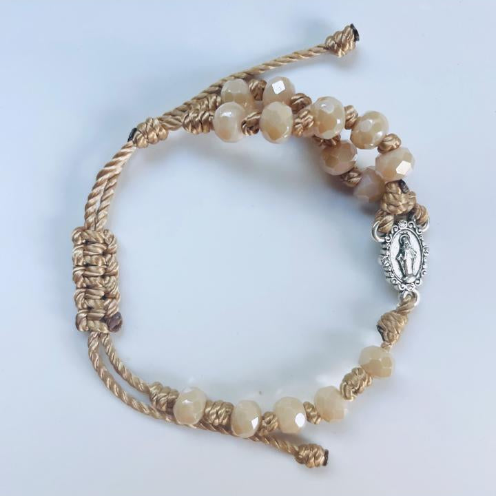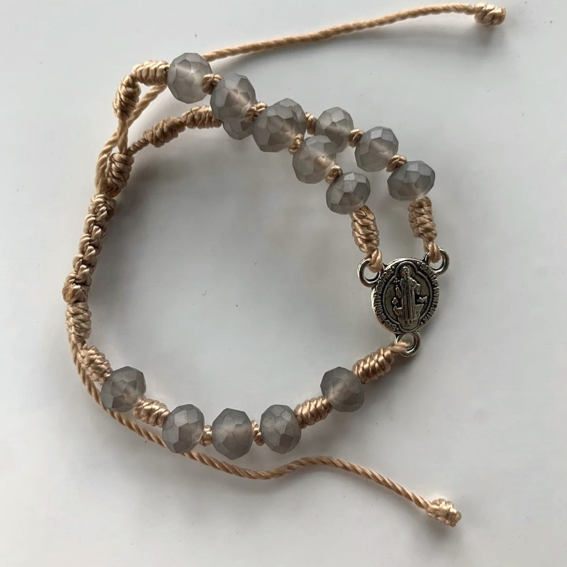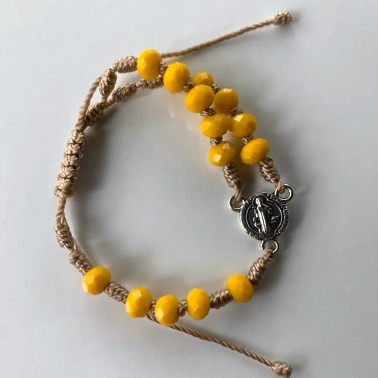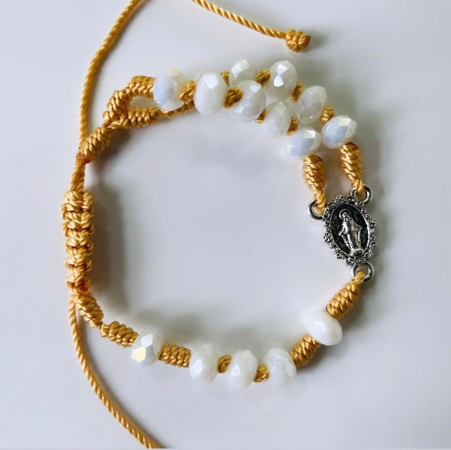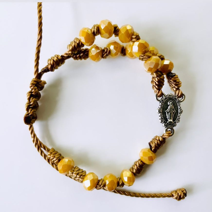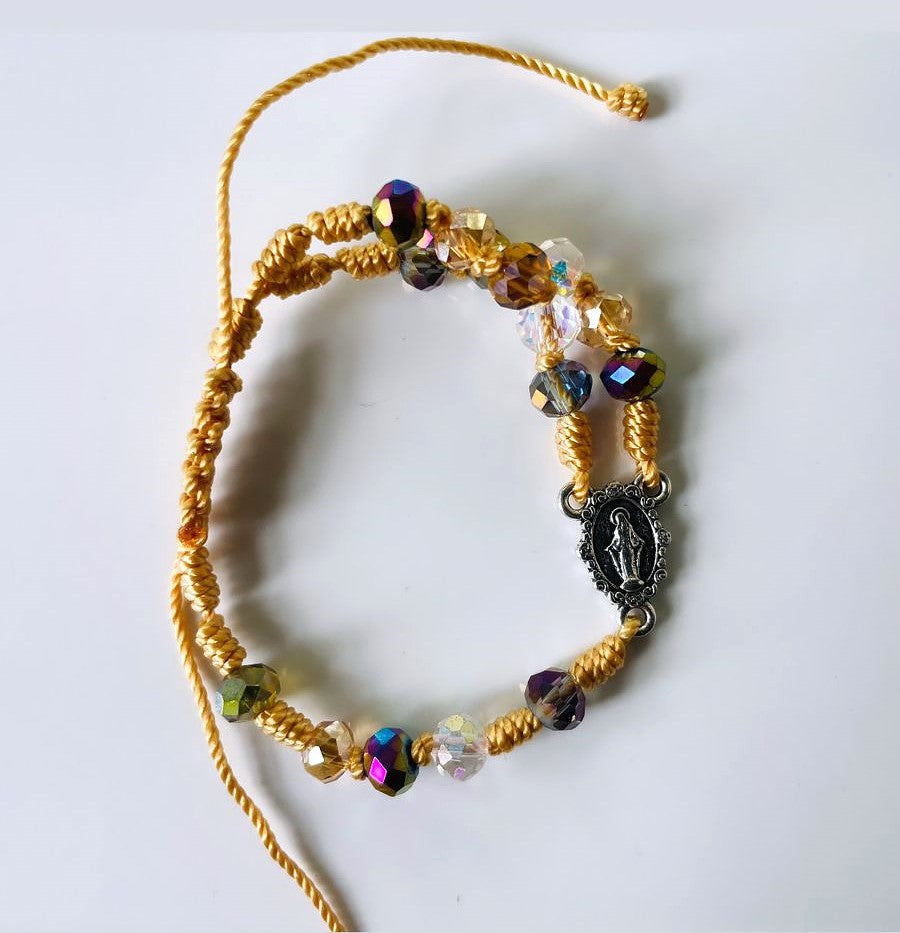Estos denarios ajustables de cristales de 6mm son más que un accesorio, son un recordatorio de la luz que guía tu vida. Engarzado con un resistente nudo Franciscano y un cierre de macramé, puedes usarlos cómodamente todos los días. Un detalle elegante que te conecta con tu devoción.