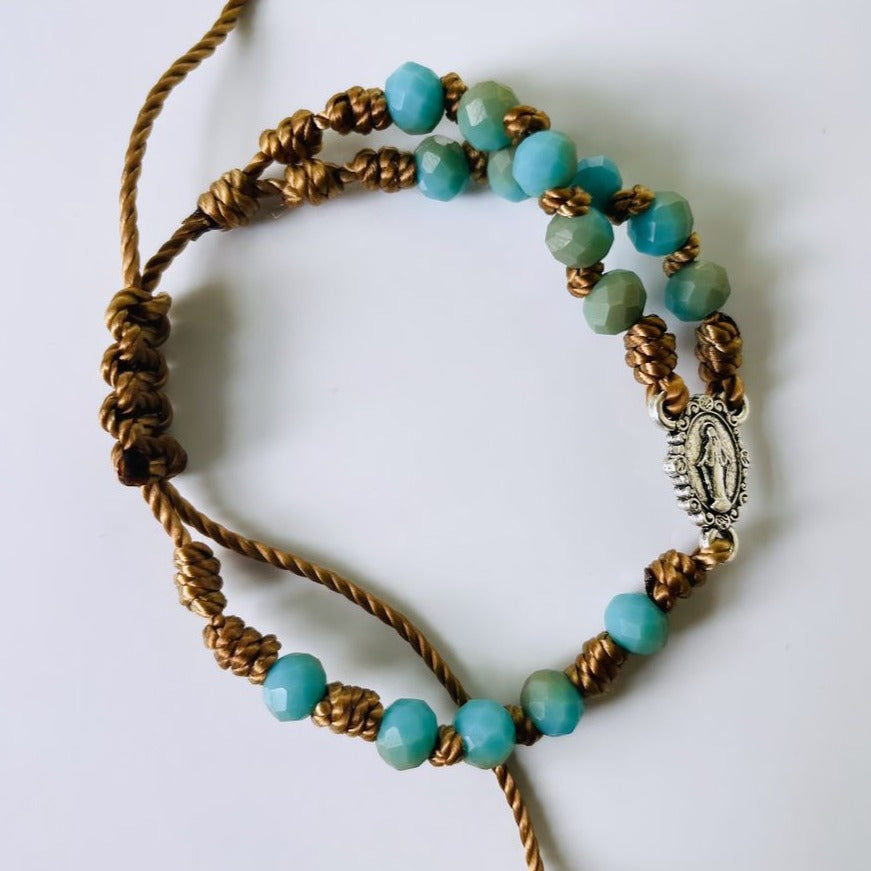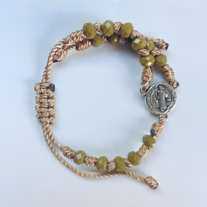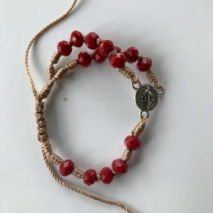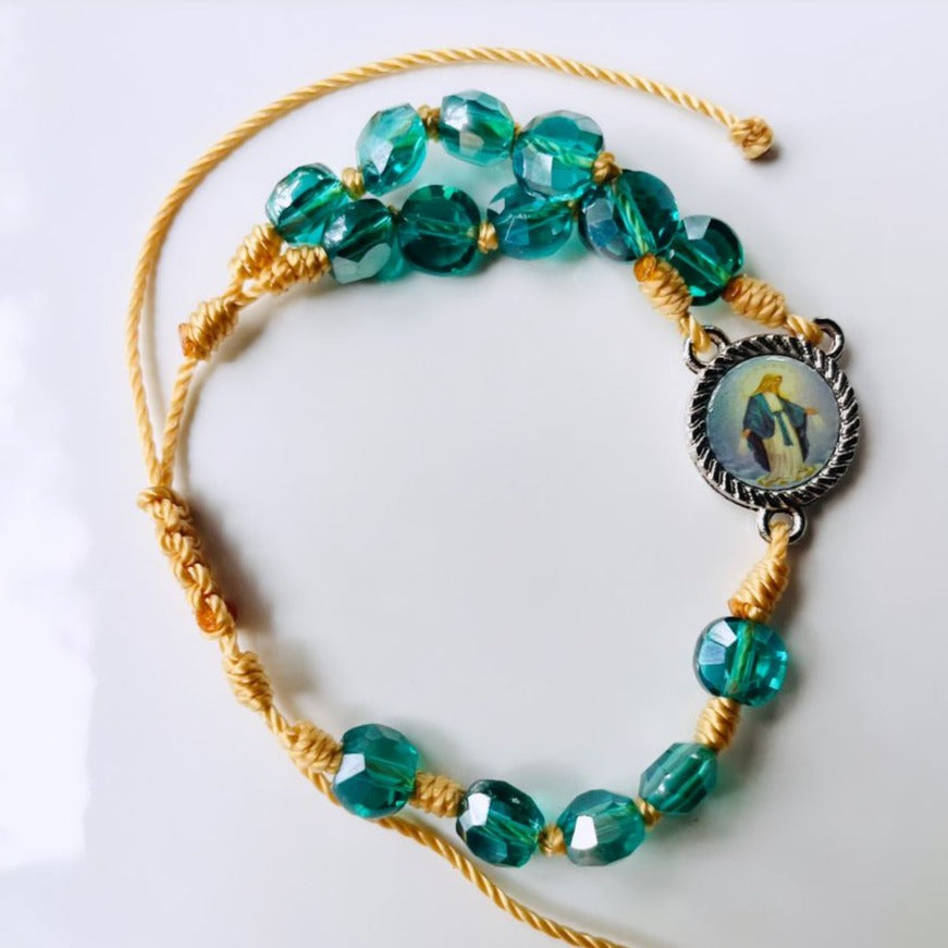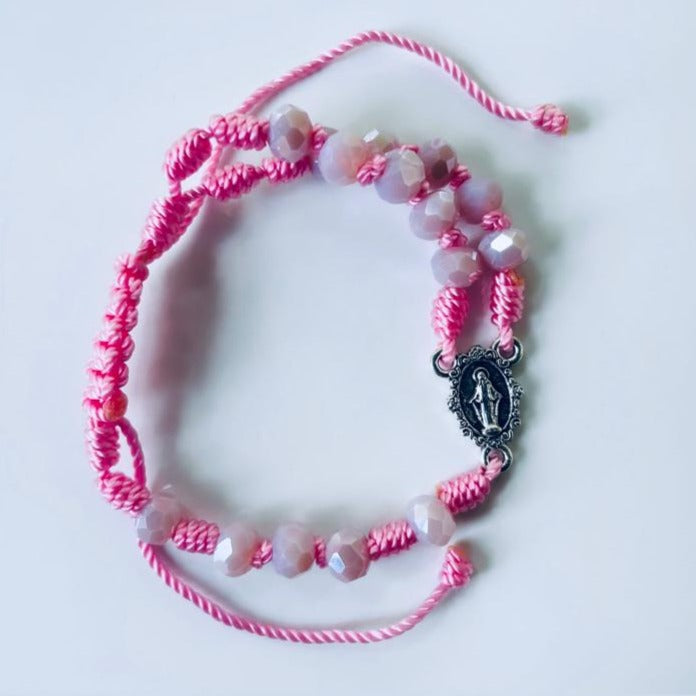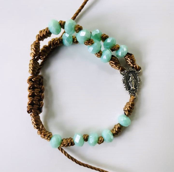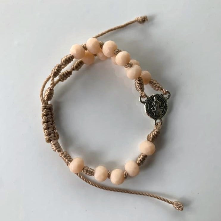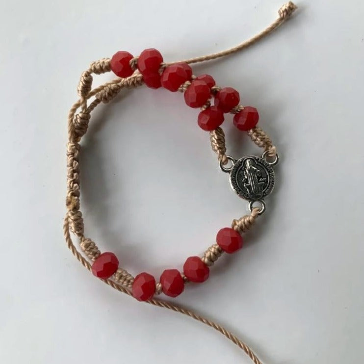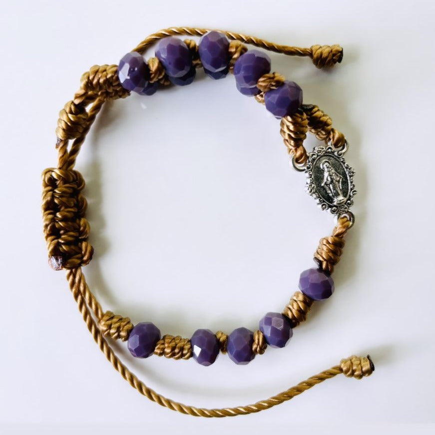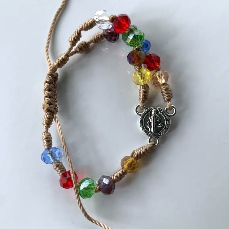 Estos denarios ajustables de cristales de 6mm son más que un accesorio, son un recordatorio de la luz que guía tu vida. Engarzado con un resistente nudo Franciscano y un cierre de macramé, puedes usarlos cómodamente todos los días. Un detalle elegante que te conecta con tu devoción.