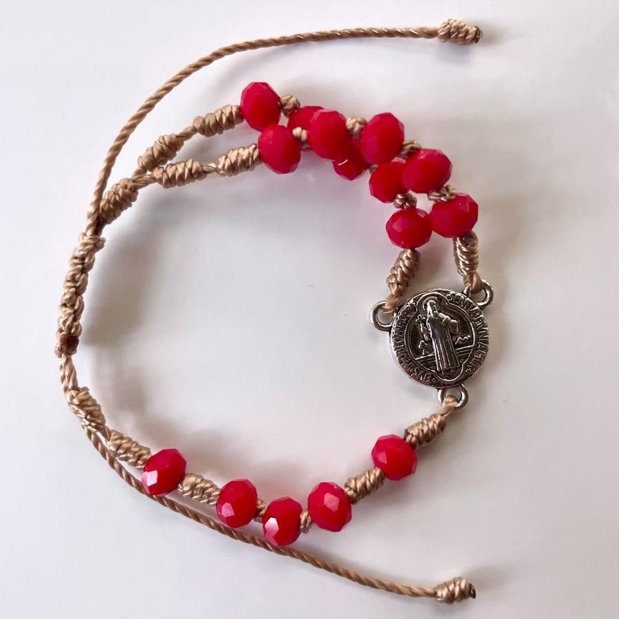 Este denario pulsera de cristales rojos no solo es un recordatorio de fe, sino también un accesorio vibrante. Gracias a su diseño ajustable, se adapta cómodamente a tu muñeca o puedes colgarlo del espejo de tu auto. Lleva contigo la fuerza de tu fe con un toque de color y estilo.