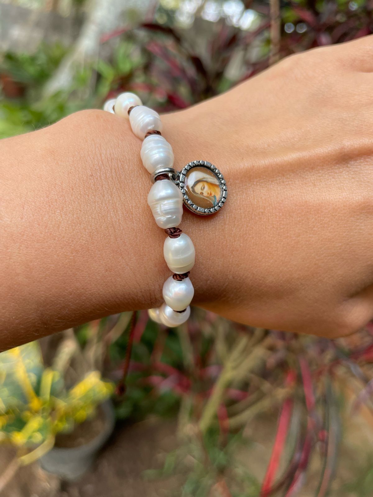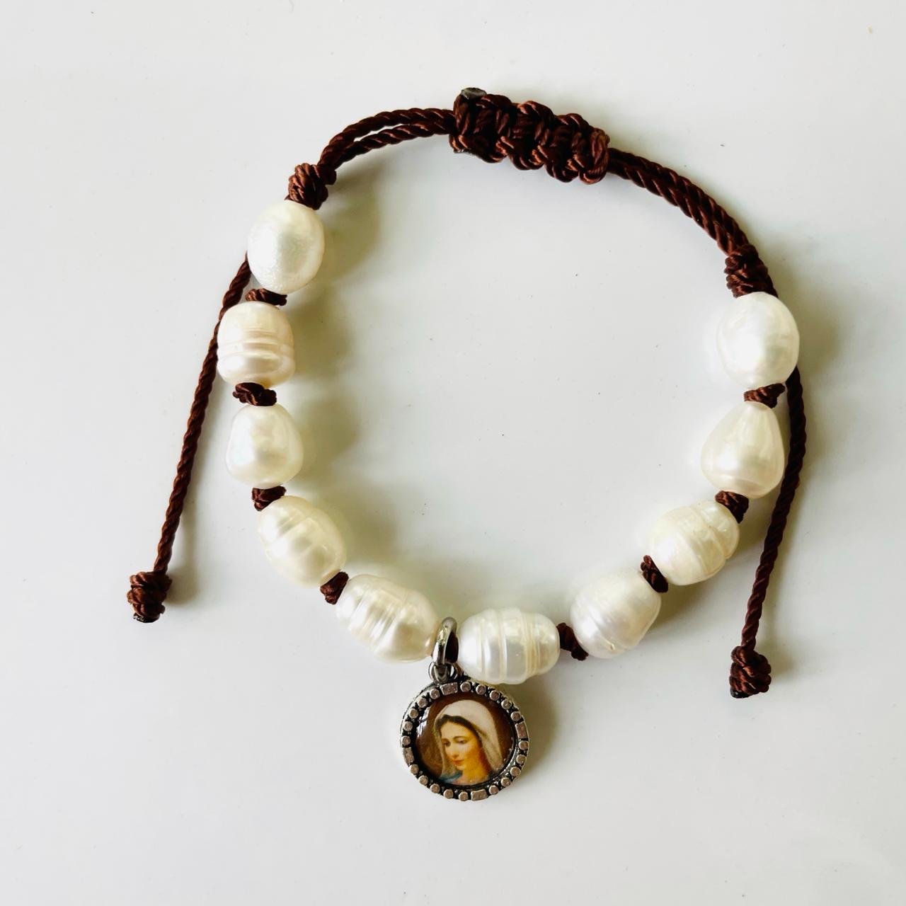 Un recordatorio de fe para tu viaje personal y espiritual. Este denario, hecho con perlas blancas de 8 mm, está engarzado en un hilo café que simboliza la conexión con la tierra y la vida. Con elegantes accesorios plateados, esta pieza es el compañero ideal para tus oraciones.