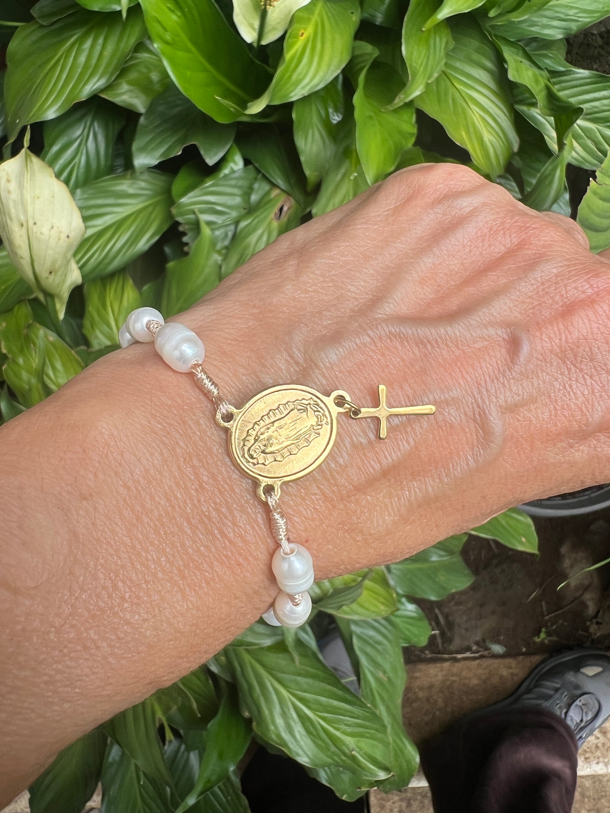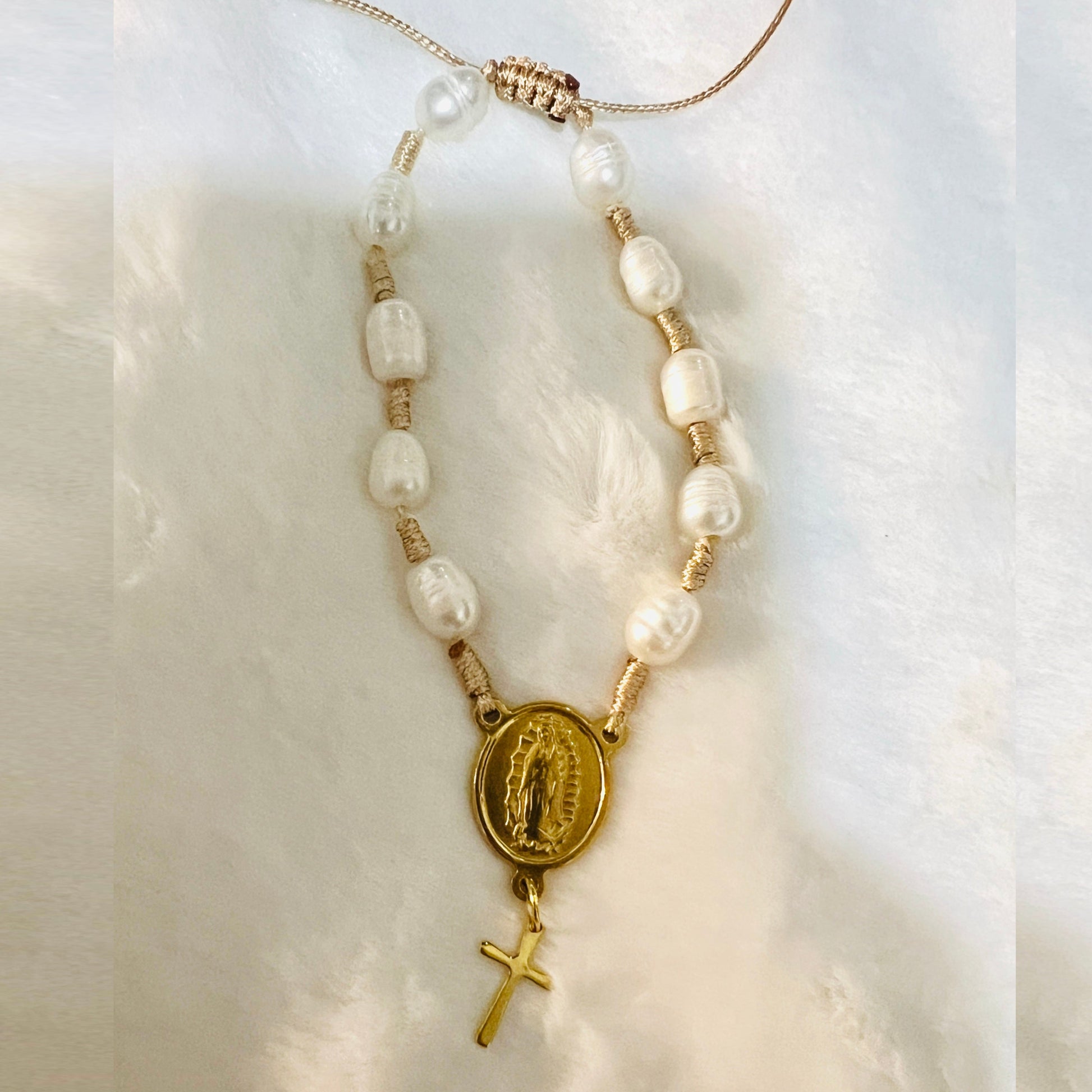 Un denario de fe que te acompaña dondequiera que vayas. Elaborado con perlas blancas de 8 mm engarzadas en hilo beige, esta pieza combina la sencillez con la durabilidad. Sus accesorios de acero dorado no solo le dan un toque elegante, sino que también aseguran su resistencia al paso del tiempo.