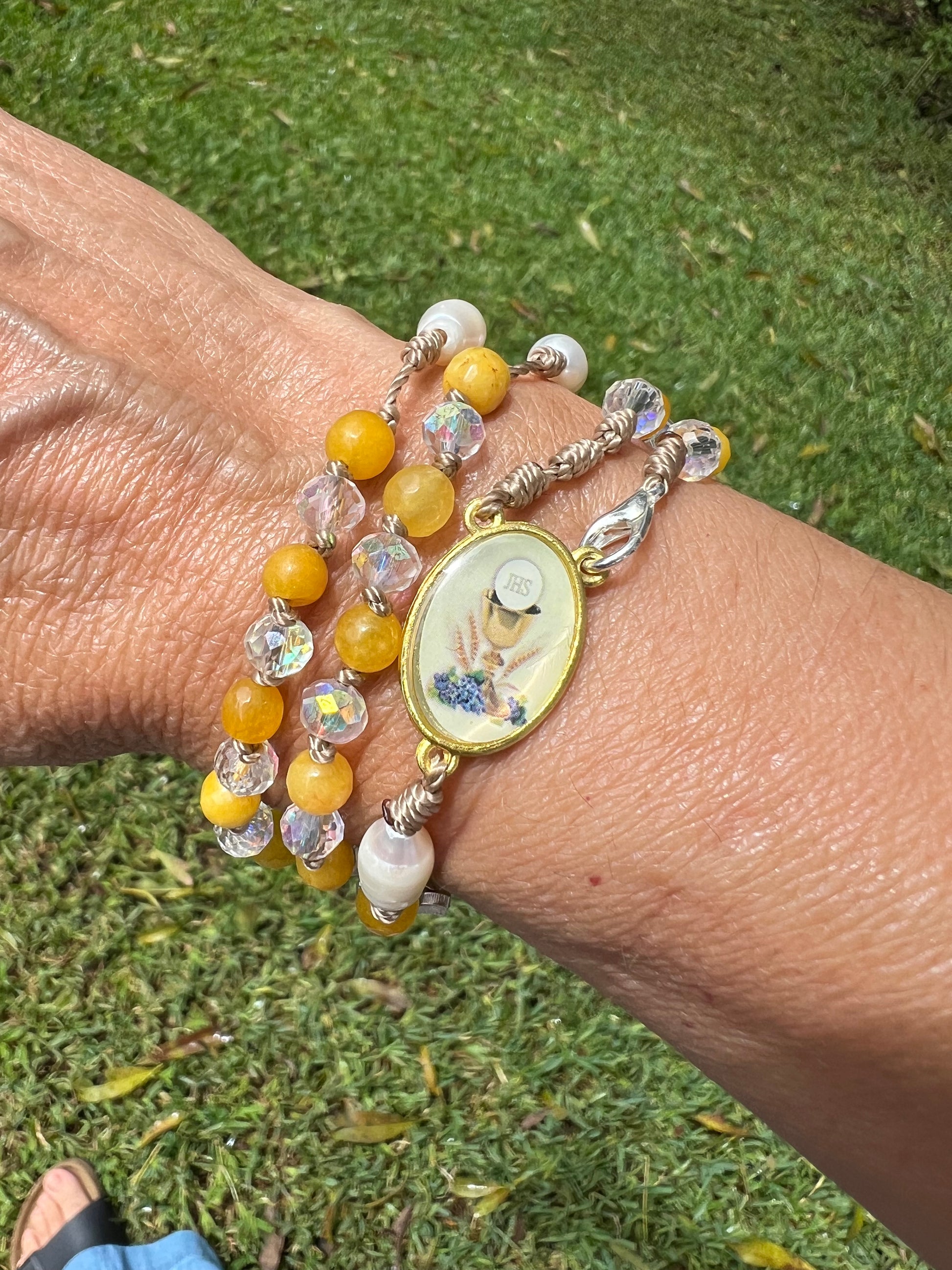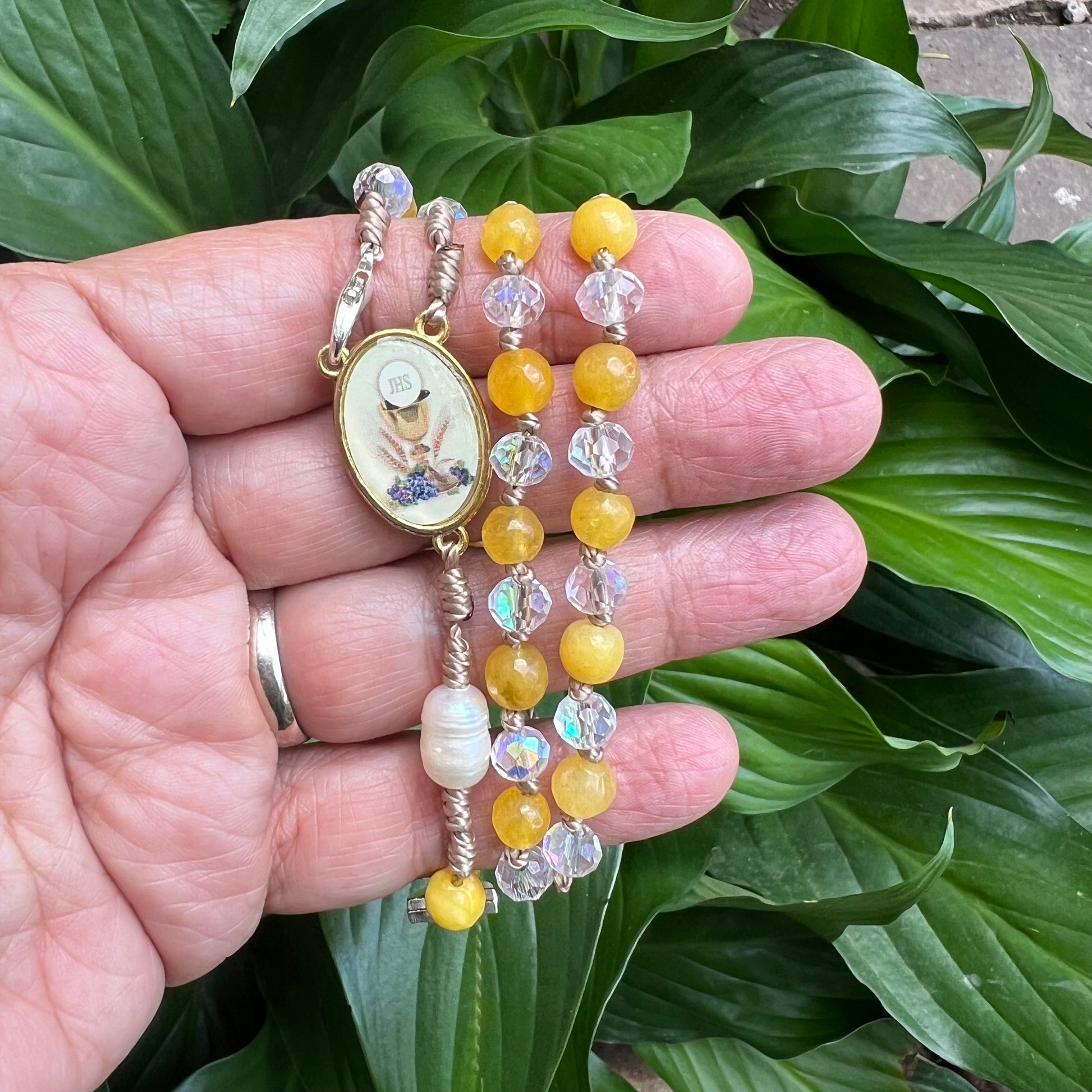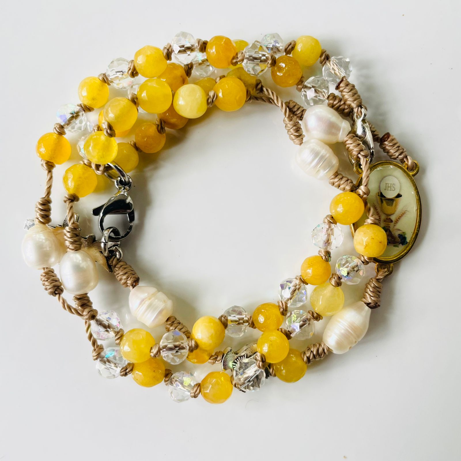 Prayer beads made with natural, faceted yellow agates (6mm), interspersed with clear crystals. Our Father prayers are in 6mm pearls. Set with Franciscan knots on beige cord, a gold Eucharistic medal, a cross with the Sacred Heart of Jesus, and a Holy Spirit medal.