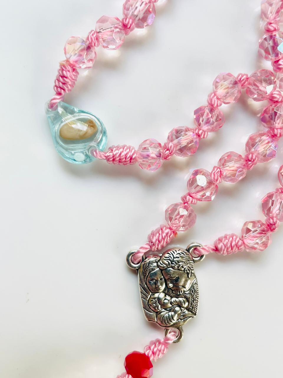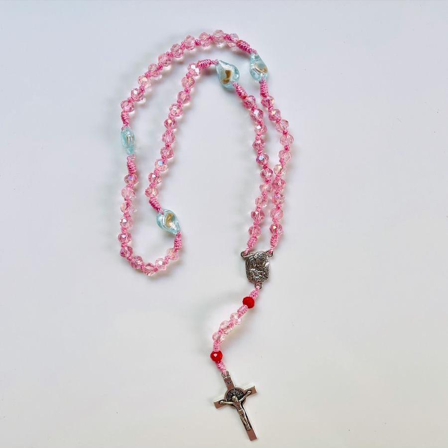 This rosary is an act of love and faith. Each 6mm Czech crystal in a tender pink color represents an unborn soul, and the red beads represent the shed blood, in a powerful reminder of the importance of life. Fastened with a strong Franciscan knot , this accessory is a meaningful prayer tool that allows you to honor life in a special way.