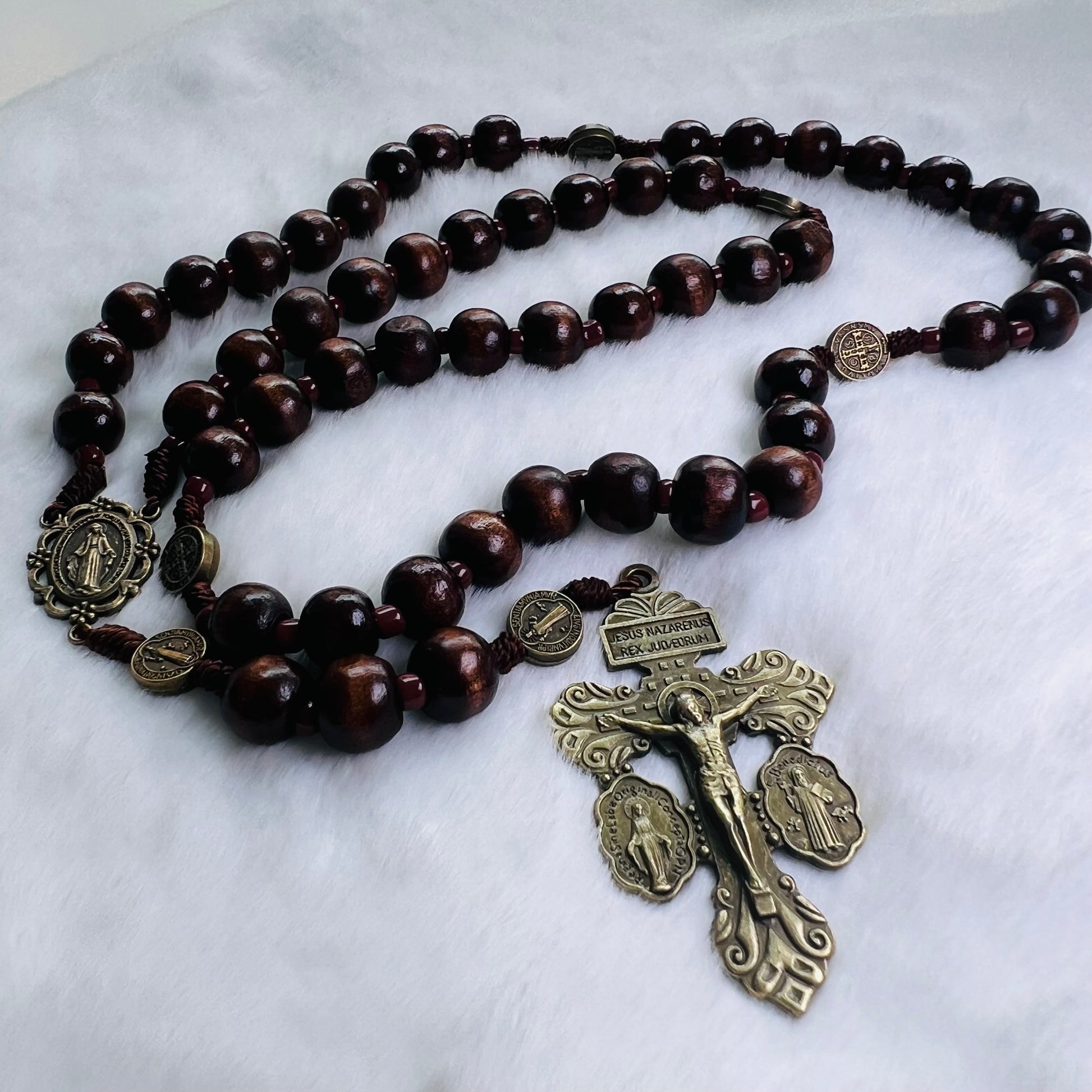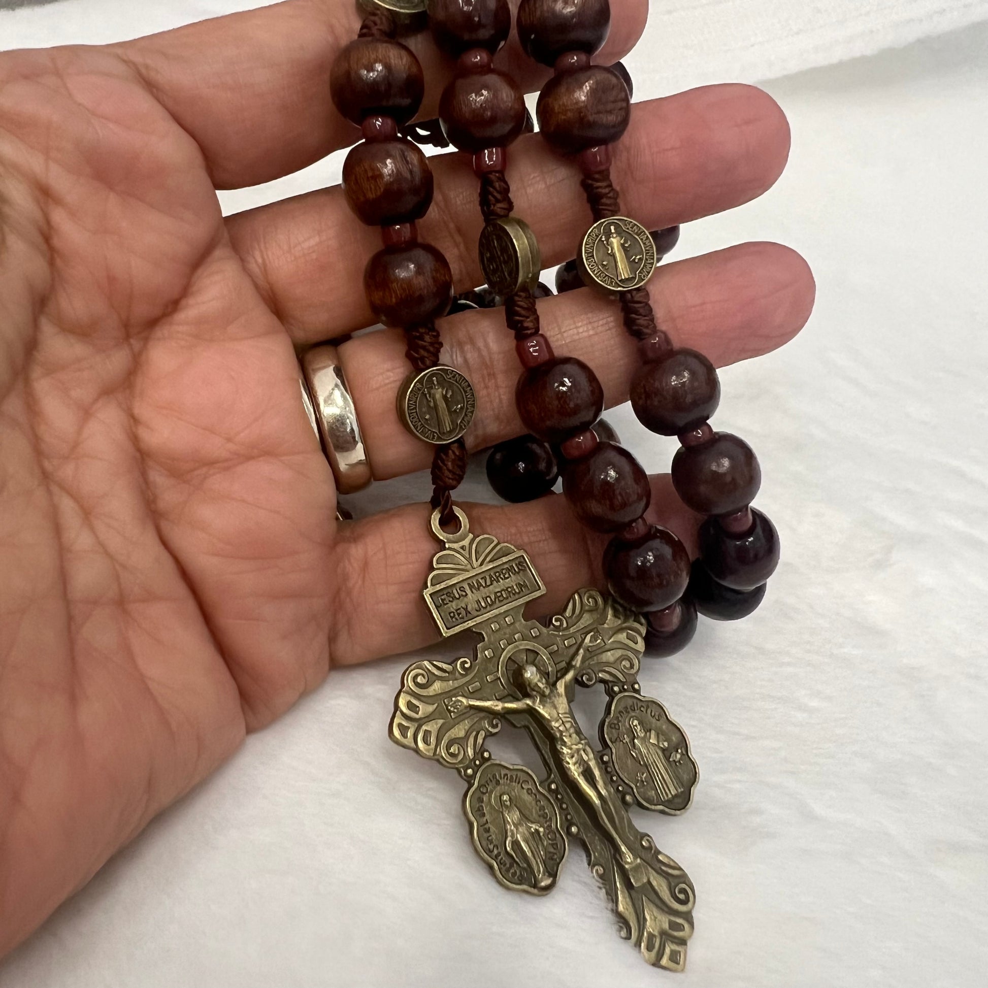 Un rosario que se siente sólido y significativo en tus manos. Hecho con cuentas de madera de 10 mm cuidadosamente engarzadas con el tradicional nudo franciscano, esta camándula de 58 cm es un recordatorio de la fortaleza de la fe. El cordel café complementa el tono natural de la madera, haciendo de esta pieza un compañero de oración duradero y lleno de propósito.Lo que la hace única es la Cruz del Perdón, un símbolo poderoso de la misericordia de Dios.