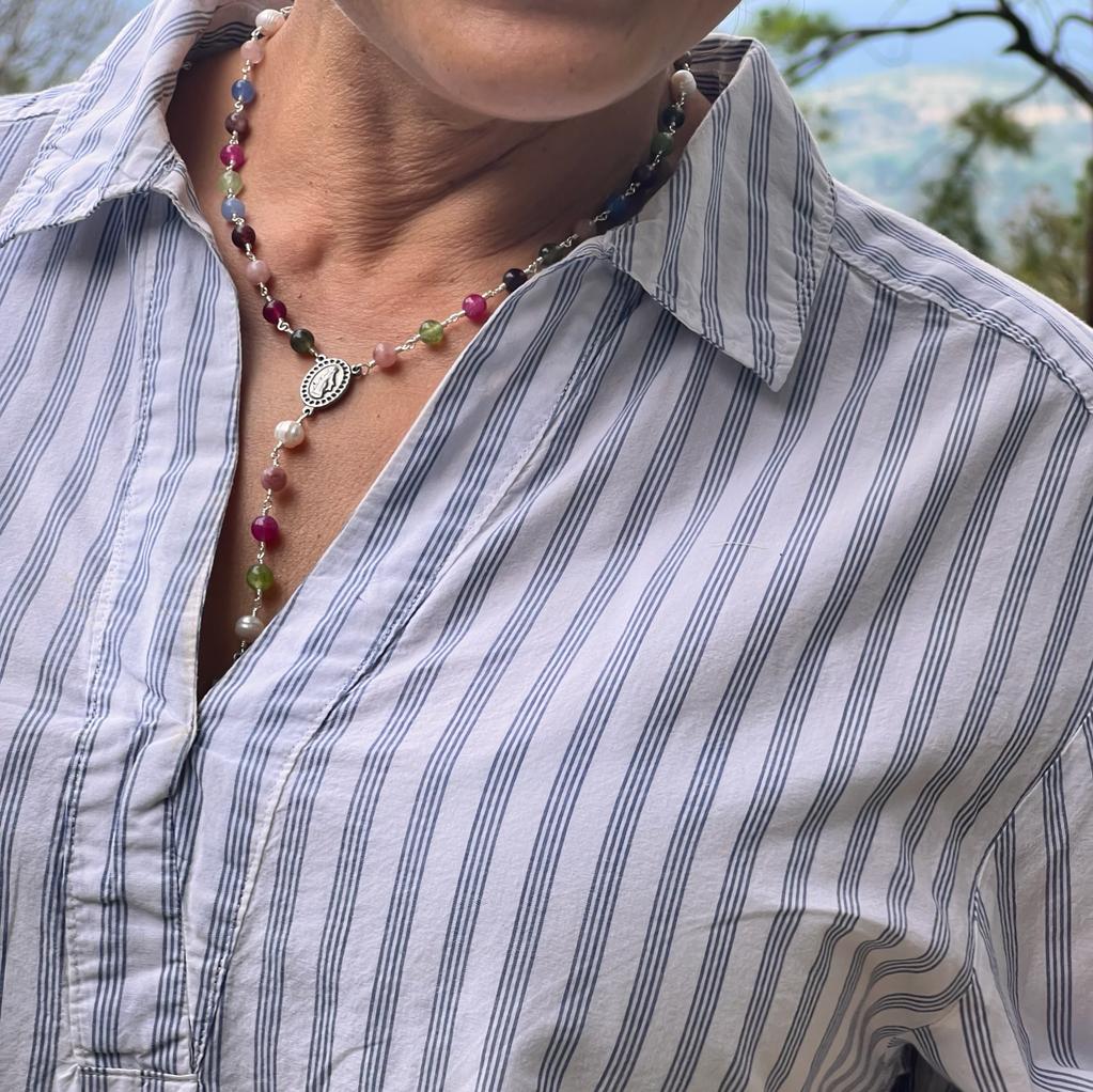 This beautiful necklace combines the beauty of 6mm multicolor agates with the purity of natural pearls. Featuring three mysteries in a unique design, this rosary is carefully wire-wrapped with 925 sterling silver plating .