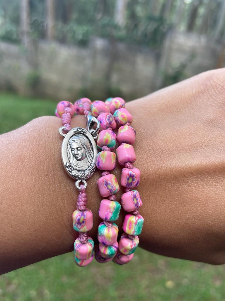 A rosary as tender as a prayer. Made with elongated 6mm polymer clay beads in a delicate pinkish tone, this piece is a symbol of love, purity, and devotion to the Virgin Mary. Each bead has been carefully strung on thread with Franciscan knots for a durable and handcrafted finish.