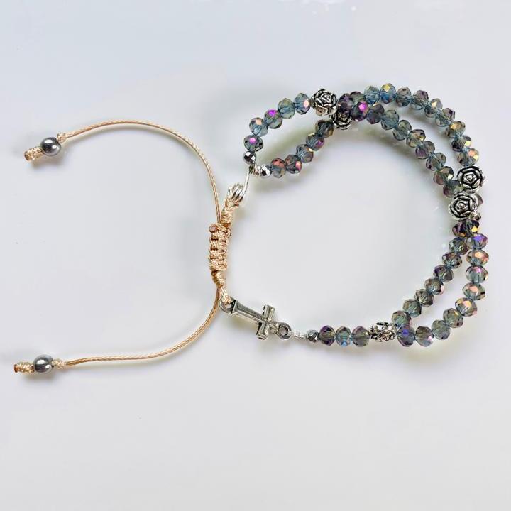 A rosary that shines with the light of grace. This bracelet is made with 3mm crystals in a fascinating iridescent gray color , which sparkle and change color with the light, reminding you of the presence of the divine. Set on a high-strength thread , this piece is both a work of art and an object of devotion.