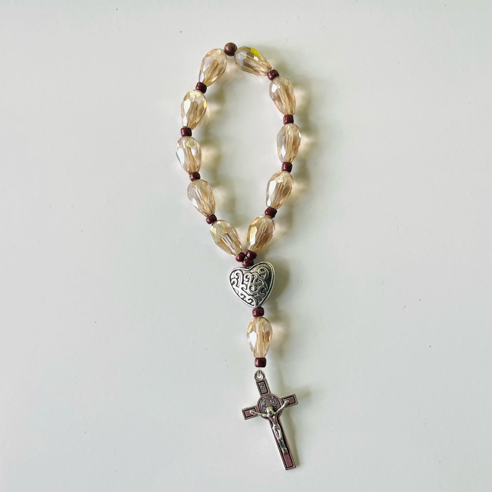 Deja que cada cristal sea una gota de fe que ilumine tu camino. Este denario de cristales ha sido diseñado para ser tu compañero constante, recordándote tu devoción en todo momento.