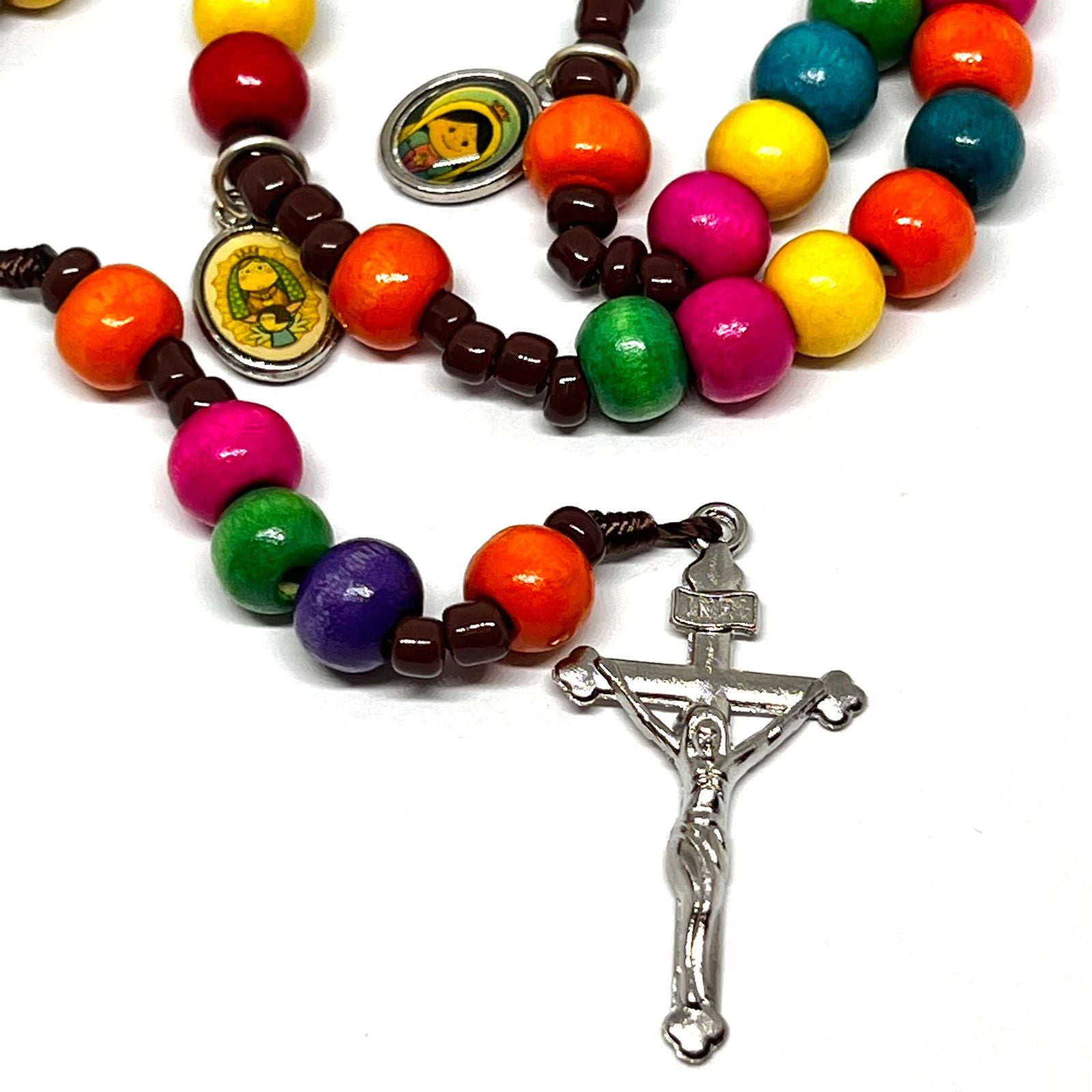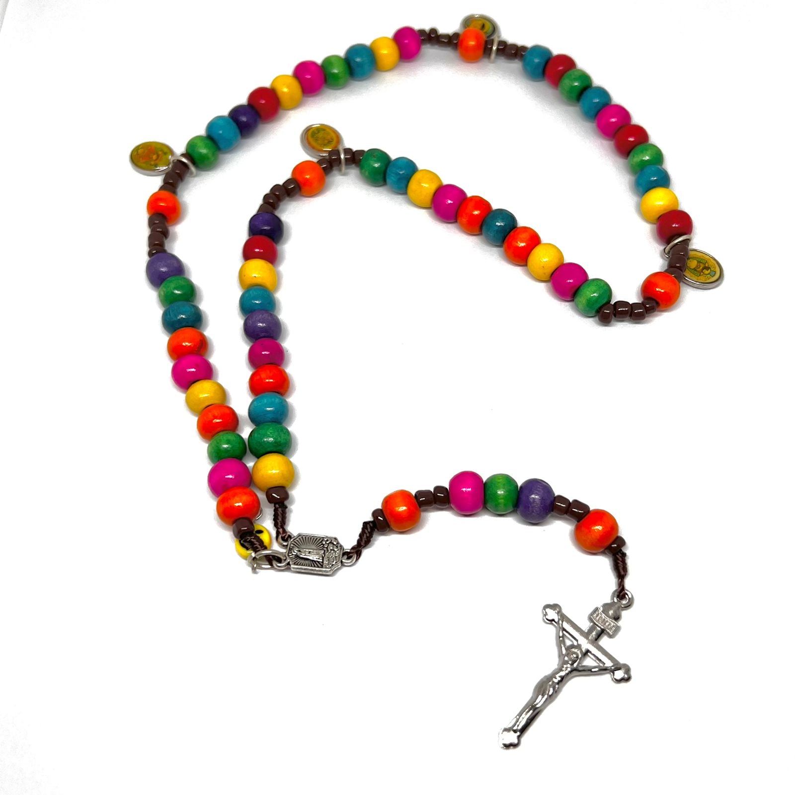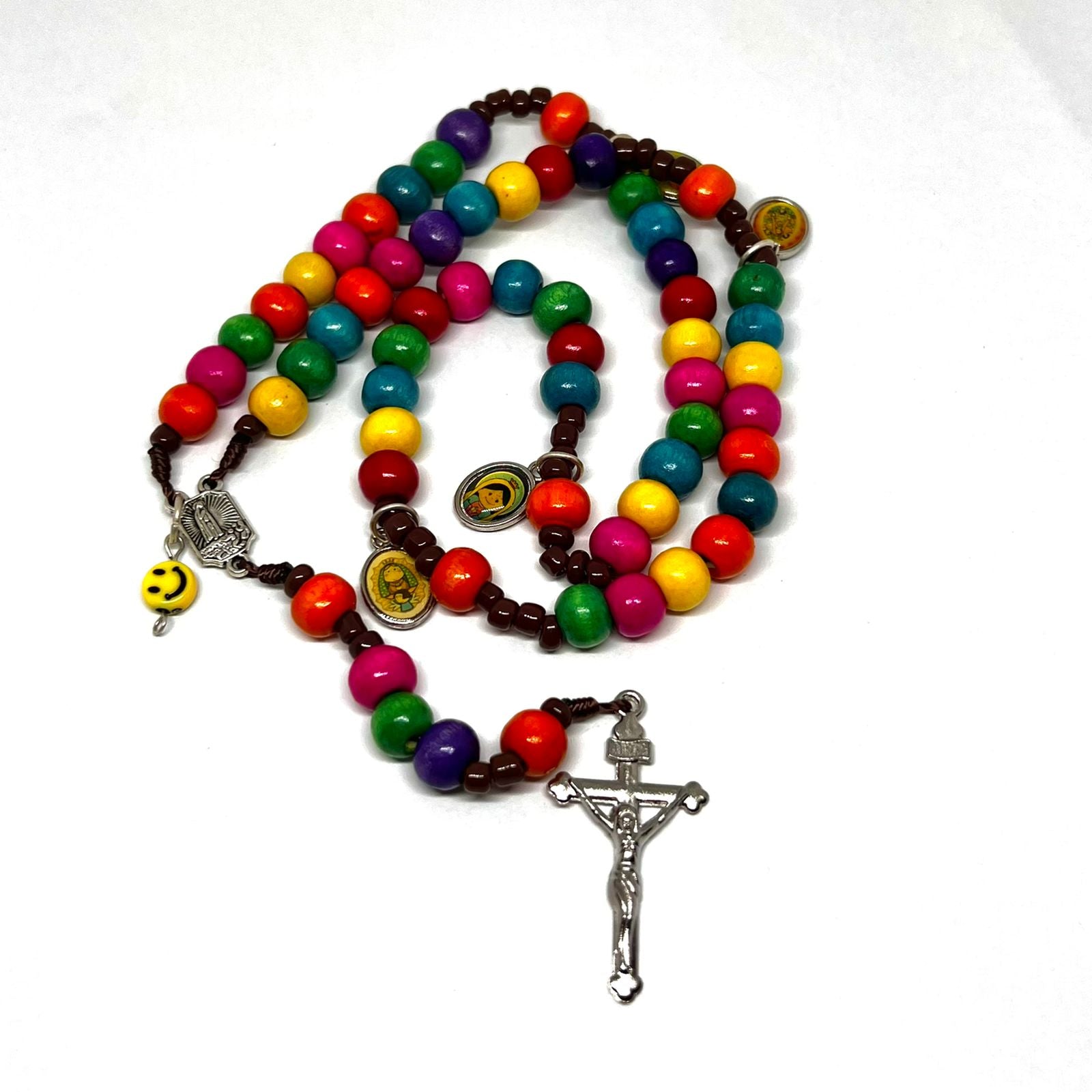 Enseña a los más pequeños el gozo de la oración. Este rosario de madera ha sido creado especialmente para los niños con cuentas de colores vibrantes y adornos de caritas sonrientes. Con este rosario, los niños se sentirán atraídos a rezar y a descubrir el amor de Dios de una manera divertida y alegre.