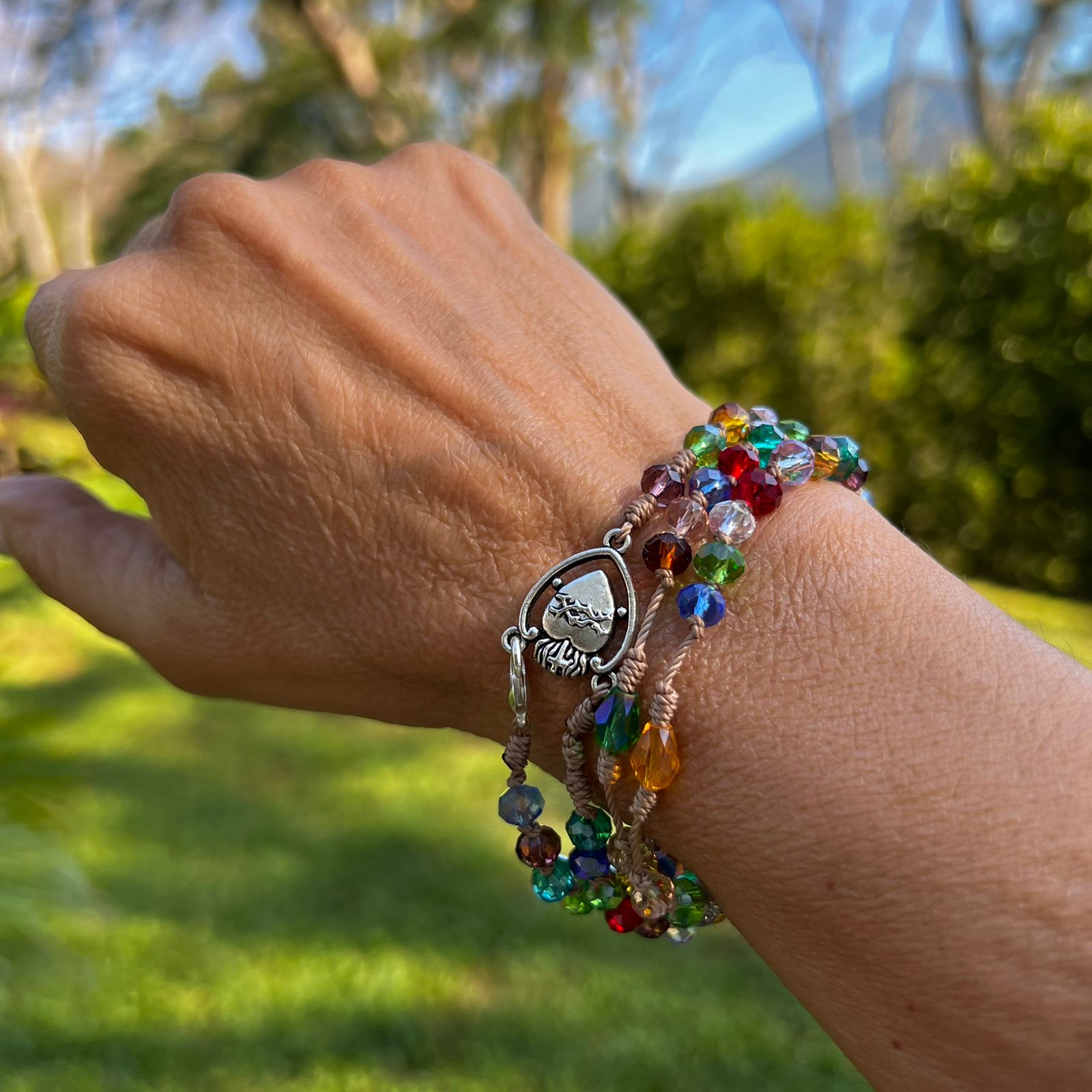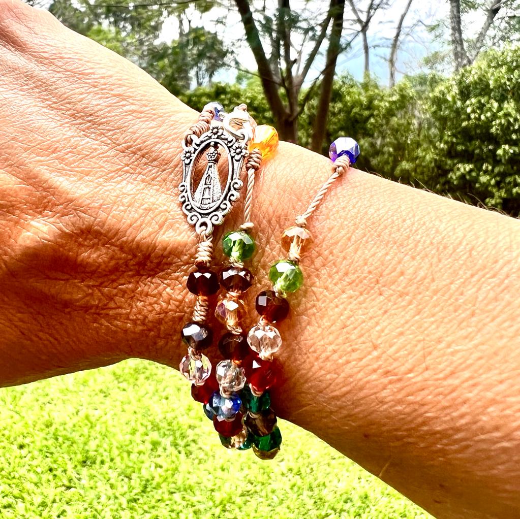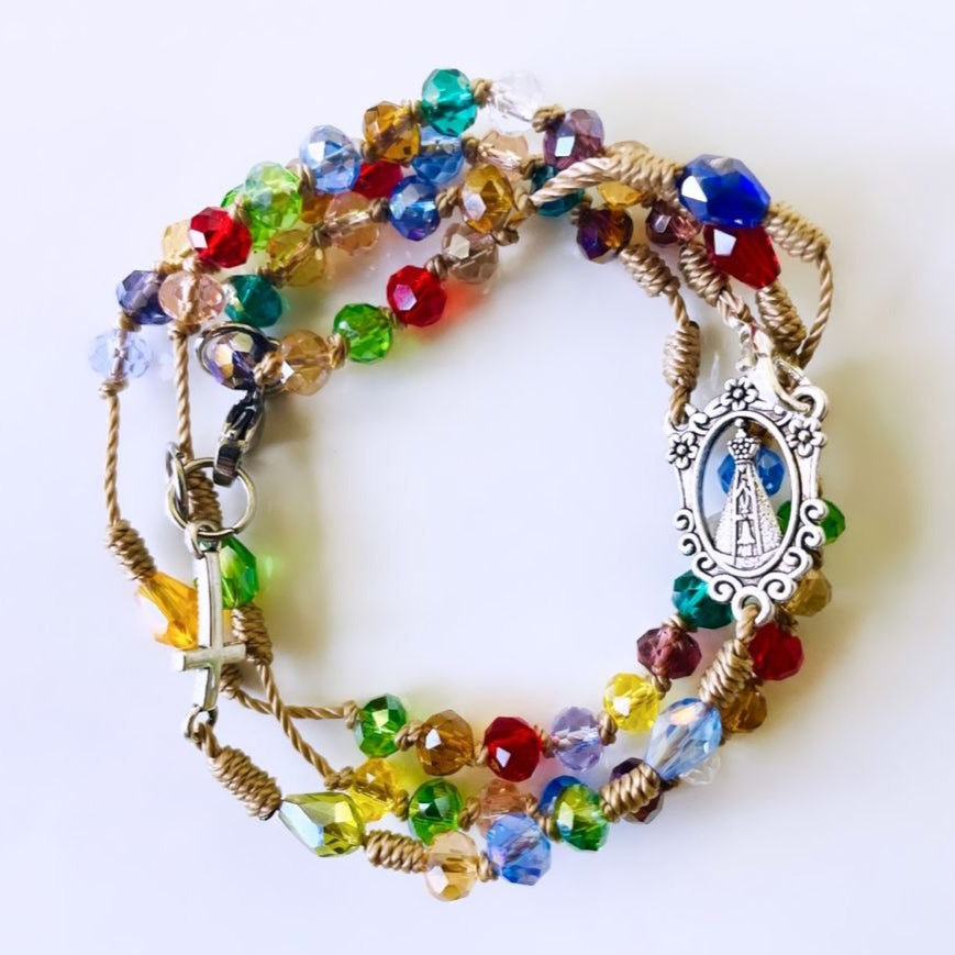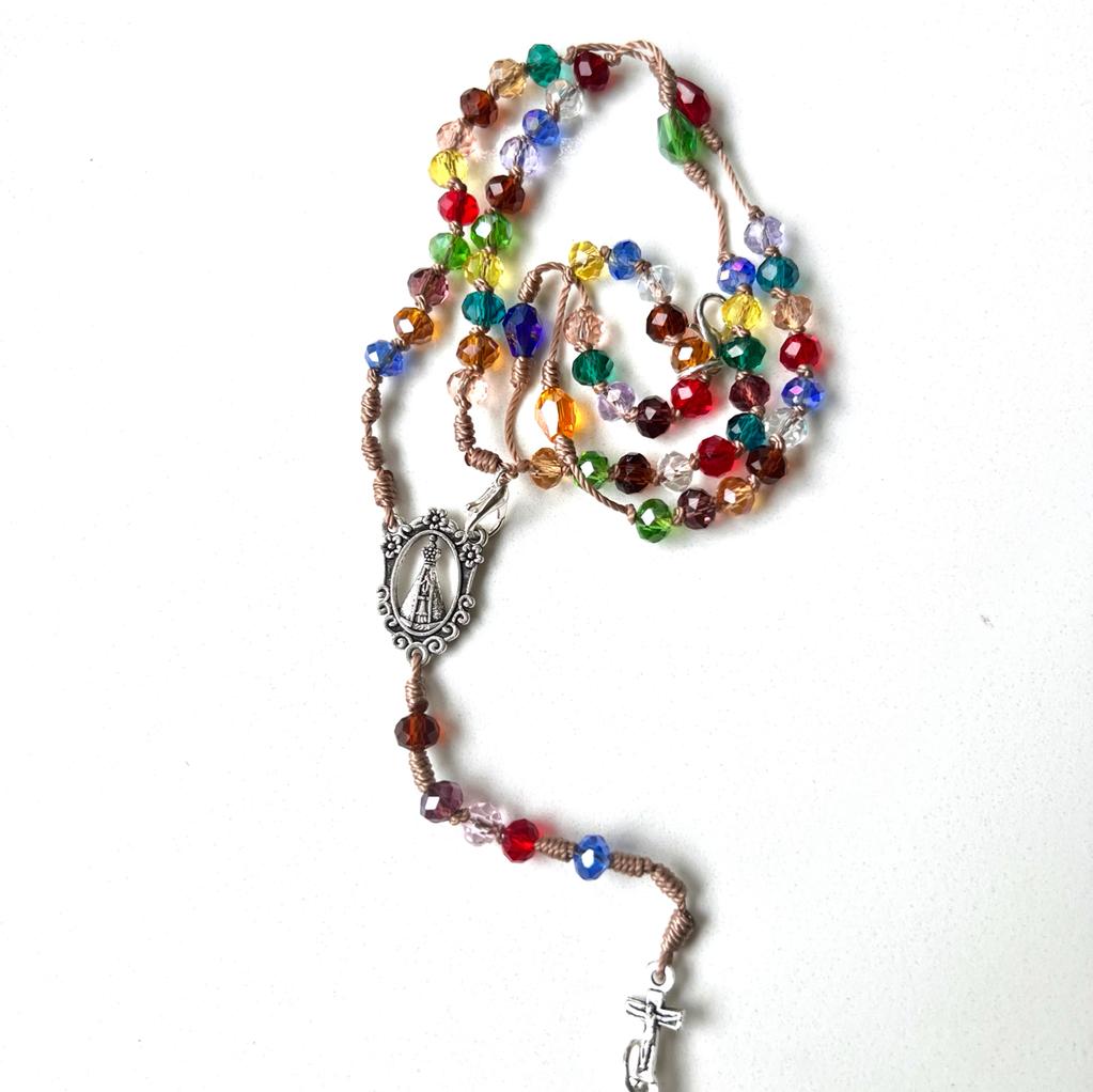 rea tu propia pieza de fe con un toque de luz. Este rosario, elaborado con auténtico cristal checo de 6 mm transparente y multicolor, captura la luz y el color en cada cuenta. Las perlas están finamente engarzadas en un cordel con los clásicos nudos franciscanos, uniendo la tradición con una belleza moderna.