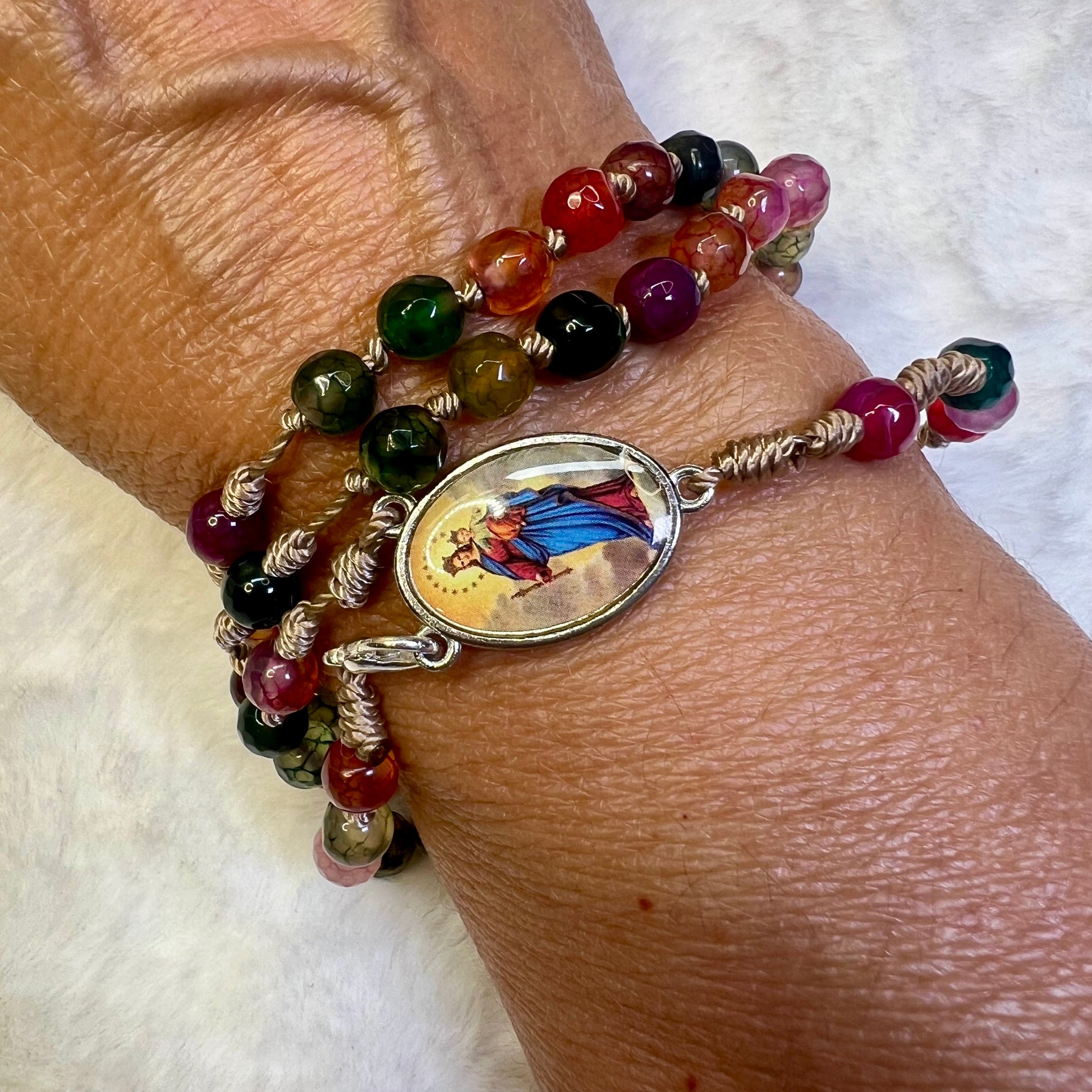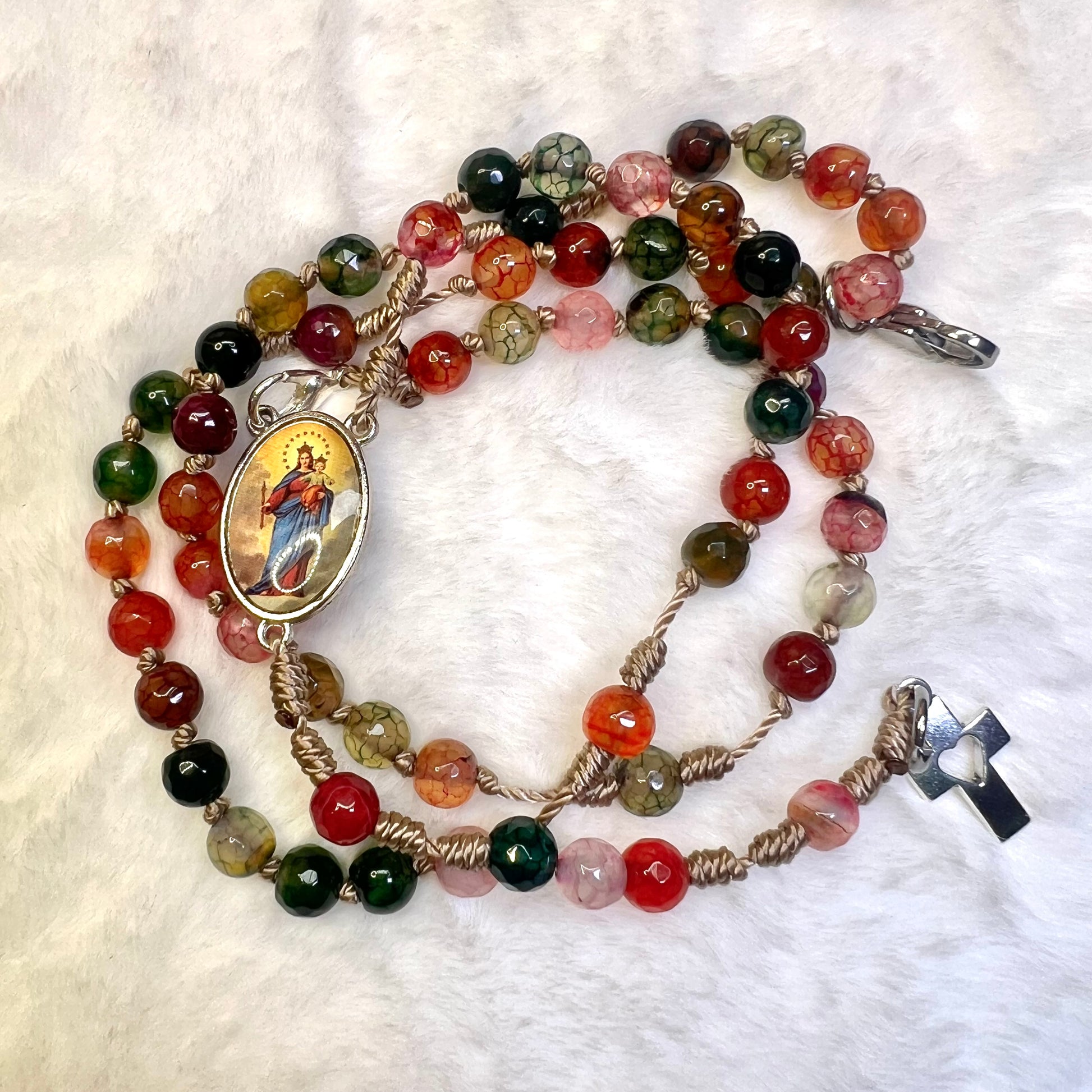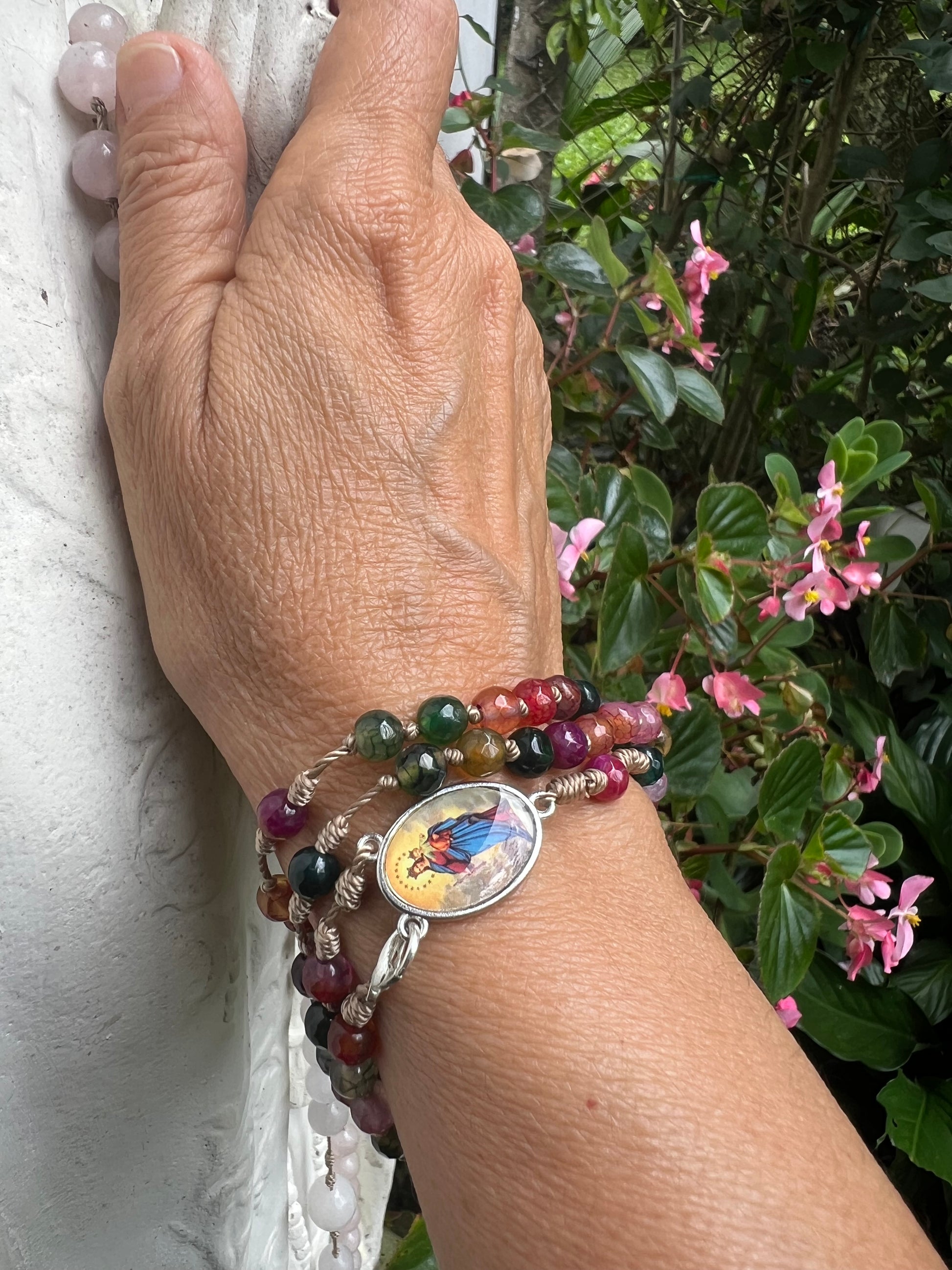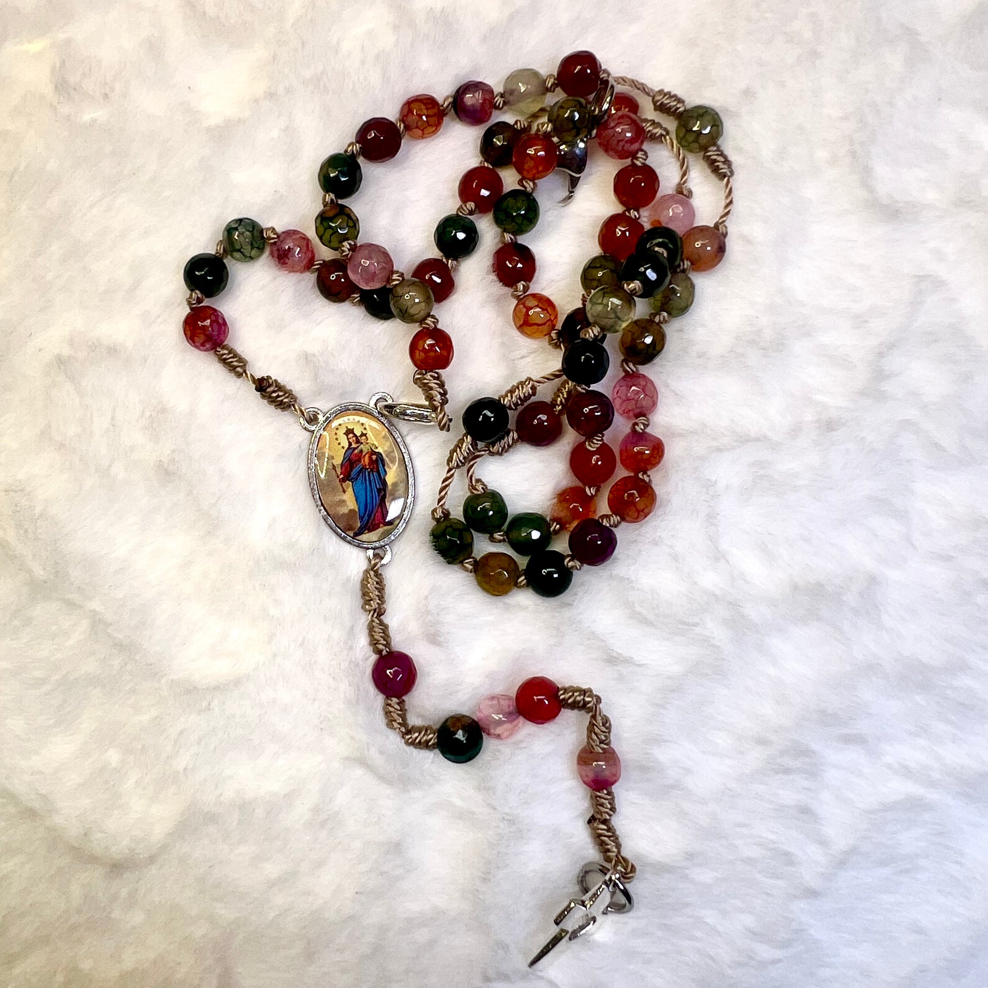 Una pieza de fe hecha para ti, inspirada en las historias de devoción más bellas. Este rosario, con cuentas de piedra natural Ágata fasceteada de 6mm, irradia una luz única. Cada cuenta ha sido unida con nudos franciscanos, un símbolo de fe profunda. Los accesorios de pewter son el complemento perfecto, pero lo que hace especial a este rosario es su colección de cuatro medallitas sagradas: una ovejita que representa la pureza, un crucifijo de amor infinito, un San Benito para la protección, y Santa Teresita del niño Jesús como un recordatorio de la sencillez en la fe. Puedes usarlo como pulsera, collar, camándula o como tu guía de oración. Crea la pieza que mejor se adapte a tu fe.
