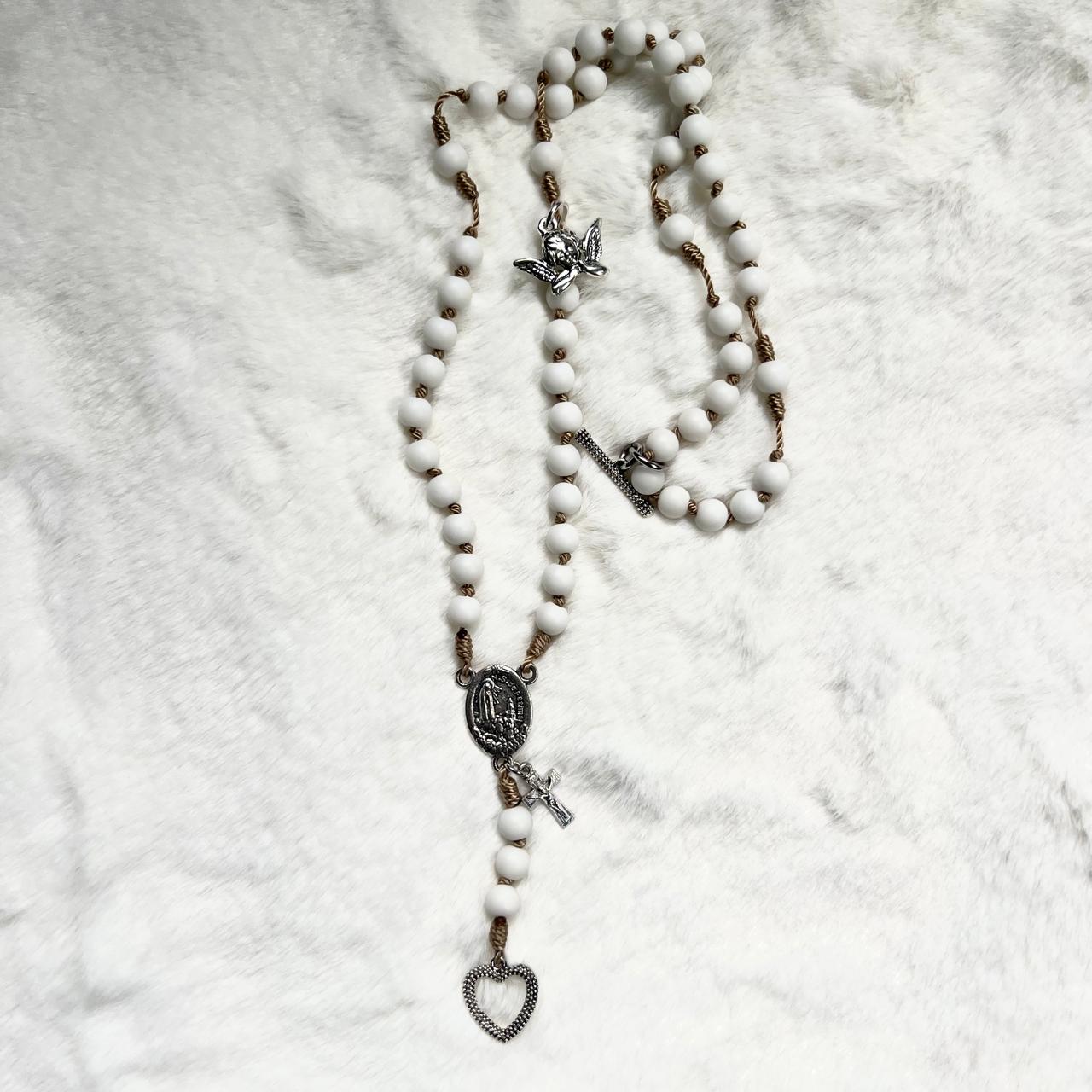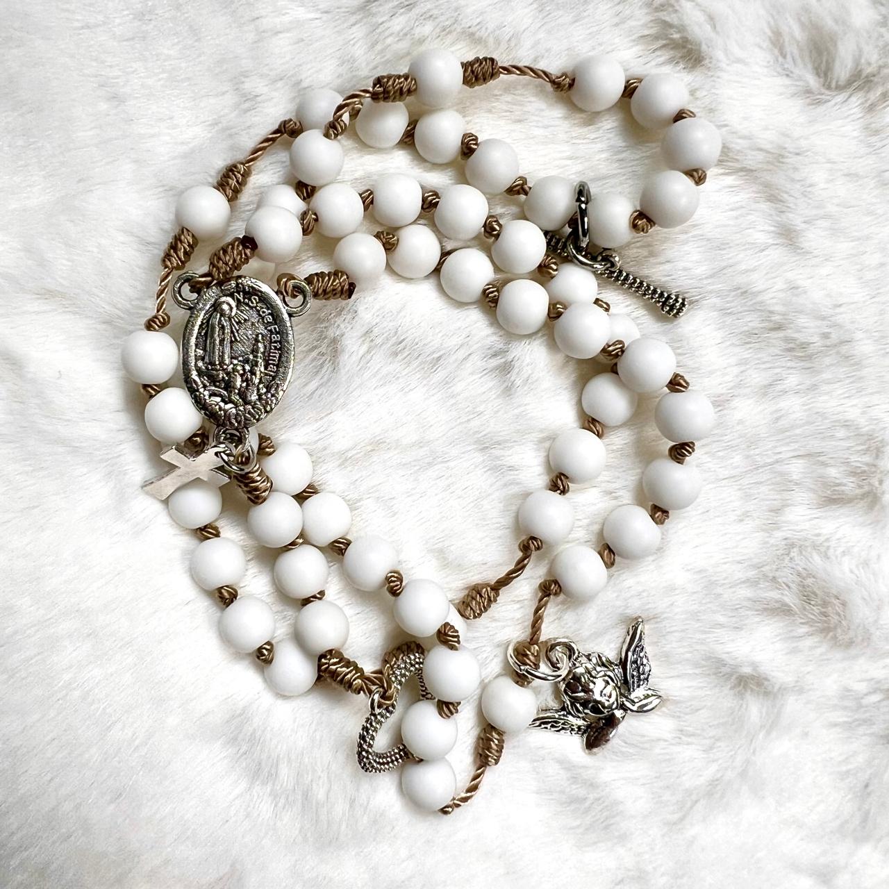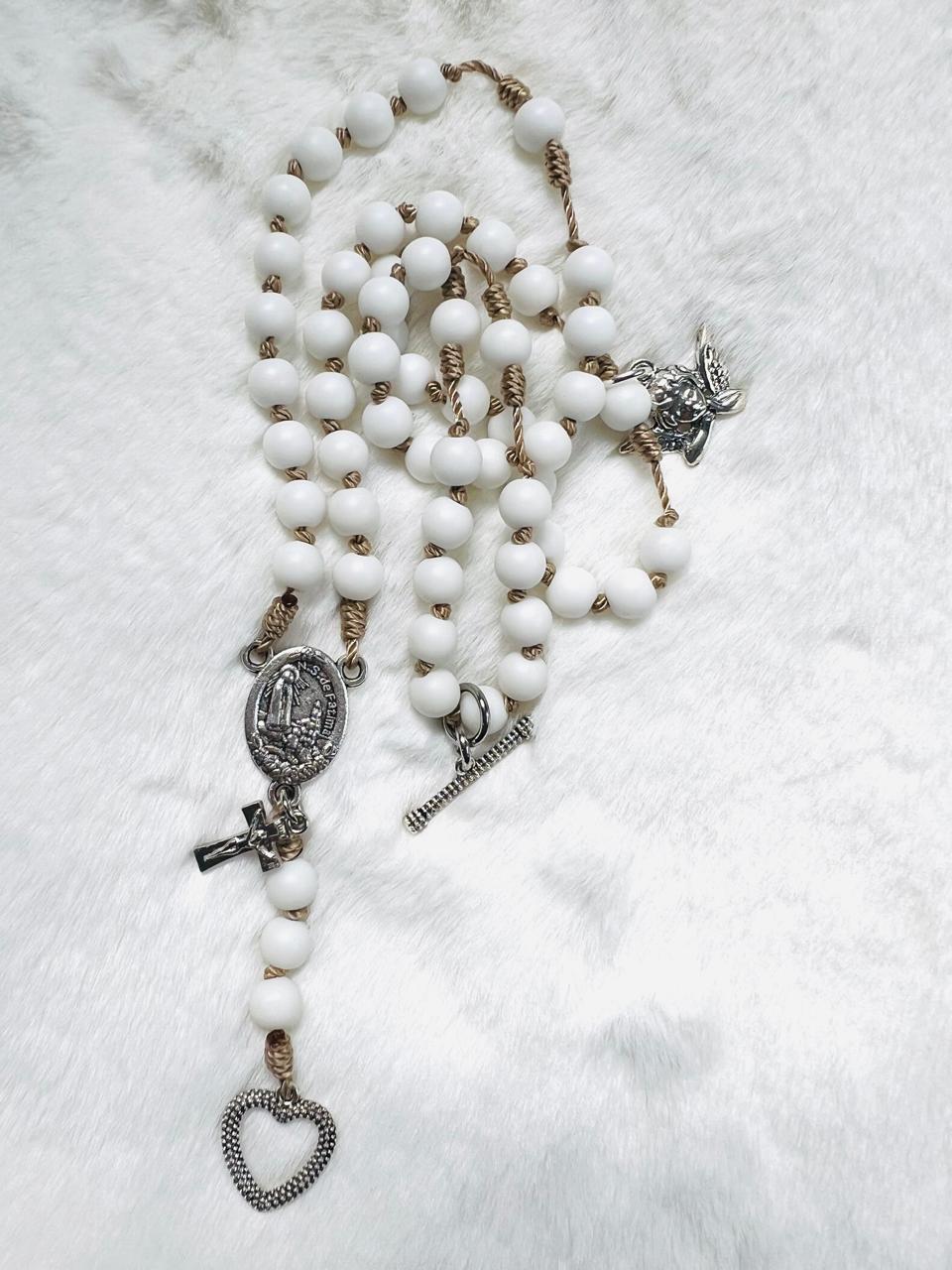 Un regalo de fe y un tesoro para toda la vida. Este elegante rosario está hecho con cuentas de ónix blanco de 6 mm, una piedra que simboliza la pureza y la inocencia. Cuidadosamente engarzado a mano con nudos franciscanos, este rosario es el complemento ideal para momentos especiales. Ideal para celebrar: Es la elección perfecta para bautizos, primeras comuniones, confirmaciones y, en el día de tu boda, como el rosario de la novia. Hecho para ti: Hazlo aún más especial. Podemos personalizarlo con uno o varios nombres de tu preferencia (por un costo adicional). el cierre es broche tipo T para facilitar la puesta.