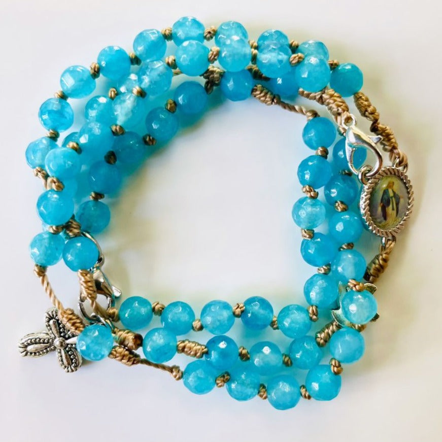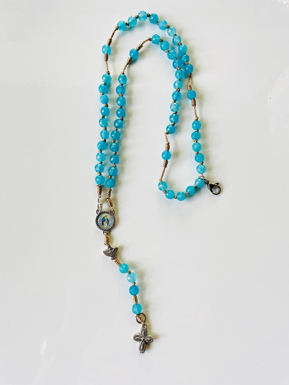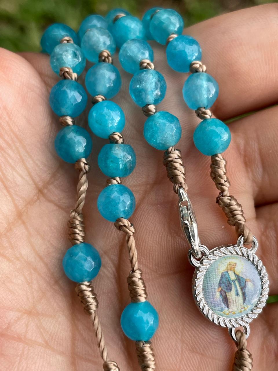 Este rosario es un testimonio de que la fe verdadera reside en la simplicidad. Elaborado con piedras naturales de ágatas lisas Celeste de 6mm en un color, su superficie pulida y elegante invita a la meditación tranquila. Engarzado con el tradicional nudo franciscano y accesorios de piuter, es una pieza hermosa.