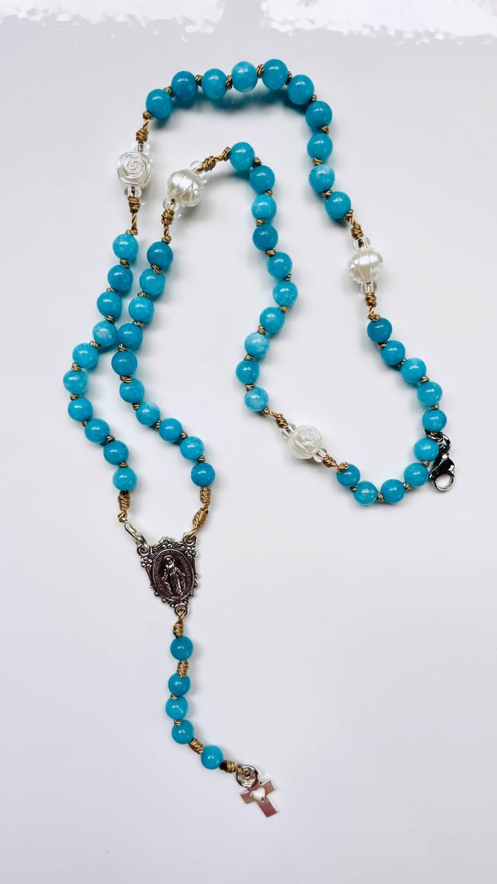 Illuminate your prayer with a touch of magic. This rosary is made with 6mm agate stones in a captivating iridescent purple color , which sparkle and change color with the light, reminding you of the beauty of faith. Set with Franciscan knots and pewter accessories, this piece is both a work of art and an object of devotion.