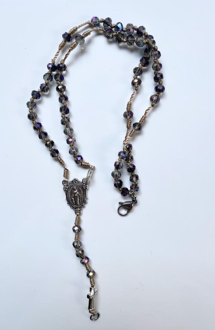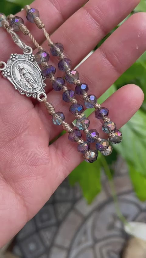 Illuminate your prayer with the brilliance of grace. This rosary is crafted with 6mm Czech crystals that sparkle with an iridescent effect , capturing light and transforming it into a rainbow of celestial colors. Set with the Franciscan knot, each bead will remind you of the beauty of creation and the unconditional love of the Virgin Mary.
