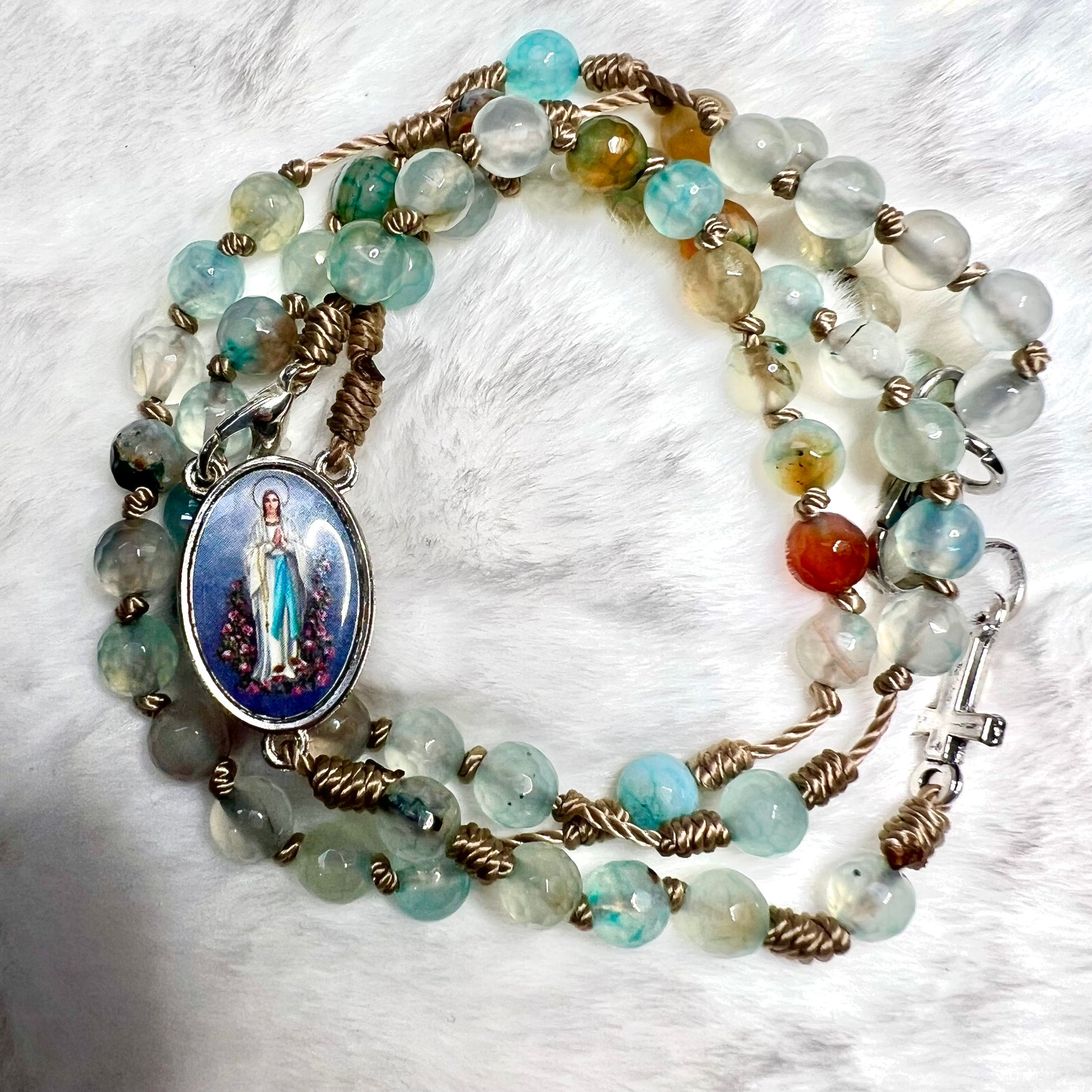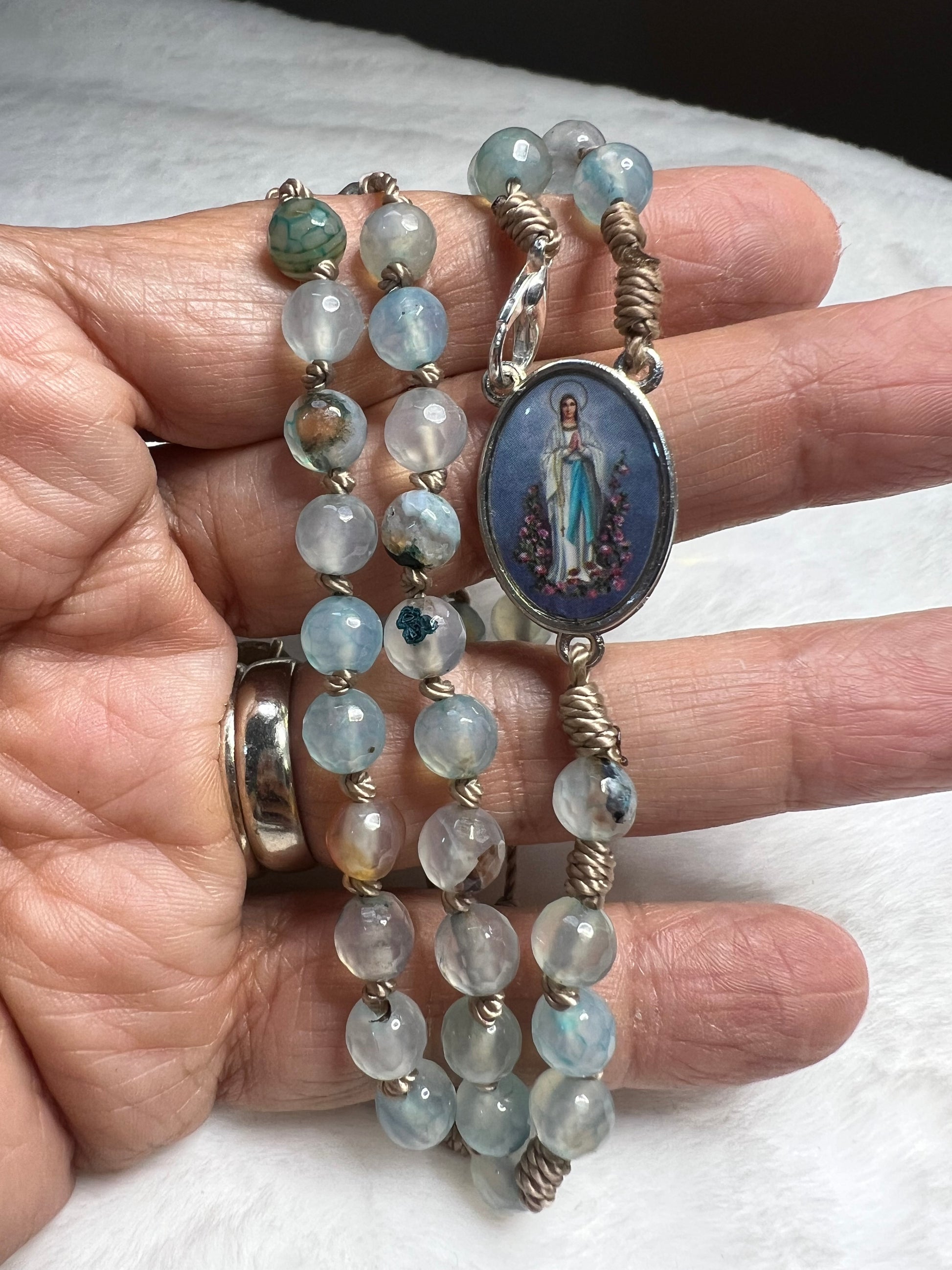 A rosary that celebrates the beauty of simplicity. Made with authentic 6mm natural agates in a color of your choice, each bead possesses unique beauty. Hand-strung with cord and Franciscan knots, this piece is a reminder that the greatest faith is found in the simplest and most unique gestures. Pewter accessories give it a durable and elegant finish.