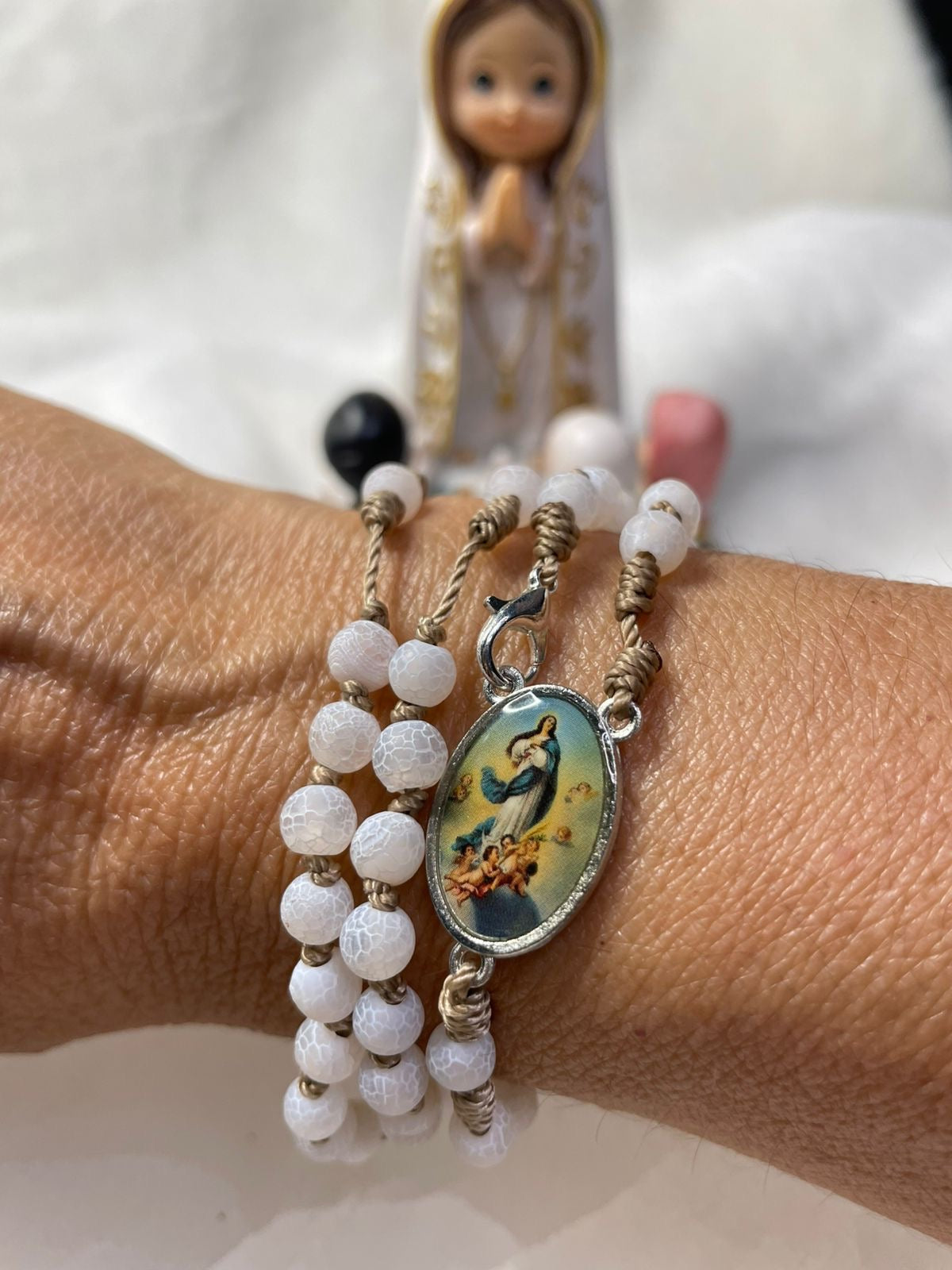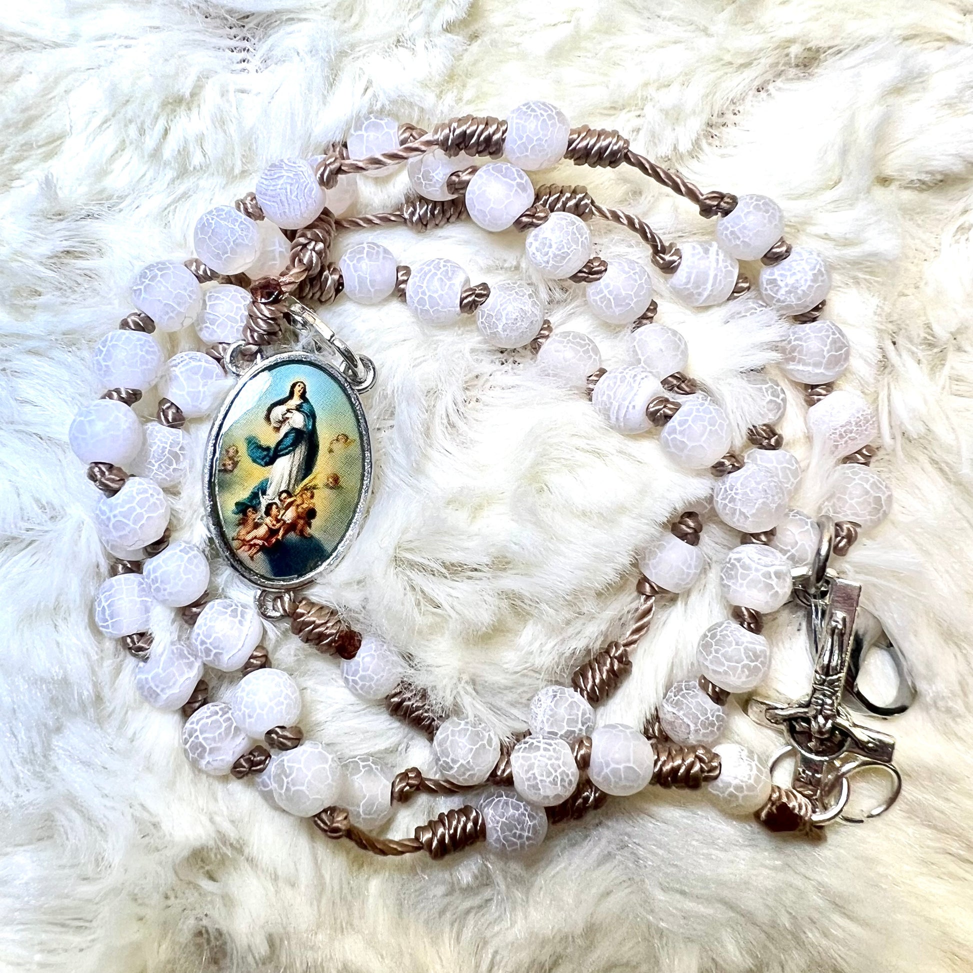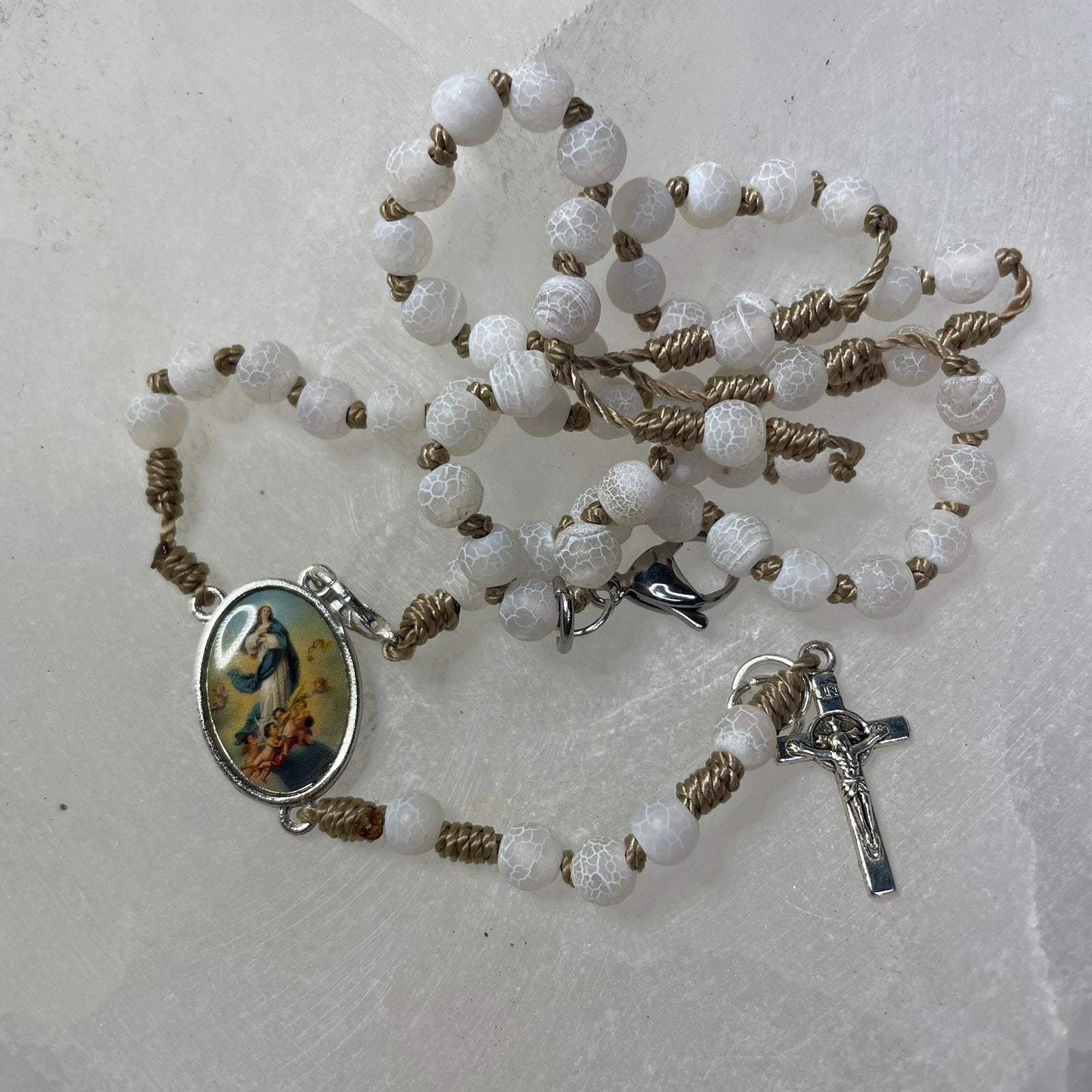 It is a design full of purity and light: made with 6mm white, crackled natural stones, carefully set in a Franciscan knot, which gives it a very special, handcrafted and devotional touch.