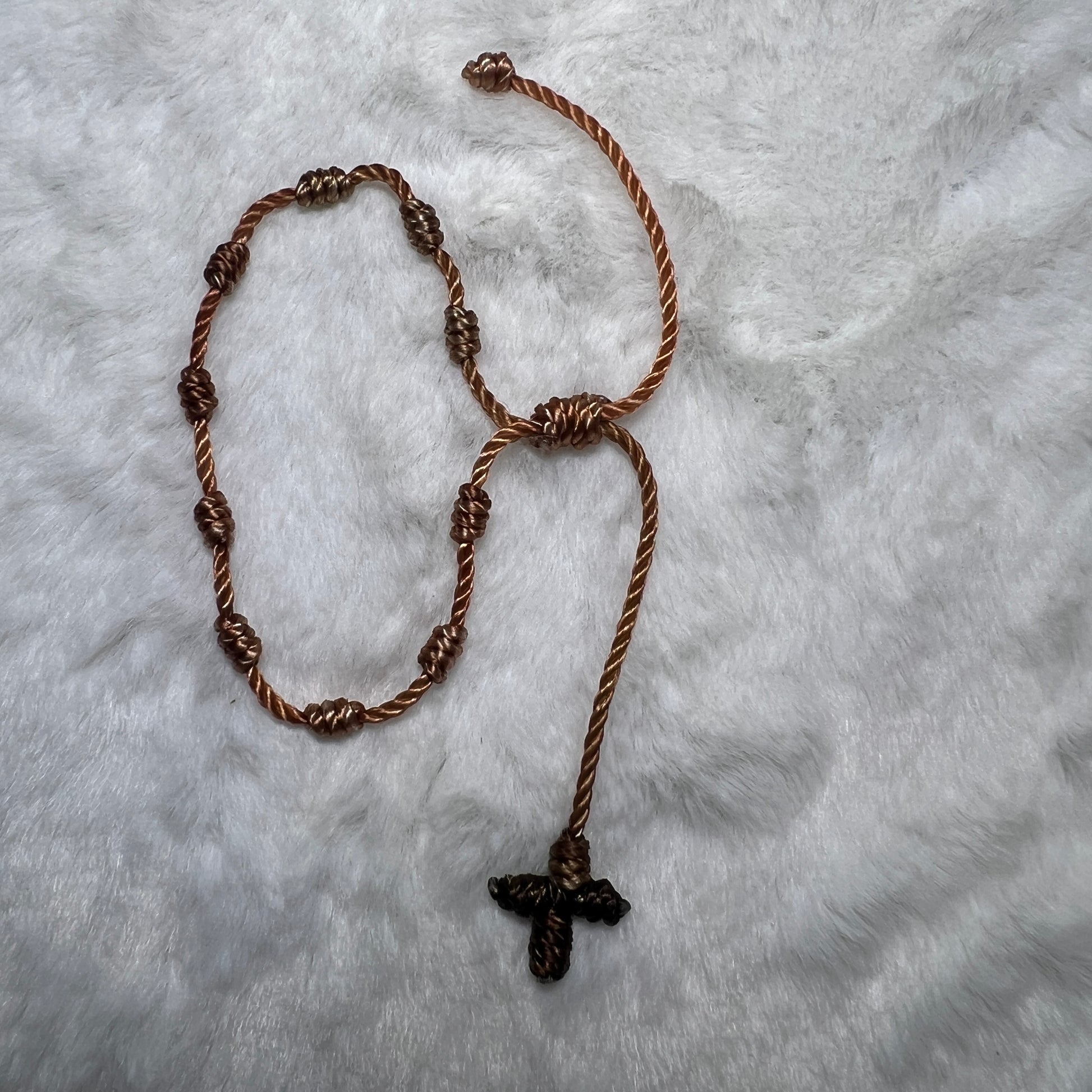 Este rosario decenario ajustable está hecho a mano con el sagrado nudo franciscano, un recordatorio tangible de tu devoción. Su tamaño compacto y su diseño de nudos lo hacen perfecto para llevar en tu bolso o bolsillo. Llévalo siempre contigo y ten tu fe a la mano para una oración rápida o como un recordatorio diario de tu propósito."