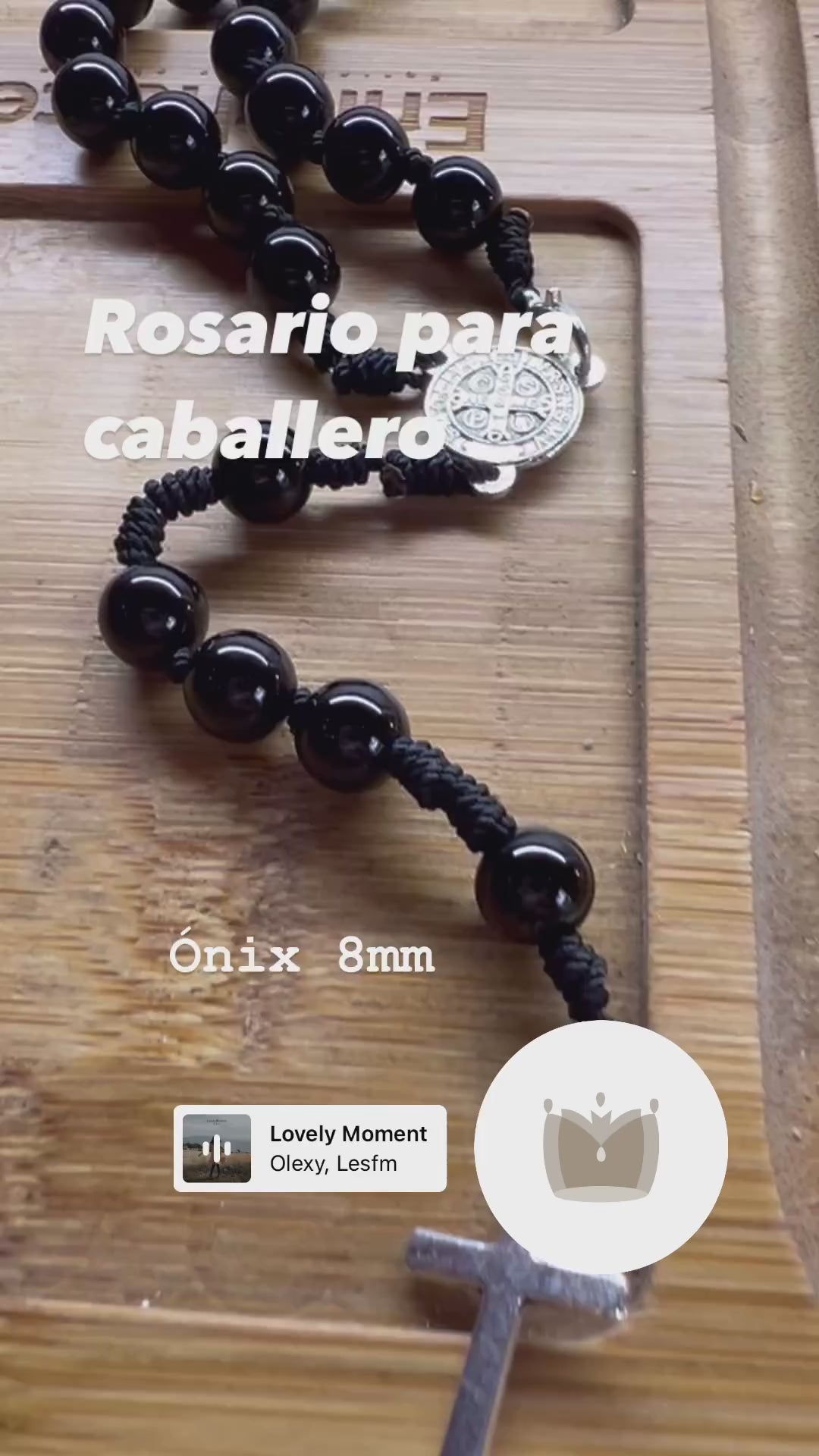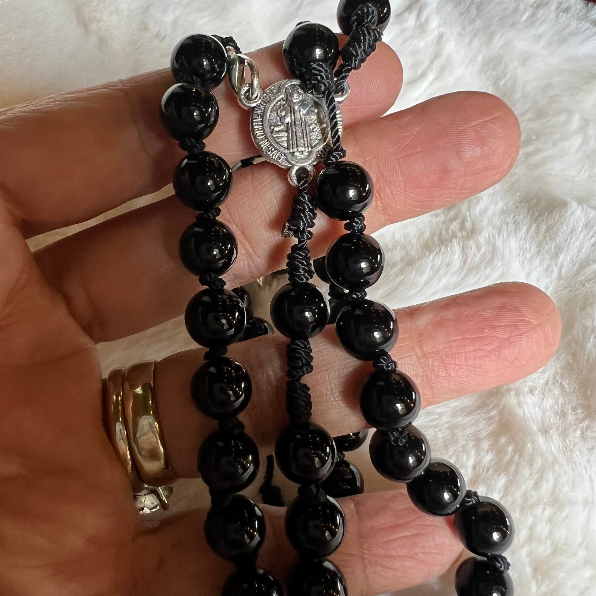 Rosary knotted in the Franciscan style, on black cord, with 8mm beads and pewter silver accessories.