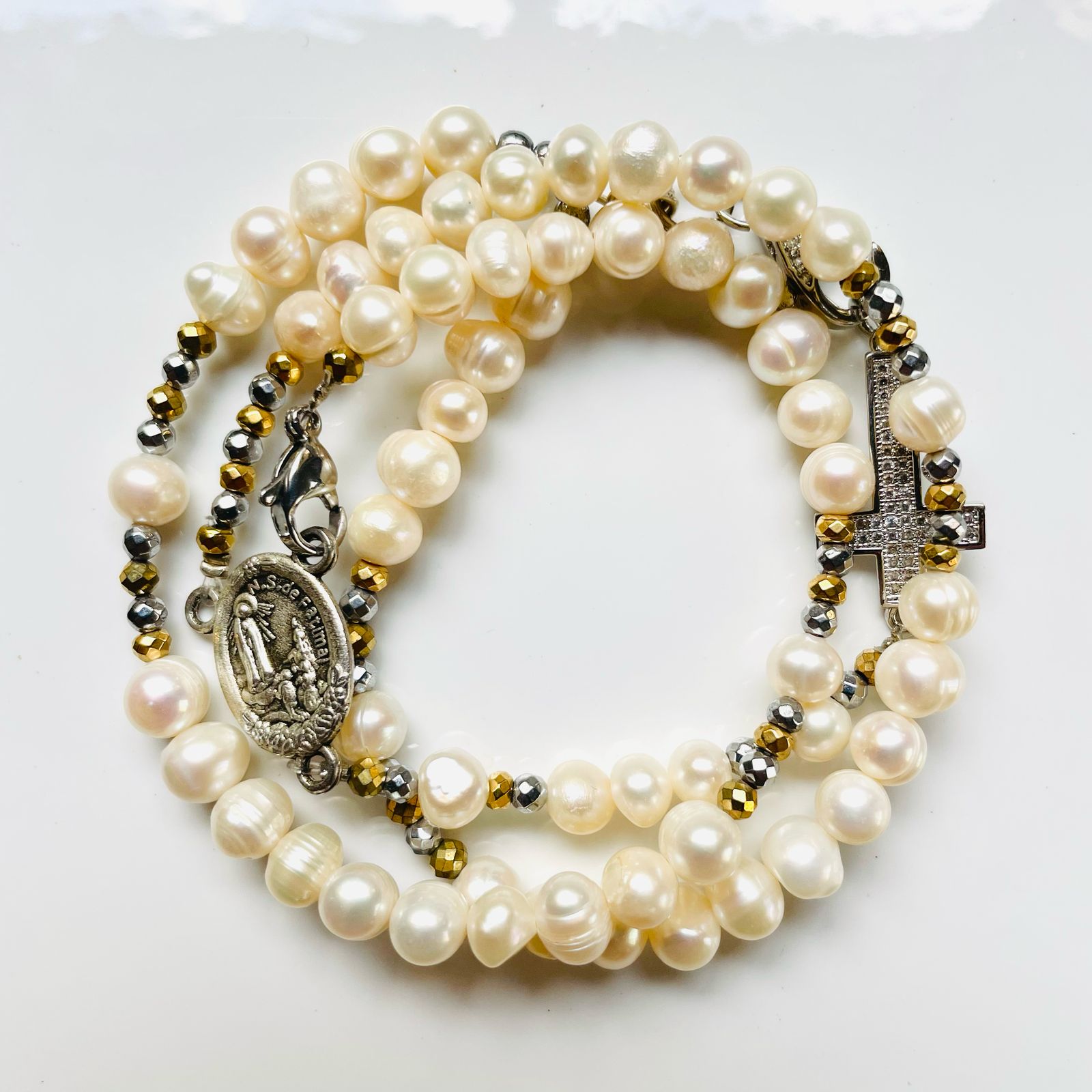 Siente la pureza y la paz en cada rezo. Este rosario ha sido creado con luminosas perlas blancas de 6mm, un símbolo de inocencia y gracia divina. Engarzado a mano en un resistente hilo de nailon, su diseño es a la vez simple y elegante.