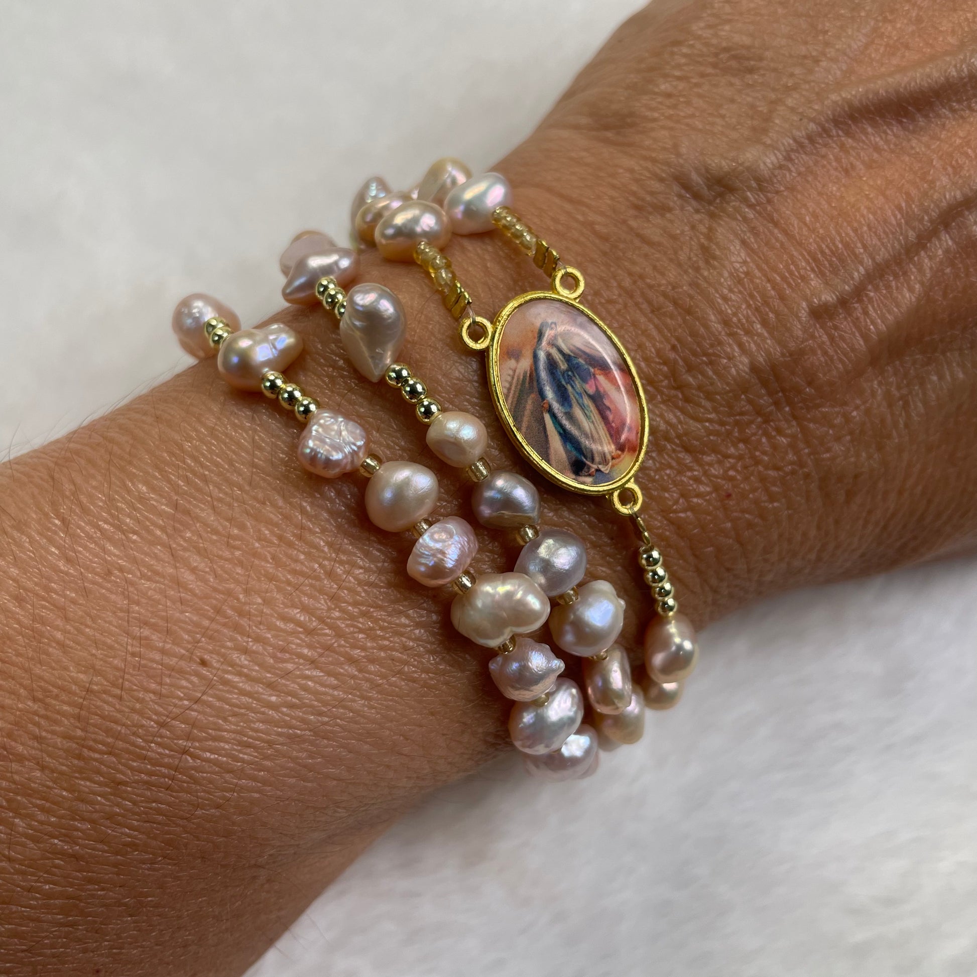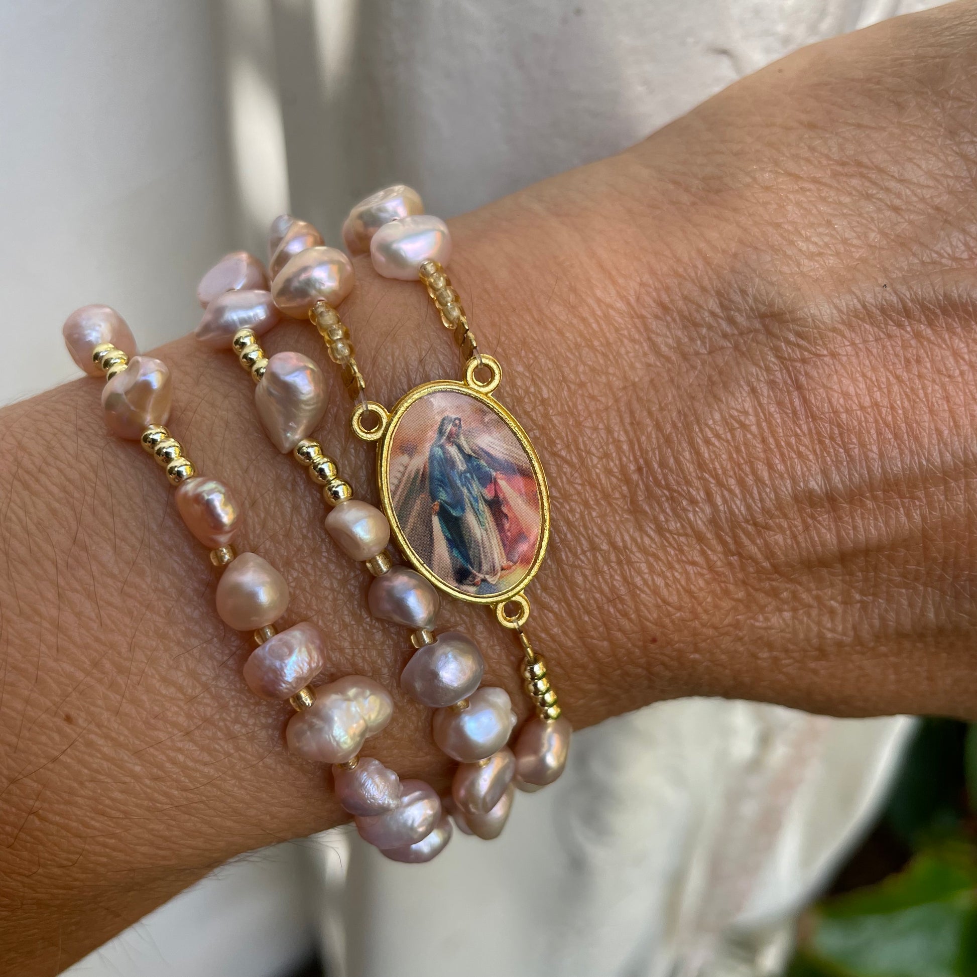 Este rosario pulsera está elaborado con hermosas perlas rosas de 6mm engarzadas en nailon, y complementadas con accesorios en un brillante baño de oro de 18k. Su diseño es perfecto para llevarlo como pulsera o, lo más importante, para encontrar la paz en la oración.