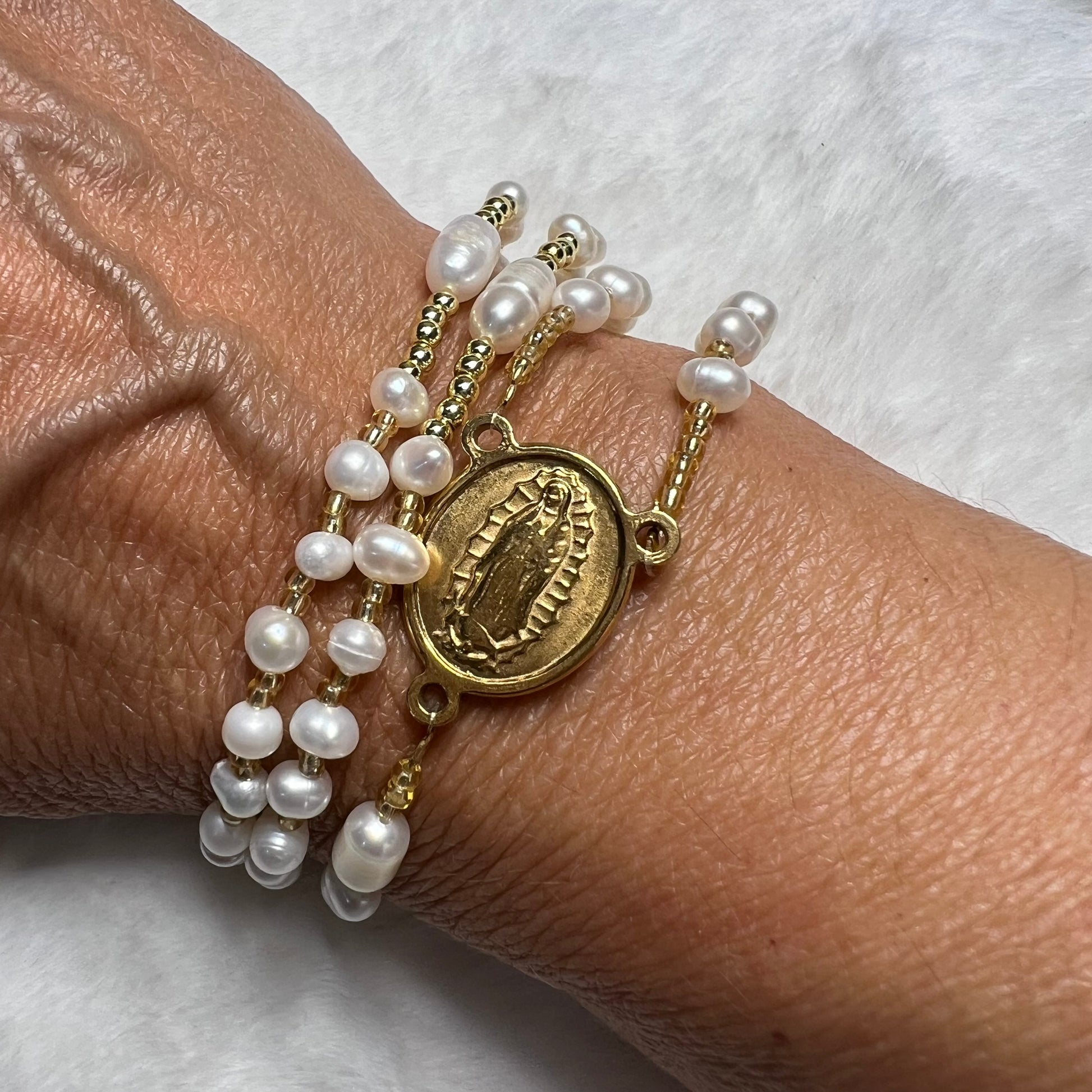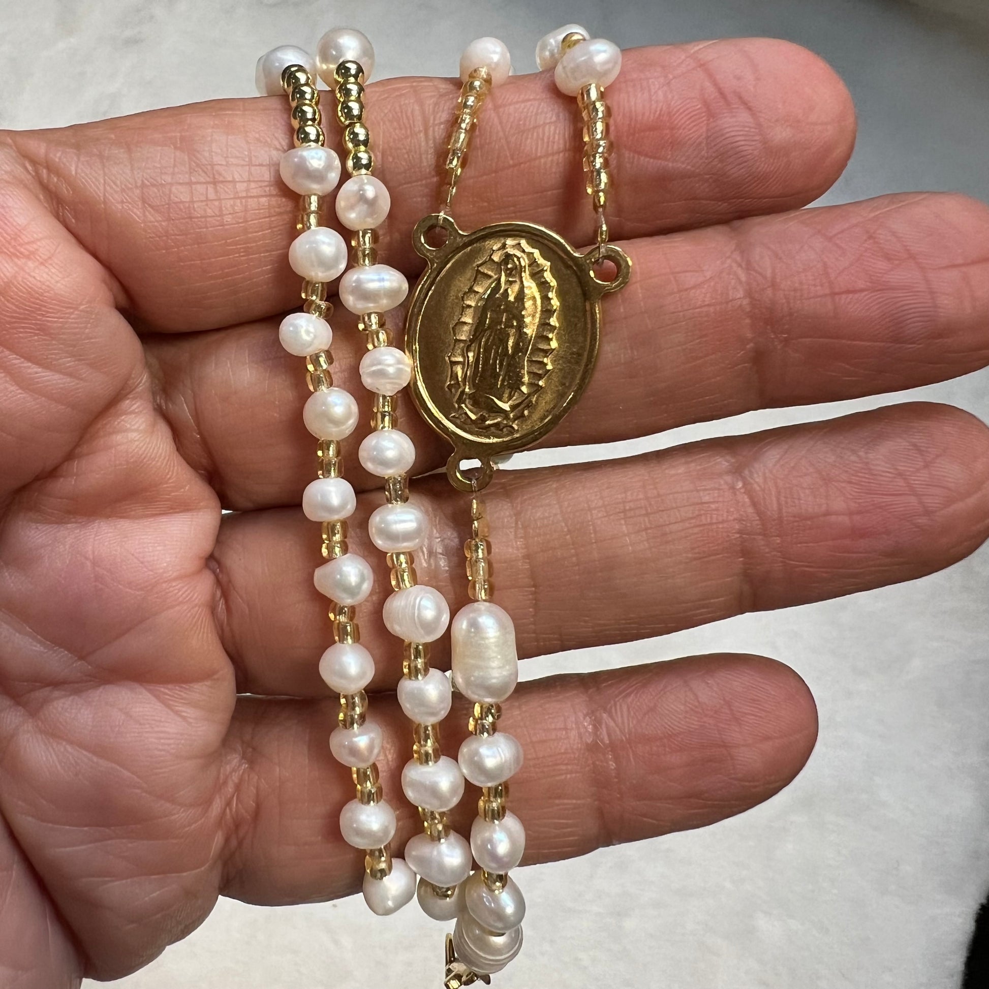 Nylon-beaded rosary. Made with 4 mm natural white pearls, gold-plated steel accessories, and amethyst. Wear it as a bracelet or necklace, and most importantly, use it for prayer.
