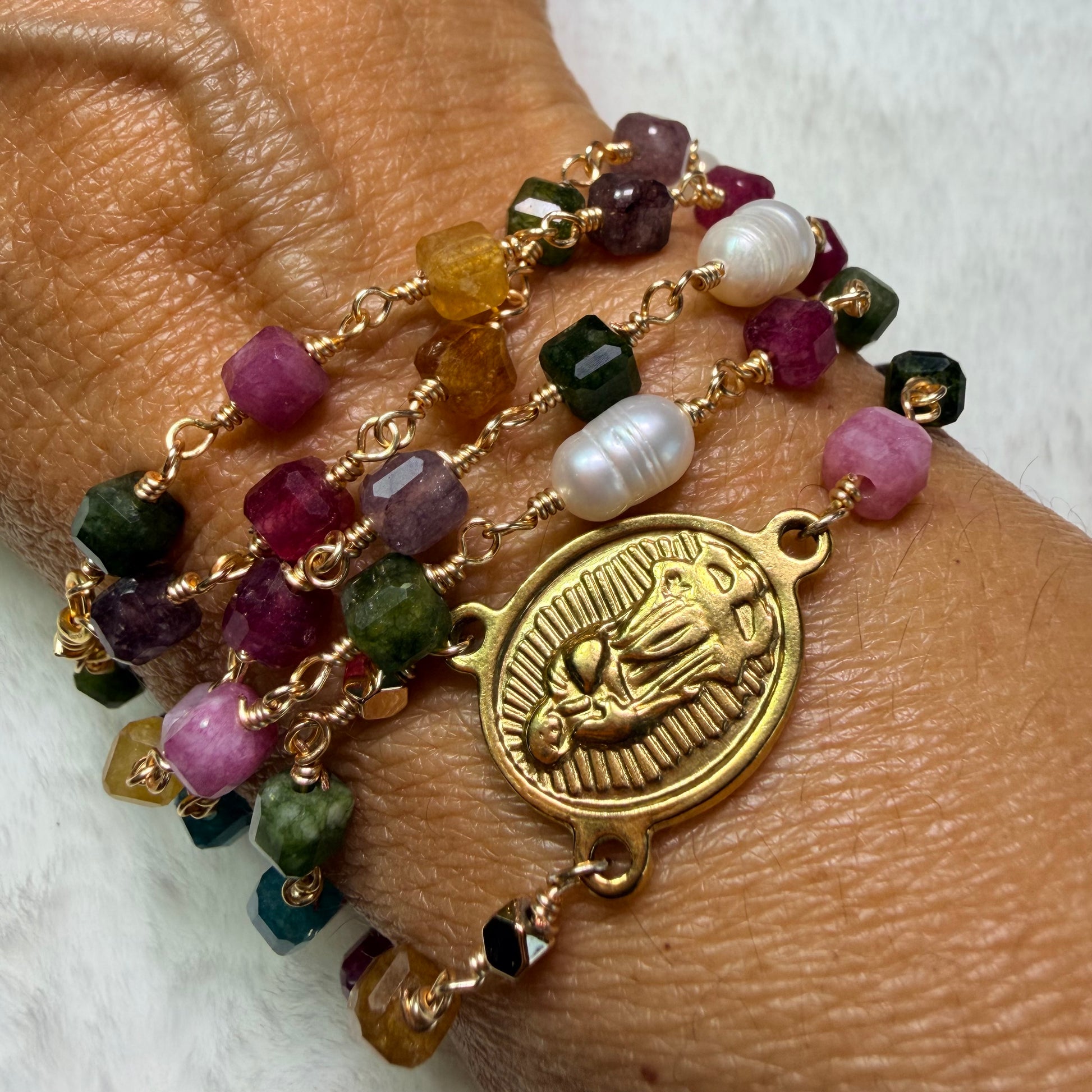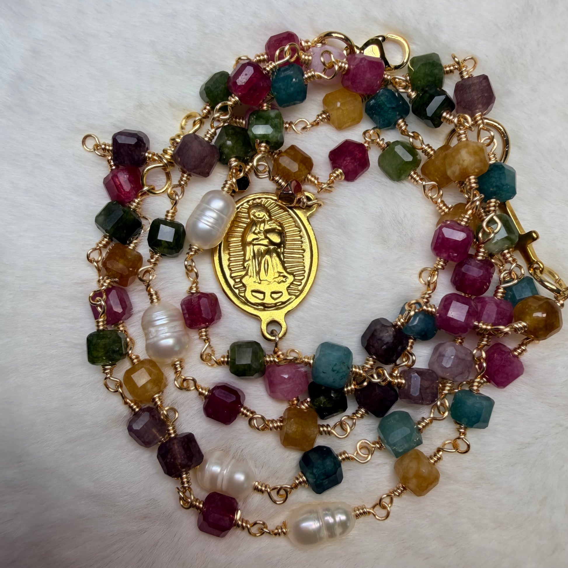 Los Padres Nuestros están representados con perlas naturales, aportando un contraste delicado y elegante, mientras que al centro lleva una medalla de la Virgen de Guadalupe, signo de amor, protección y cercanía maternal.
